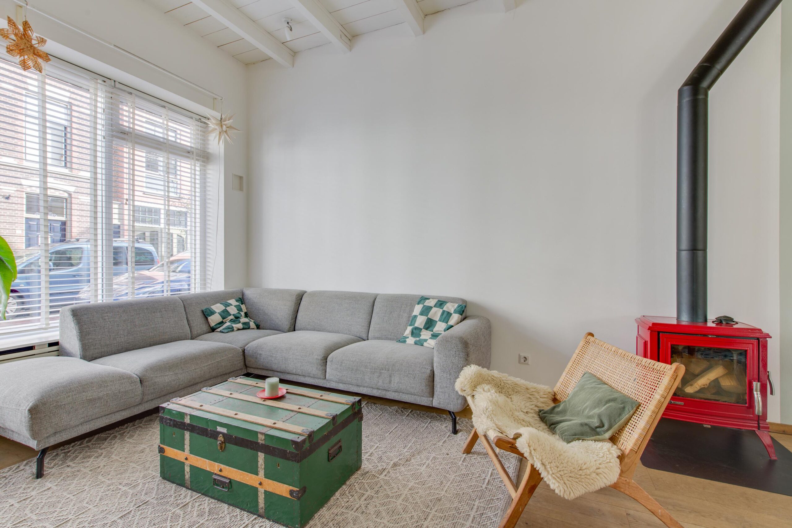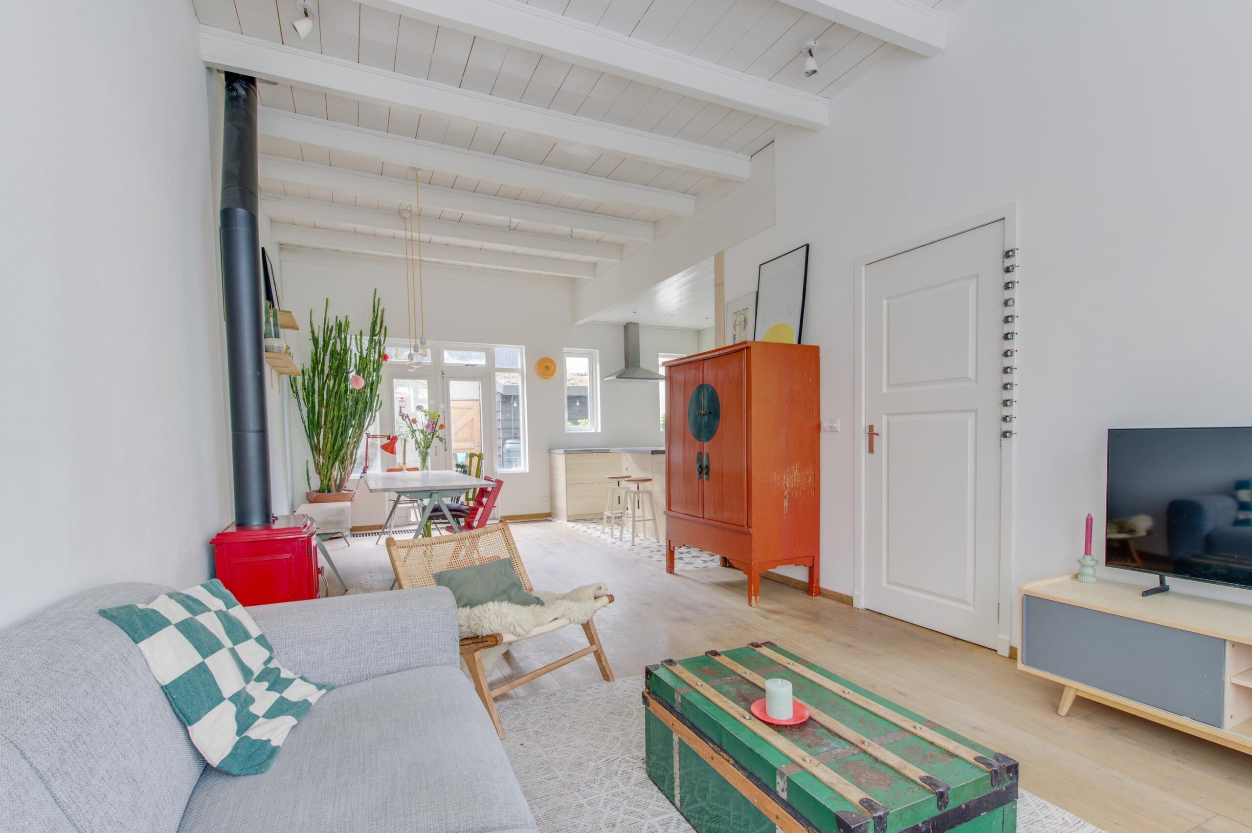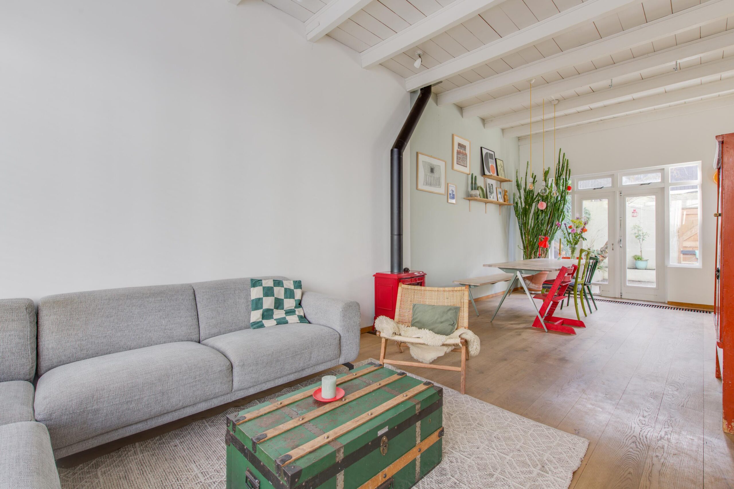 Via de ruime hal met toilet kom je binnen in de hoge en lichte woonkamer van circa 38m² met aansluitend een moderne open keuken. Er ligt een sfeervolle houten vloer en de houtkachel zorgt voor een authentiek en warm gevoel. Het hoge plafond met balken maakt de woning heerlijk licht. De keuken is modern en voorzien van een spoeleiland, groot gasfornuis met grote oven, kleine inbouw oven, afzuiging, koel vriescombinatie en een vaatwasser. Via de openslaande deuren betreed je de gezellige stadstuin, waar het binnenleven moeiteloos overgaat in het buitenleven.