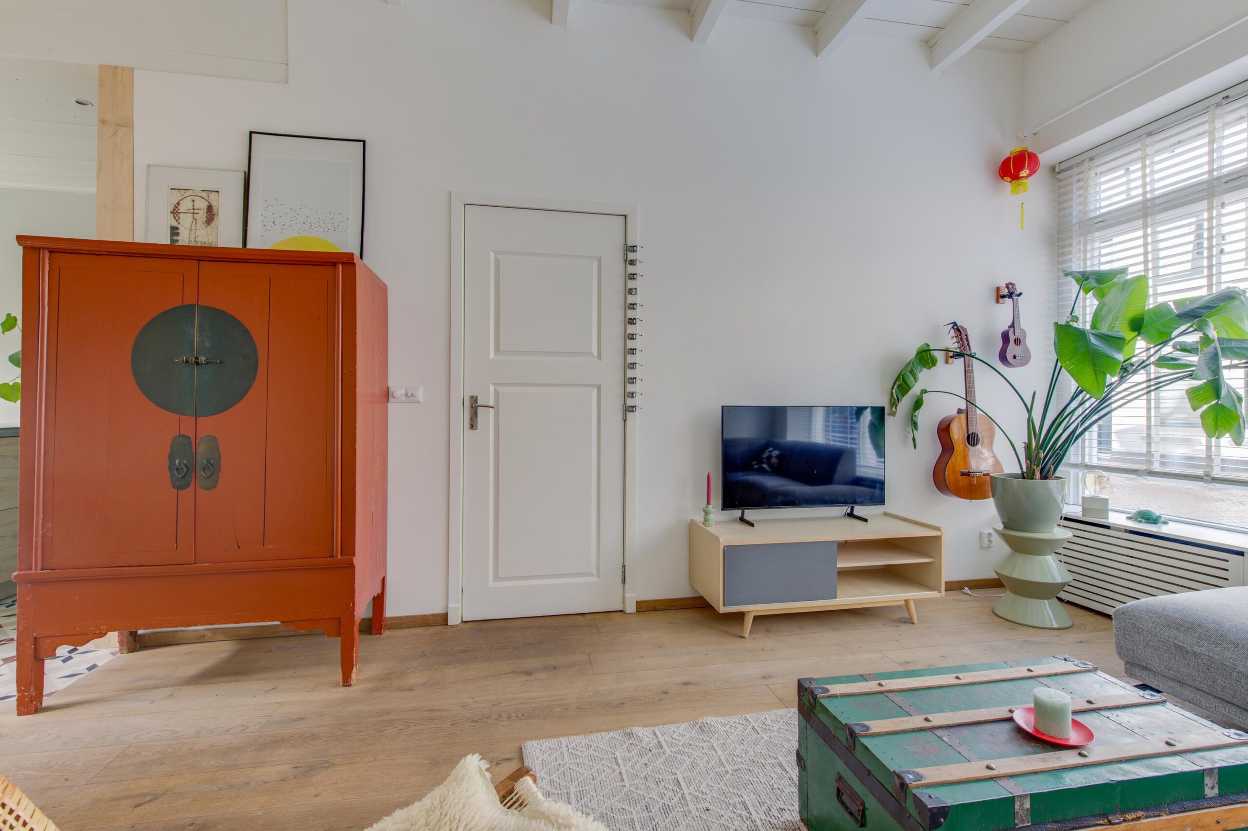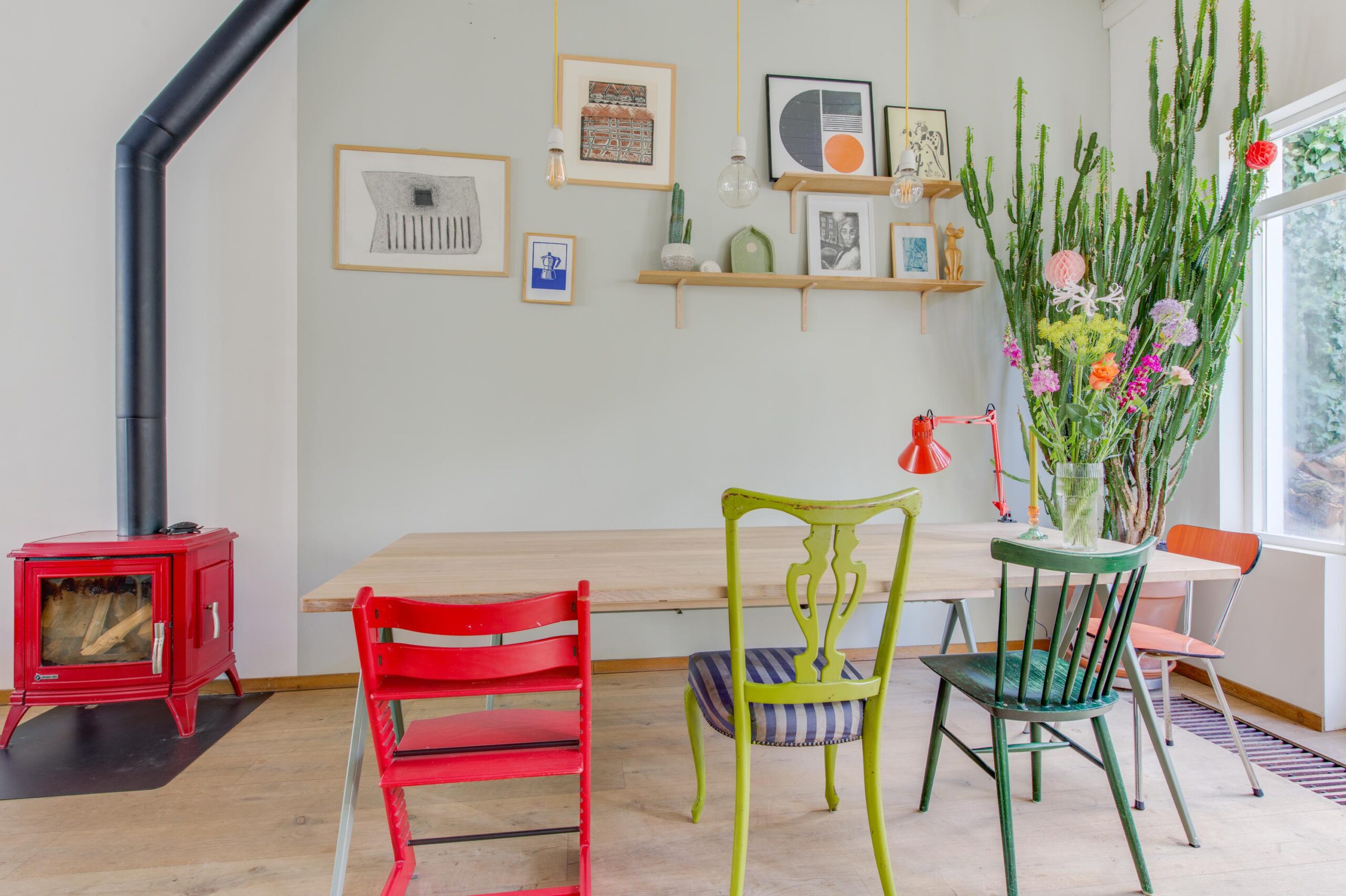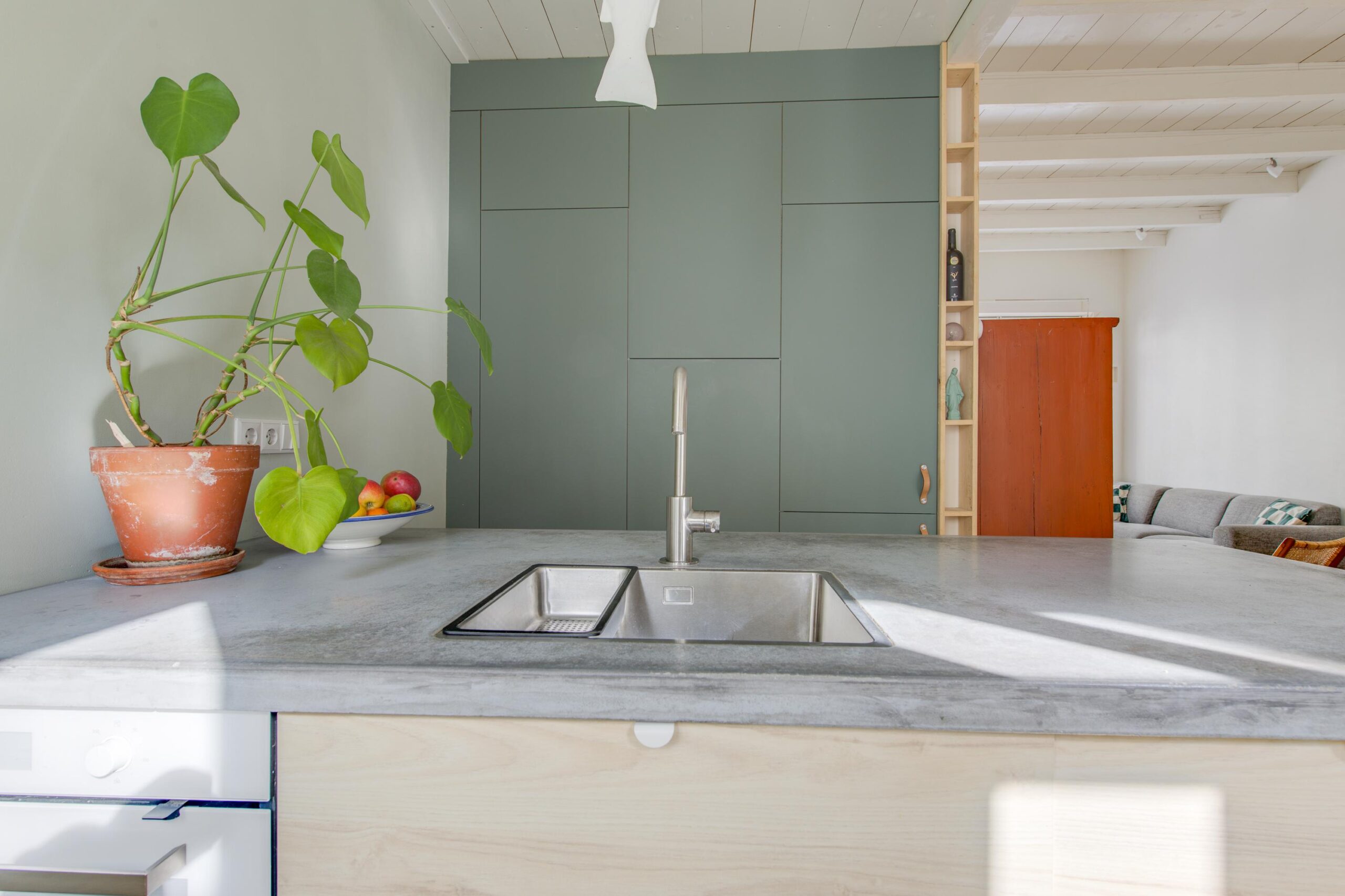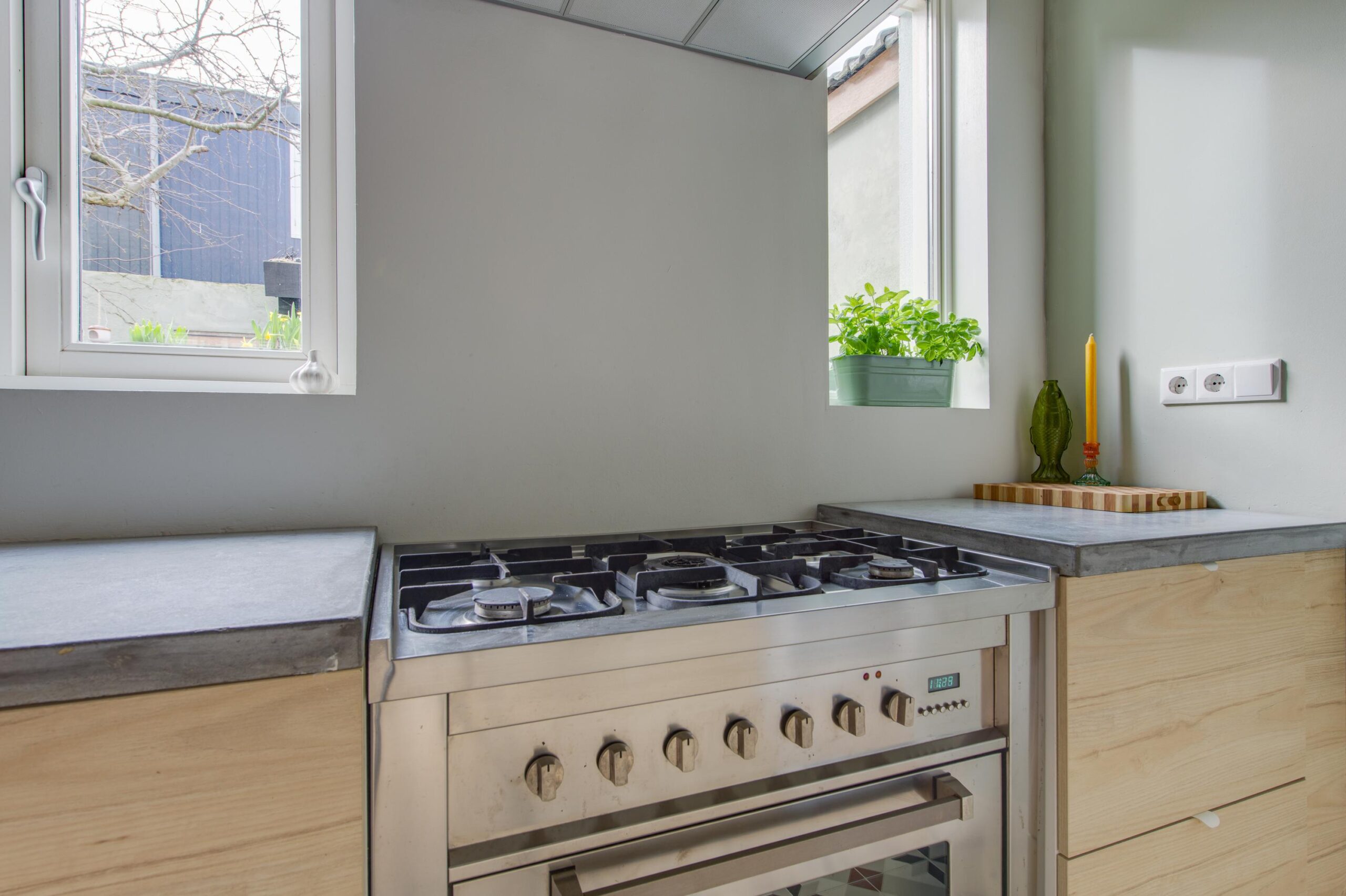 Via de ruime hal met toilet kom je binnen in de hoge en lichte woonkamer van circa 38m² met aansluitend een moderne open keuken. Er ligt een sfeervolle houten vloer en de houtkachel zorgt voor een authentiek en warm gevoel. Het hoge plafond met balken maakt de woning heerlijk licht. De keuken is modern en voorzien van een spoeleiland, groot gasfornuis met grote oven, kleine inbouw oven, afzuiging, koel vriescombinatie en een vaatwasser. Via de openslaande deuren betreed je de gezellige stadstuin, waar het binnenleven moeiteloos overgaat in het buitenleven.