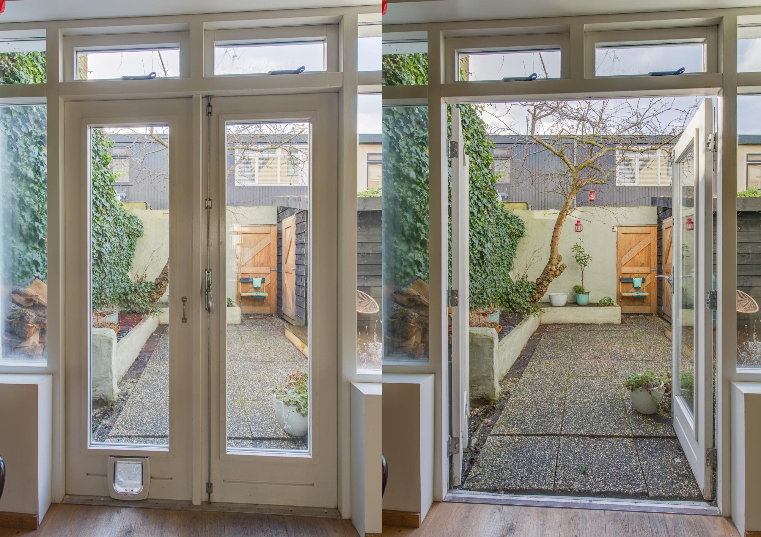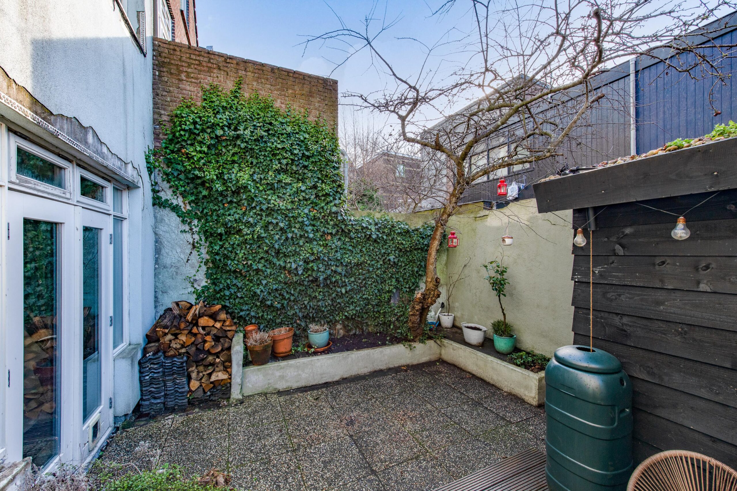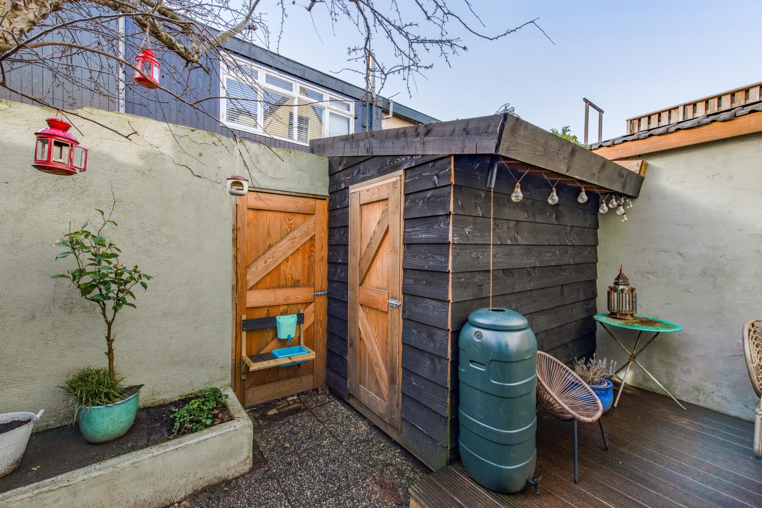 De circa 30 m² grote achtertuin op het zuidwesten is een heerlijke plek om volop van het buitenleven te genieten. In de lente en zomer zit je hier tot in de avondzon, terwijl de appelboom in het voorjaar prachtig roze bloeit en extra sfeer geeft aan de tuin. Achterin bevindt zich een praktisch schuurtje van circa 3 m², ideaal voor het stallen van fietsen en het opbergen van tuingereedschap.