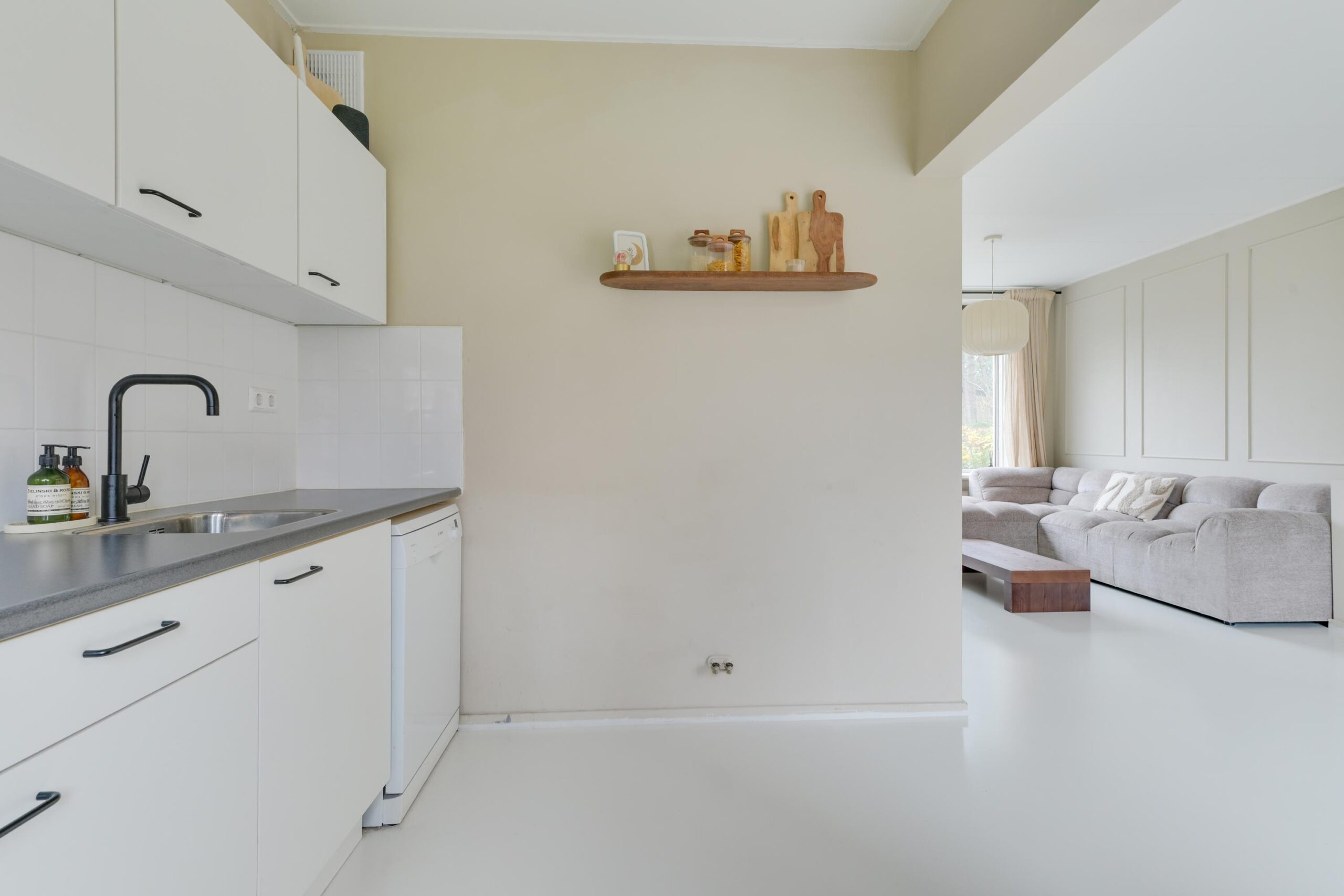 Via de entree komt u in de hal met een praktische trapkast. Vanuit de hal heeft u toegang tot het toilet met fonteintje en tot de lichte woonkamer, die dankzij de grote raampartijen een prettige sfeer heeft. De begane grond is afgewerkt met een strakke gietvloer, wat zorgt voor een moderne uitstraling. De nette keuken is voorzien van diverse inbouwapparatuur en biedt direct toegang tot de achterzijde van de woning. Vanuit hier bereikt u de overdekte buitenruimte en de ruime, aangebouwde garage van circa 19 m².