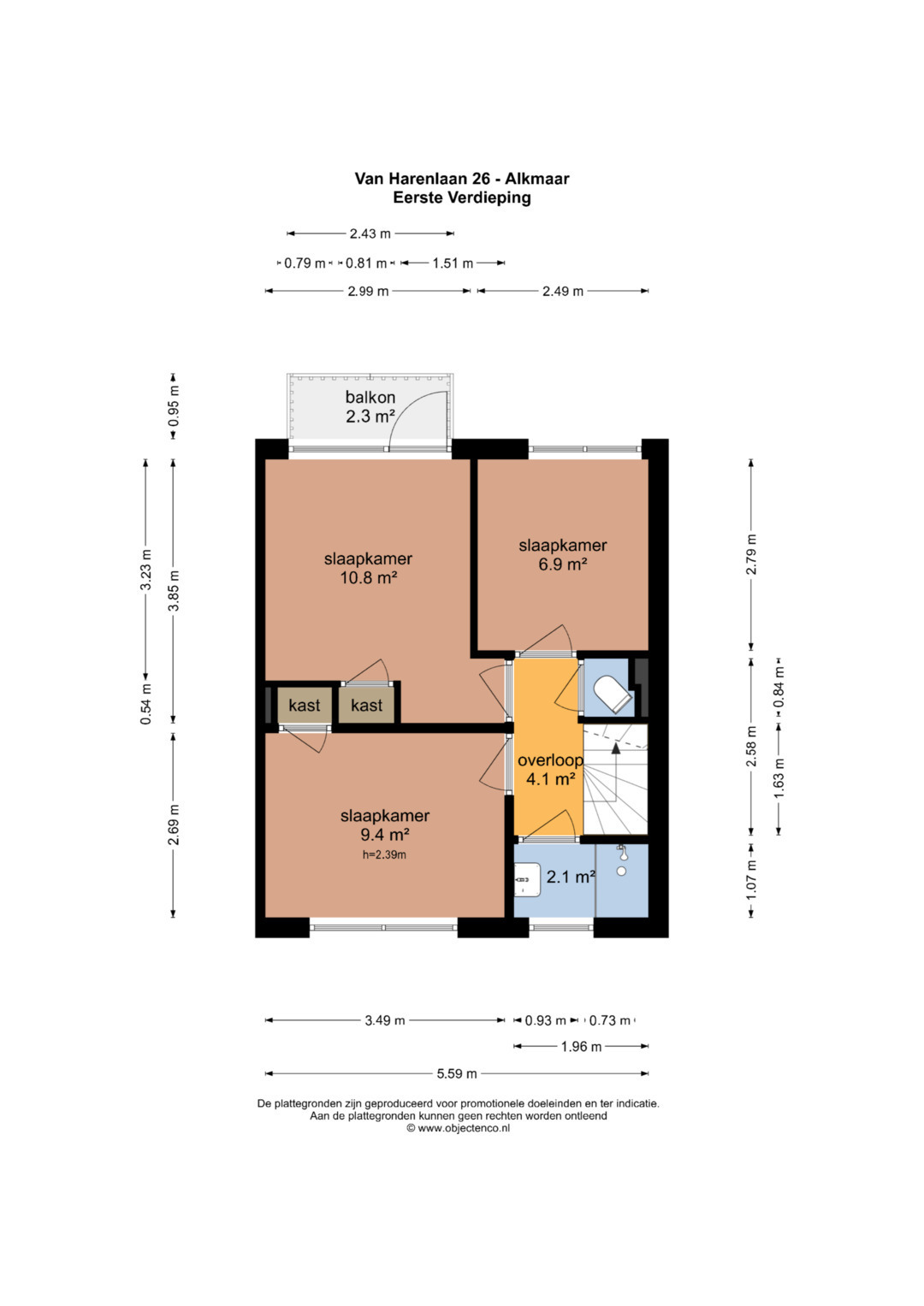 Op de eerste verdieping bevinden zich drie slaapkamers (respectievelijk 11 m², 9 m² en 7 m²) van goed formaat, die flexibel in te richten zijn als slaap-, werk- of hobbykamer. Eén van de slaapkamers geeft toegang tot een balkon met uitzicht over de achtertuin. Daarnaast beschikt deze verdieping over een separaat toilet en een badkamer voorzien van een douche en wastafel.