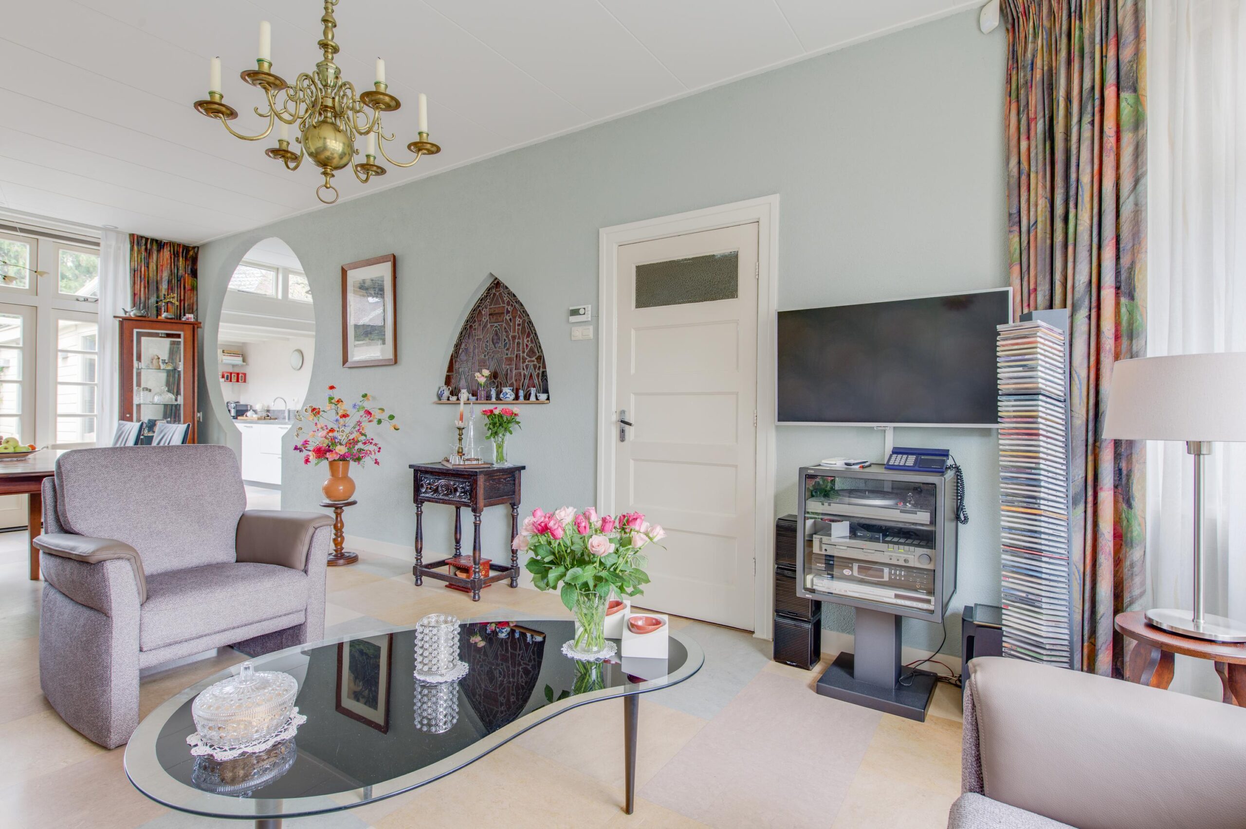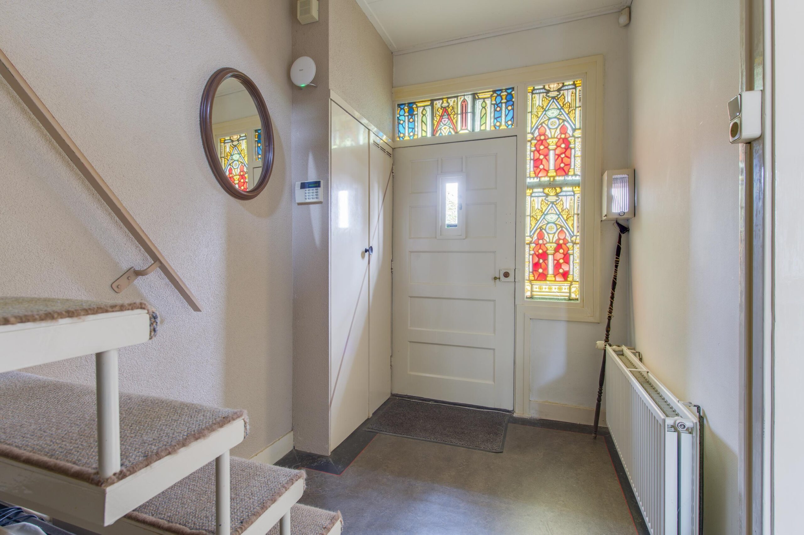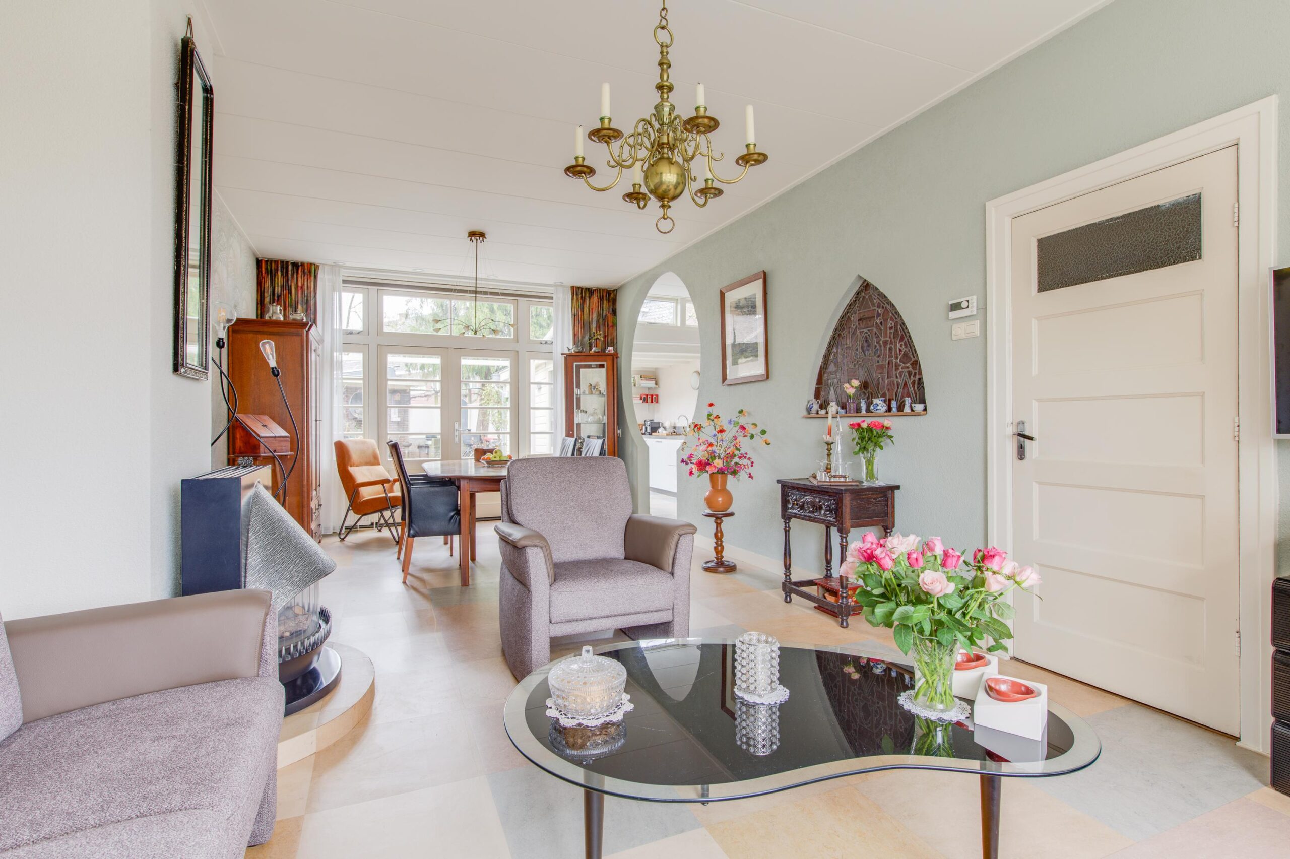 Via de entree kom je in de hal met meterkast, modern toilet met fonteintje en trapopgang. De ruime woonkamer van circa 32 m² voelt direct comfortabel aan. Aan de voorzijde bevindt zich de royale zithoek met erker en sfeervolle gashaard. De glas in lood en gebrandschilderde ramen geven het geheel een authentiek karakter.