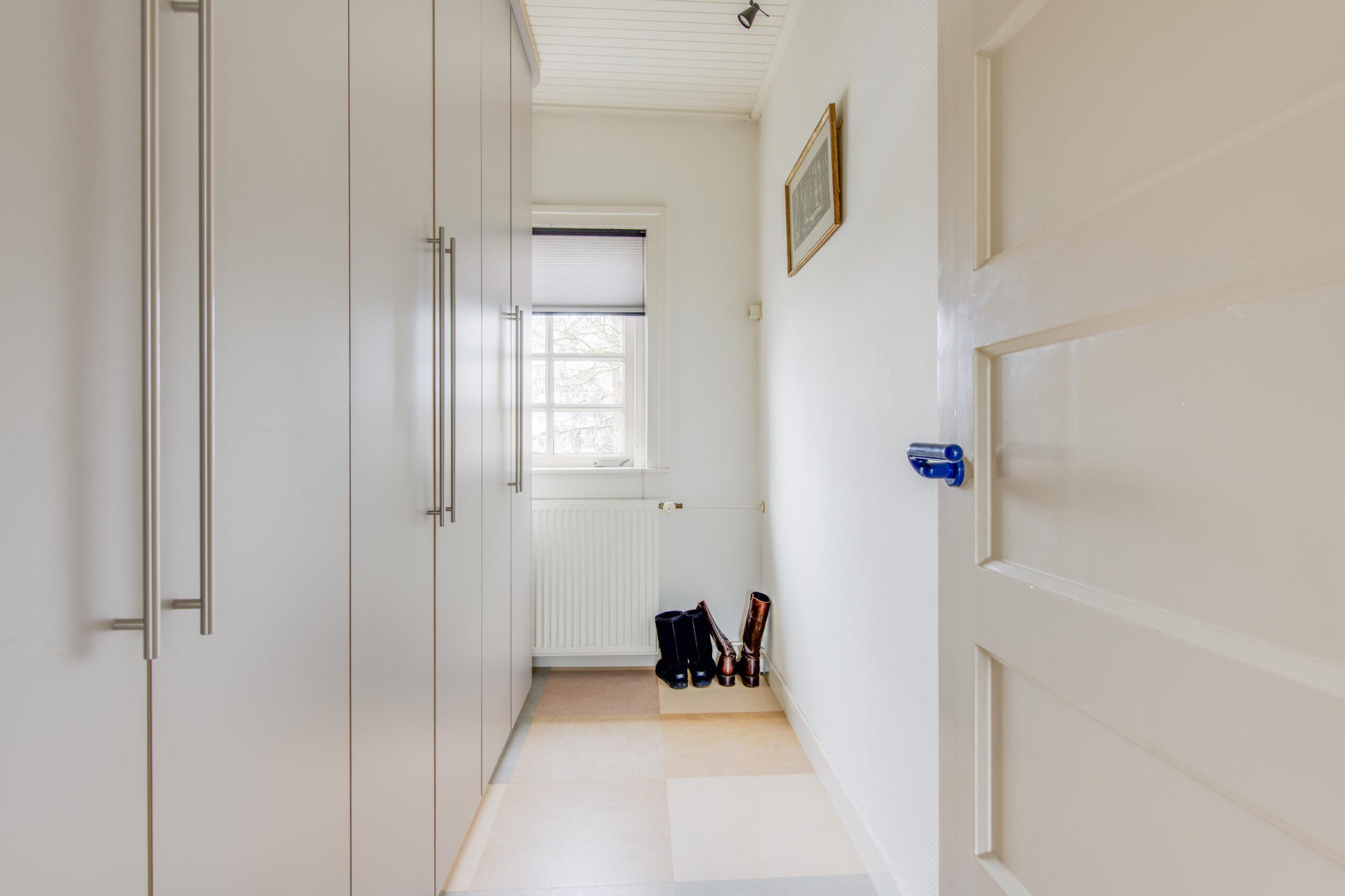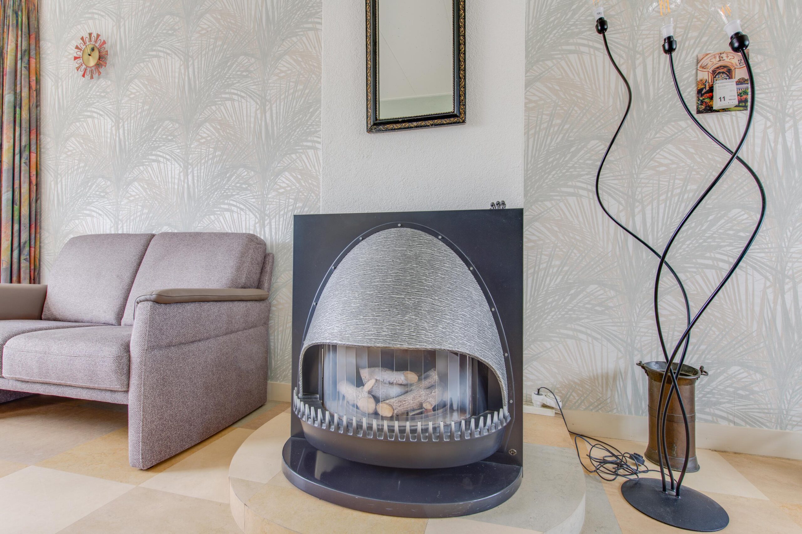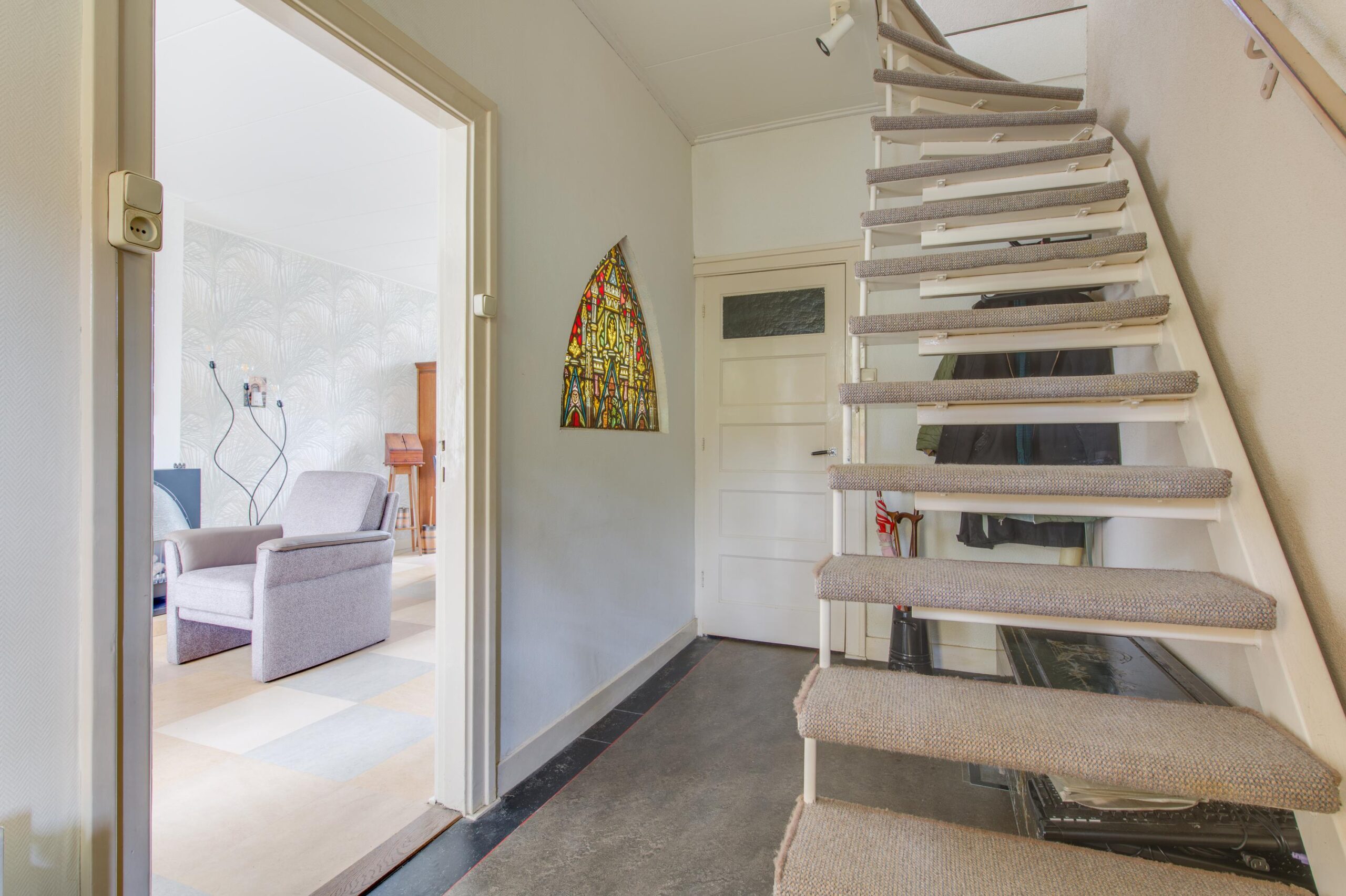 Via de entree kom je in de hal met meterkast, modern toilet met fonteintje en trapopgang. De ruime woonkamer van circa 32 m² voelt direct comfortabel aan. Aan de voorzijde bevindt zich de royale zithoek met erker en sfeervolle gashaard. De glas in lood en gebrandschilderde ramen geven het geheel een authentiek karakter.