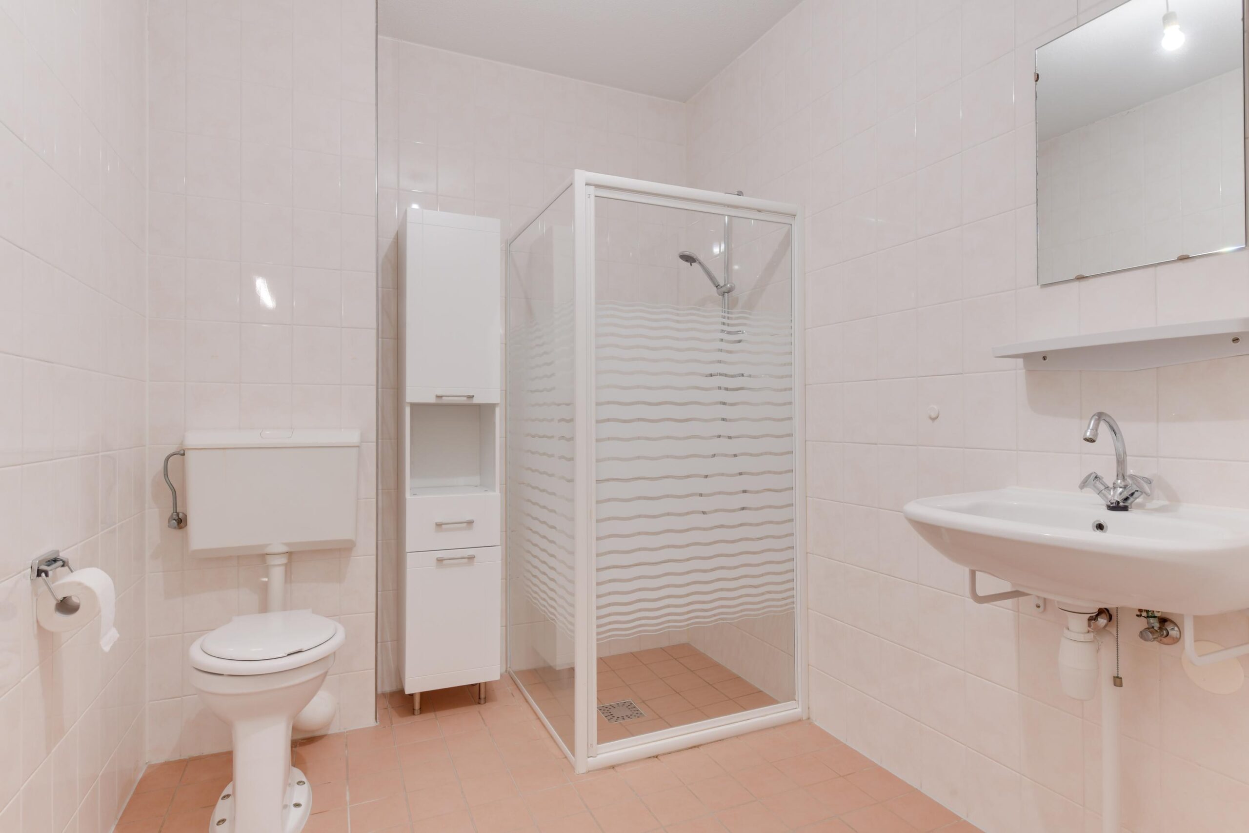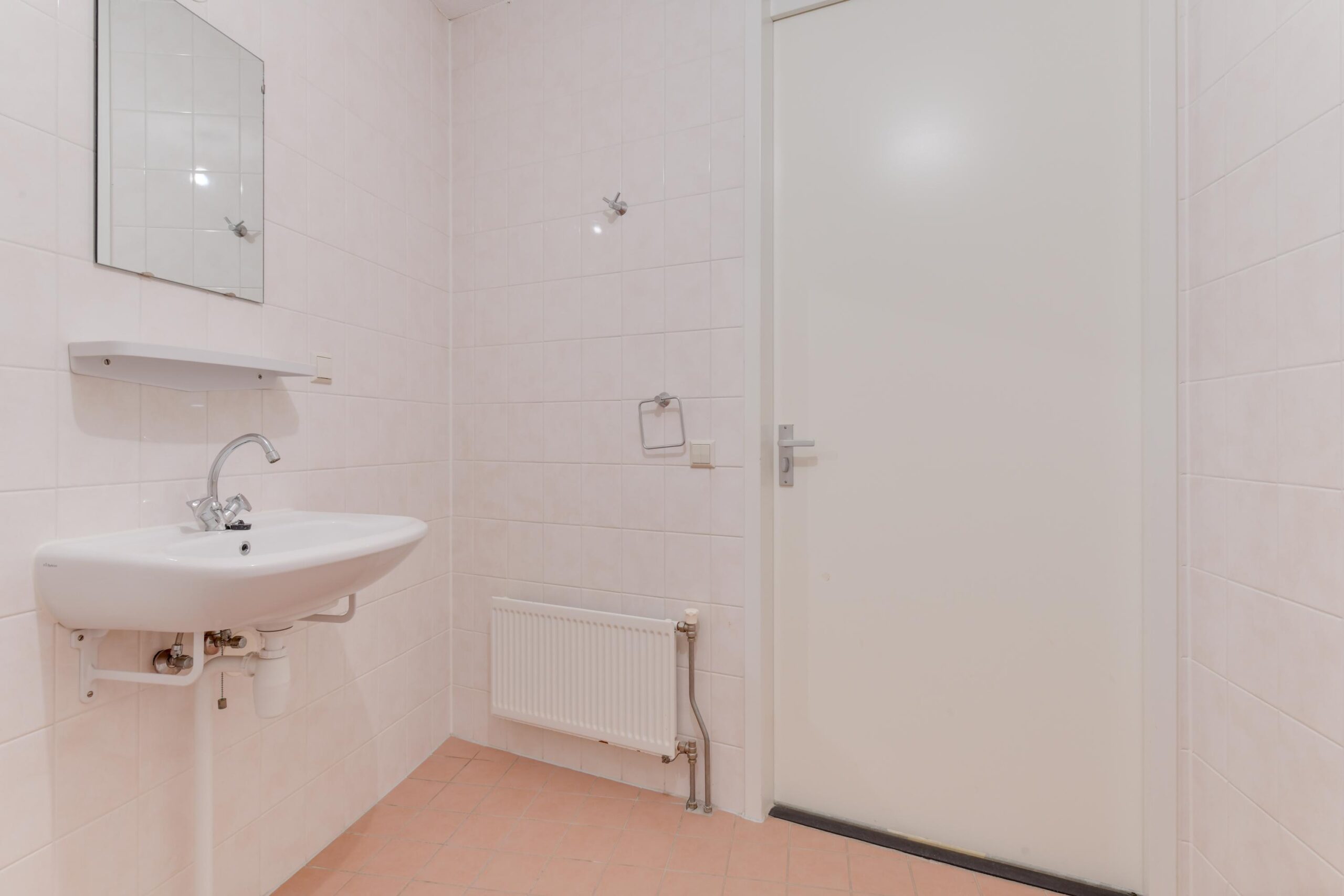 Vanuit de gang heeft u toegang tot de badkamer (ca. 6 m²) welke is voorzien van een douche, 2e toilet en een wastafel met spiegel en planchet.