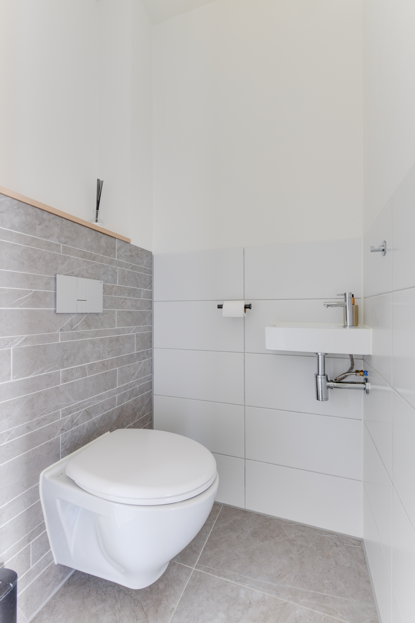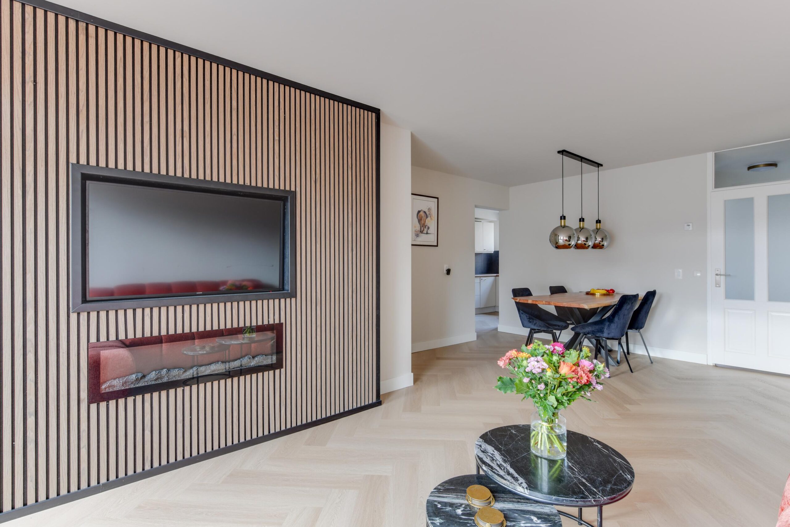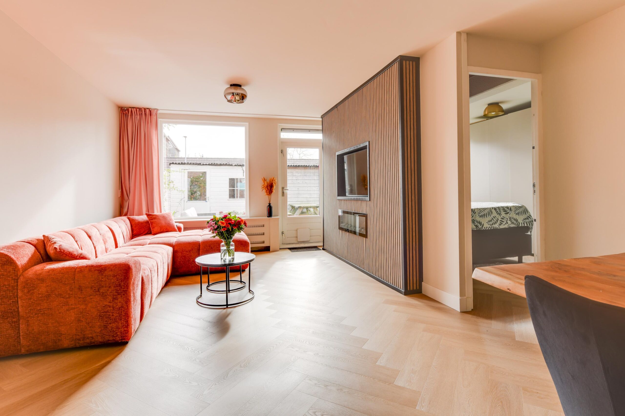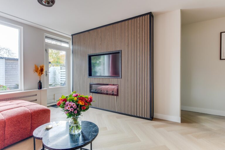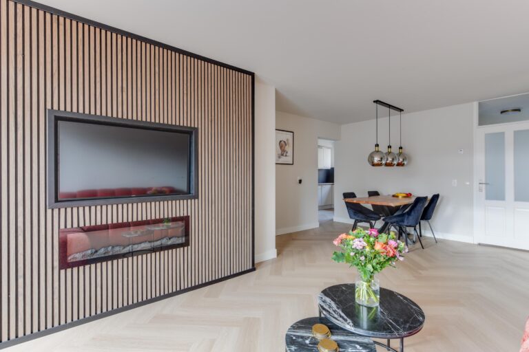Via de hal bereikt u het toilet, een slaapkamer van ca. 7 m² en de lichte, ruime woonkamer van ca. 26 m². De woonkamer is strak afgewerkt met glad gestucte wanden, hoge plinten en een stijlvolle pvc-visgraatvloer. De elektrische haard zorgt voor extra sfeer tijdens de koude maanden.