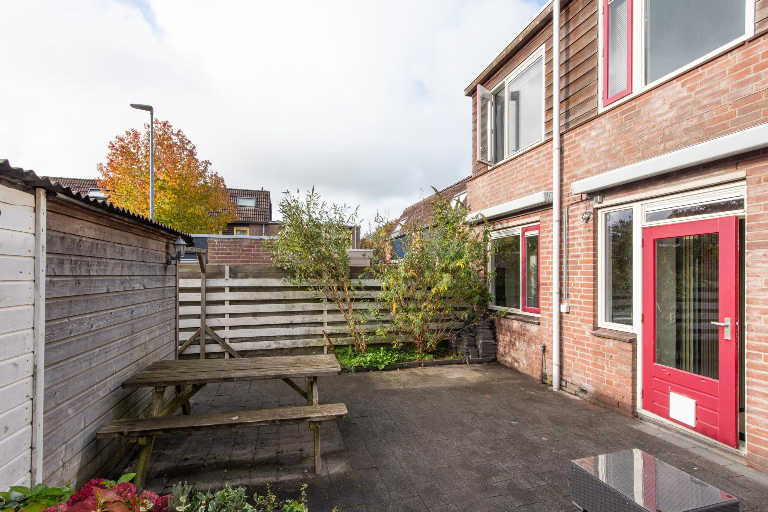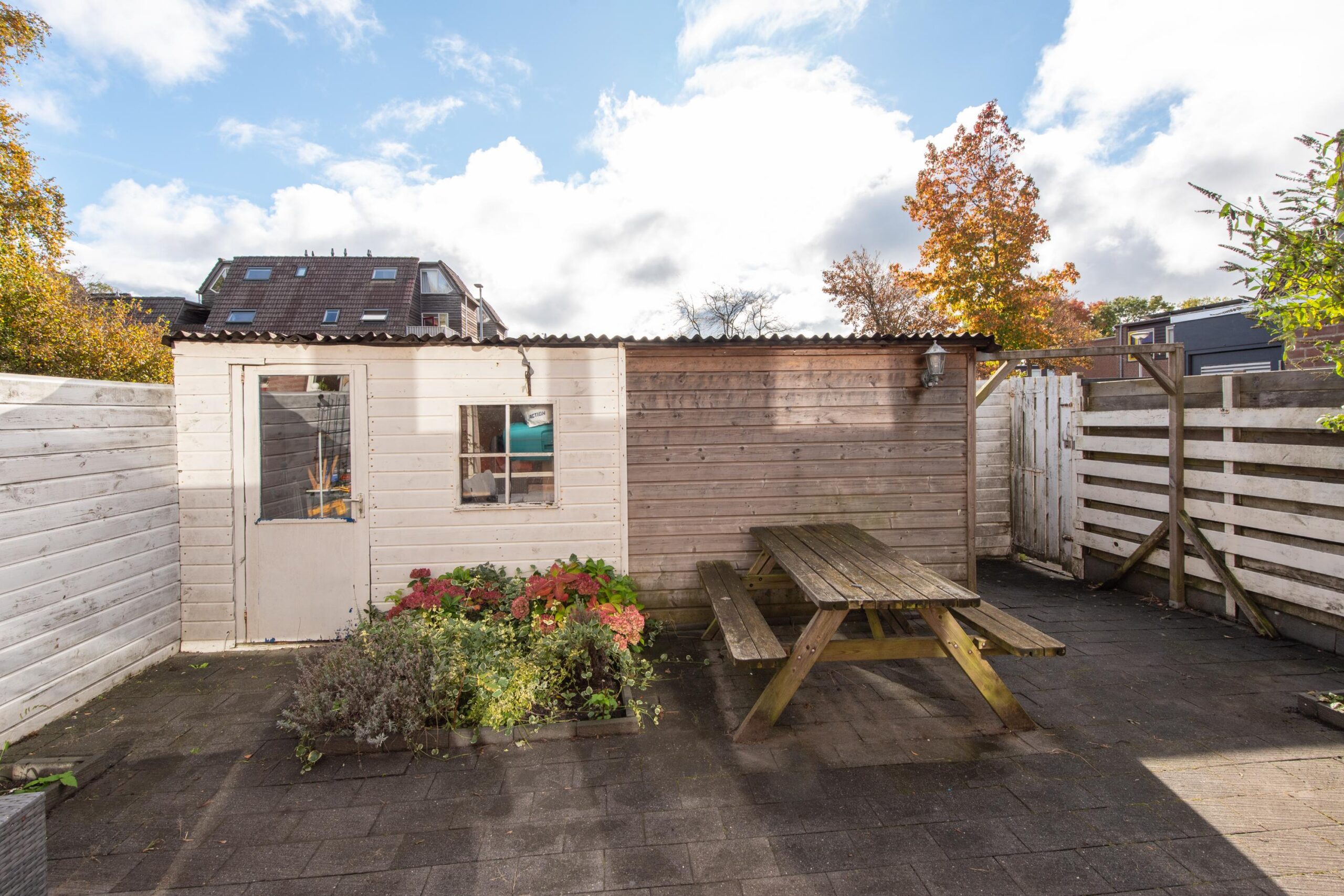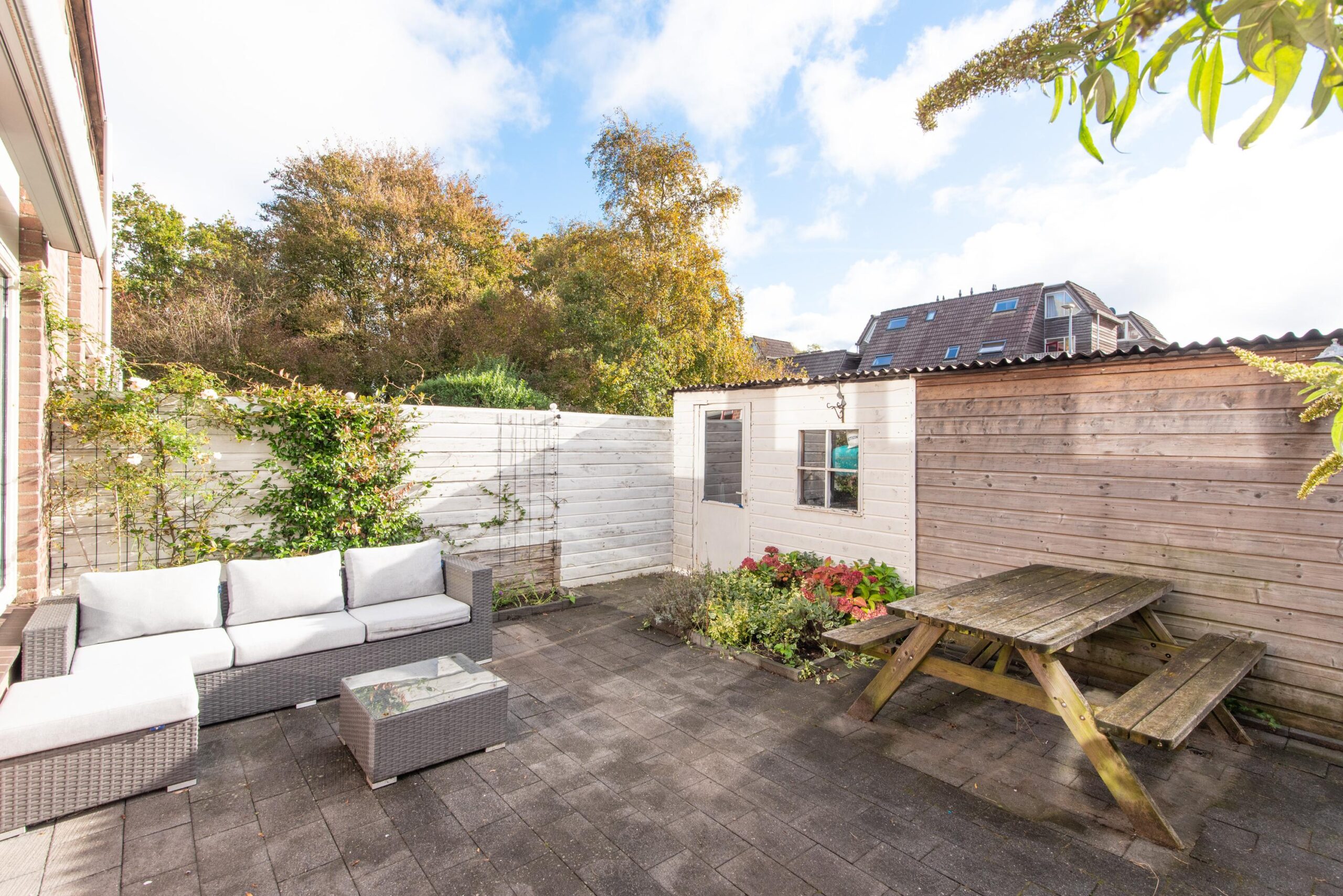 Via de woonkamer stapt u zo de ruime en onderhoudsvriendelijke tuin in, gelegen op het zuidoosten. Dankzij de ligging geniet u hier de hele dag van de zon. De tuin beschikt over een achterom en twee ruime houten bergingen voor extra opslag. Op warme dagen zorgen de zonneschermen voor een fijn plekje in de schaduw.