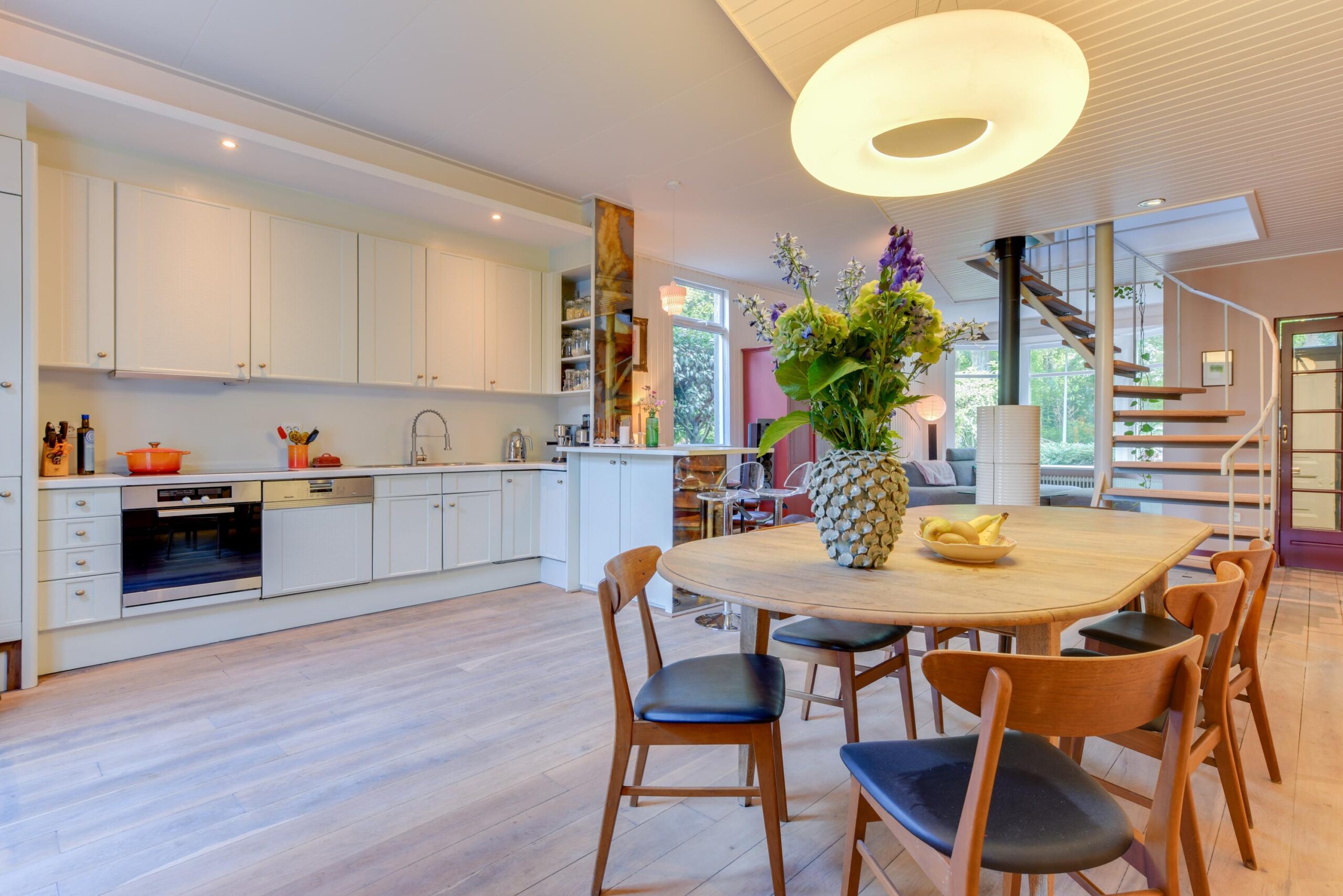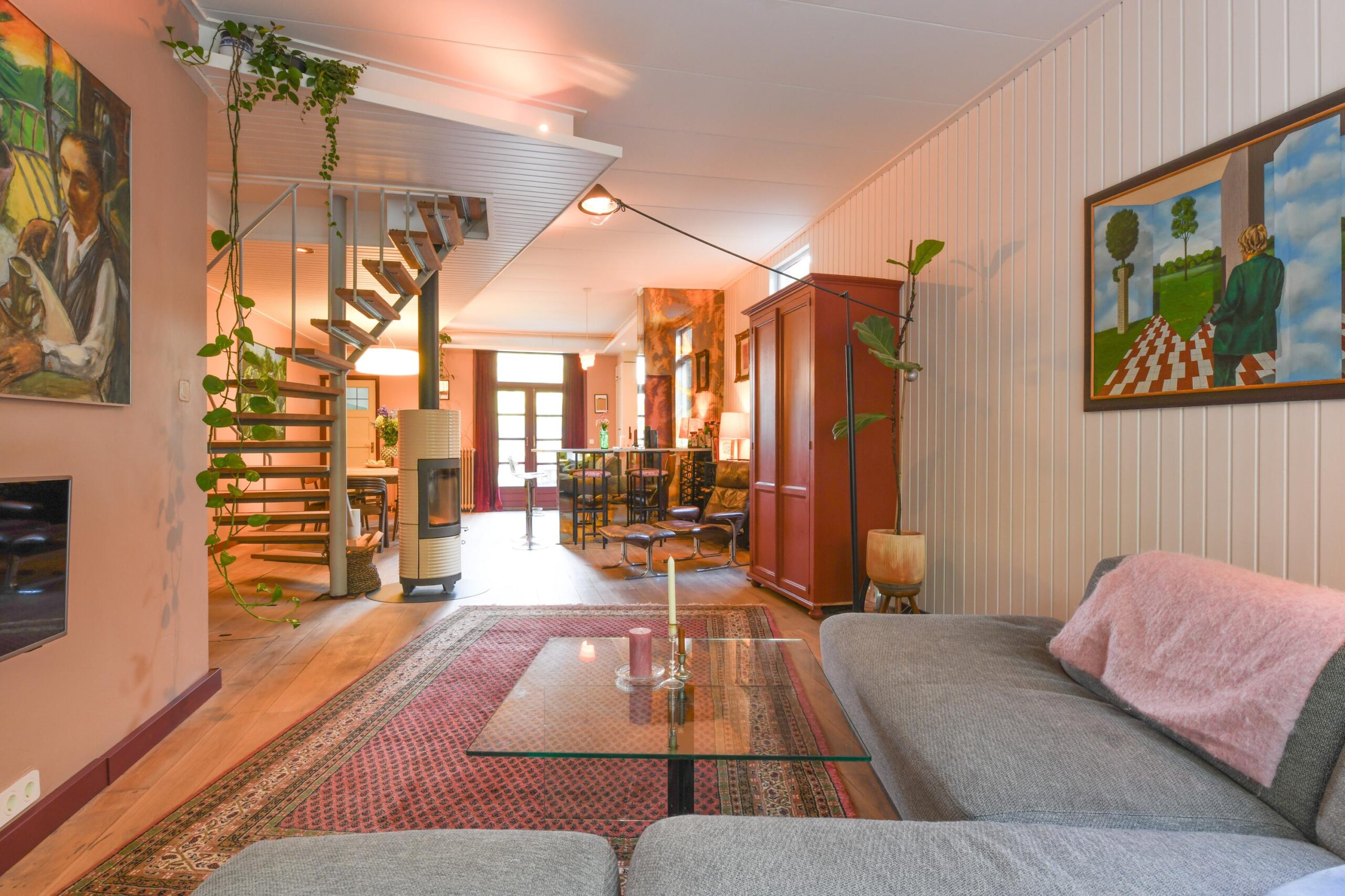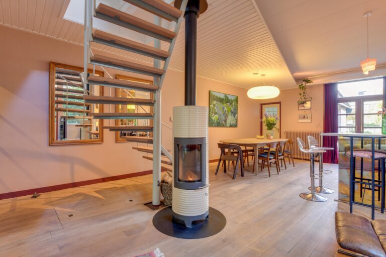 Zodra je binnenkomt, valt het gevoel van ruimte op. De royale woonkamer met sfeervolle erker en een vrijstaande haard ademt karakter. De woning is aan de achterzijde uitgebouwd, waardoor er een heerlijke leefruimte is ontstaan met plek voor een grote eettafel. De open keuken sluit hier perfect op aan – ruim en praktisch ingedeeld en voorzien van inbouwapparatuur. Via de openslaande deuren loop je zo de tuin in.