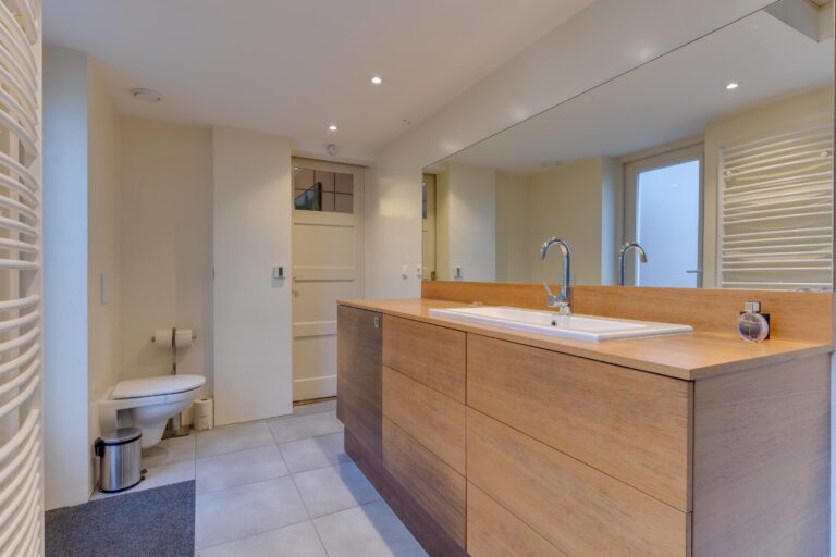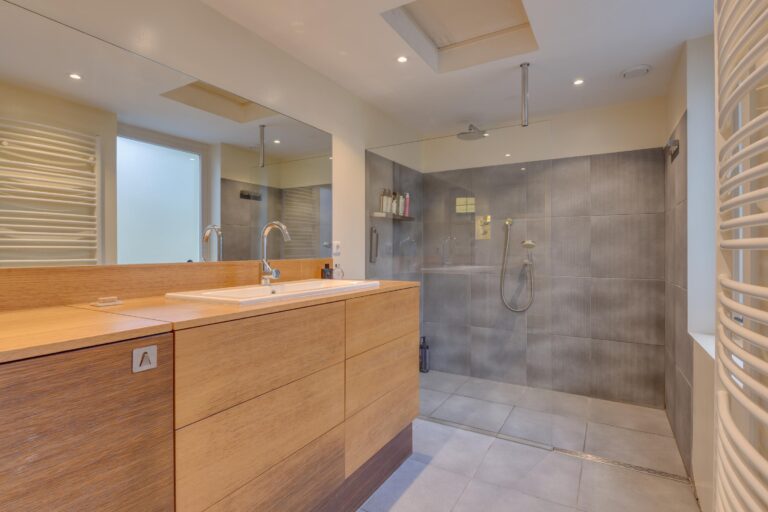 De badkamer bevindt zich ook op de begane grond en is modern uitgevoerd met een inloopdouche, wastafelmeubel, toilet en vloerverwarming. Boven de badkamer bevindt zich ook nog een vliering, hier hangt de cv-ketel en mechanische ventilatiebox.