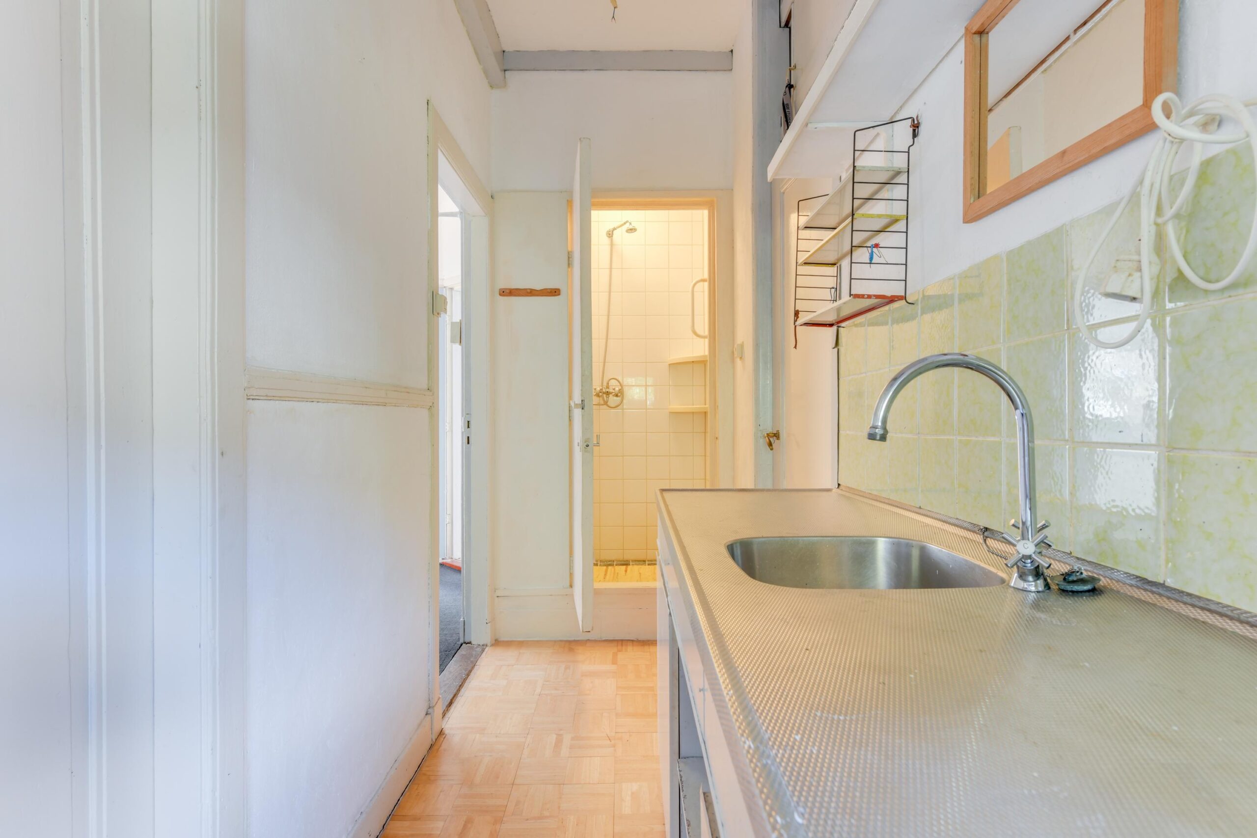 The first floor has many authentic details. Here you willl find a second living room (approx. 17 m²) and a dining room (approx. 16 m²), with French doors leading to a charming balcony overlooking the from garden. There is also a second toilet, an additional kitchen, and two bedrooms (approx. 8.5 and 5.5 m²), both with their own washbasin. This floor also provides access to a balcony overlooking the rear garden.