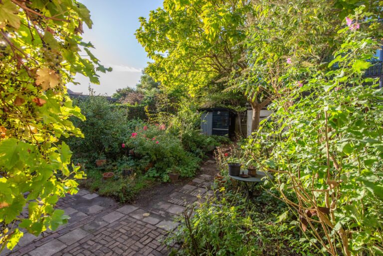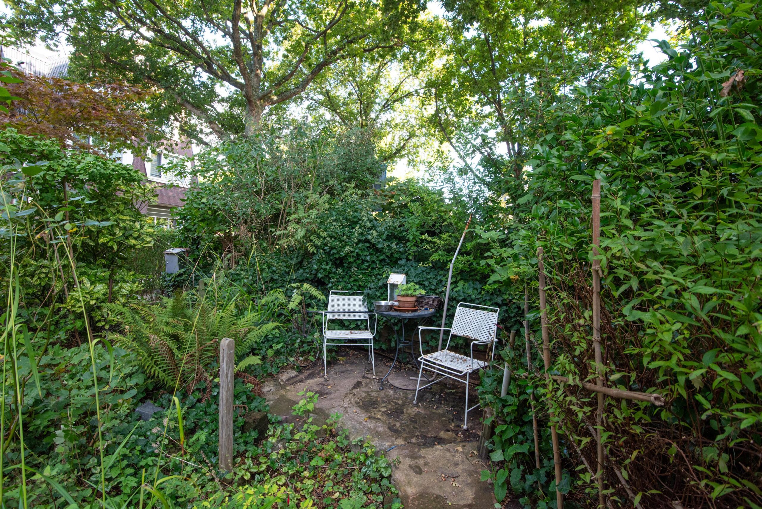 The lush garden to the front and back of the house offers plenty of privacy, several seating areas, and two sheds. There are several seating areas where you can enjoy the sun or relax in the shade.