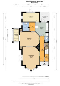 Via de entree komt u in een ruime hal met toilet. De houten vloer en de indeling verwijzen naar de jaren ’20, en zetten meteen de toon voor de sfeer van het huis. De woonkamer (ca. 19,5 m²) en de aangrenzende eetkamer (ca. 16 m²) vormen samen een fijne leefruimte. Vanuit de eetkamer loopt u door naar de charmante tuinkas, waar binnen en buiten elkaar ontmoeten, ook komt u via de eetkamer uit in de badkamer met douche en wastafel. De keuken (ca. 10 m²) is eenvoudig uitgevoerd. Aan de achterzijde bevindt zich een lichte tuinkamer (ca. 8,5 m²), met daarnaast een overkapping die vanuit de keuken bereikbaar is. Dit is een plek met veel potentie, die met enige modernisering een heerlijke woonverdieping kan worden.