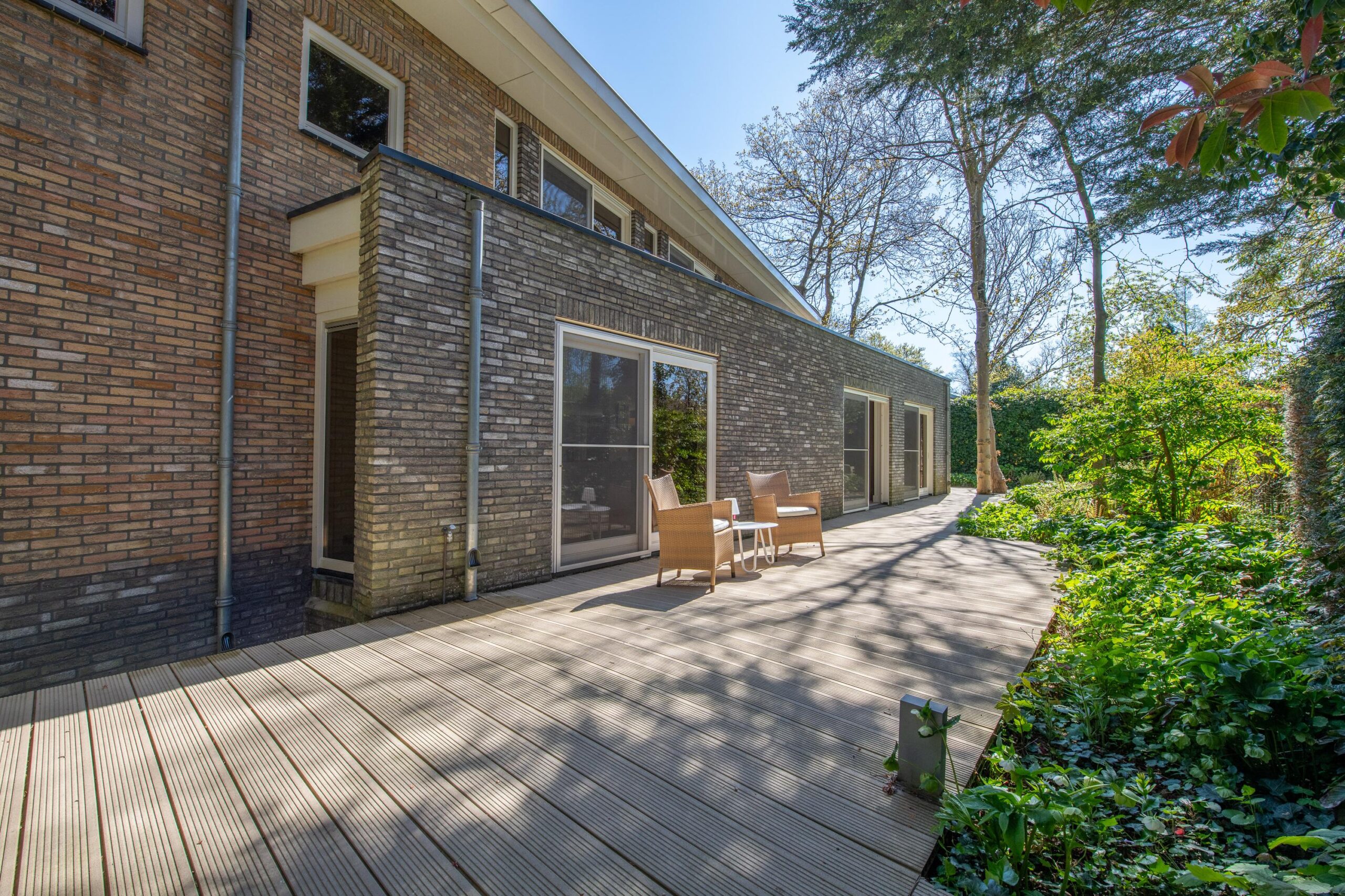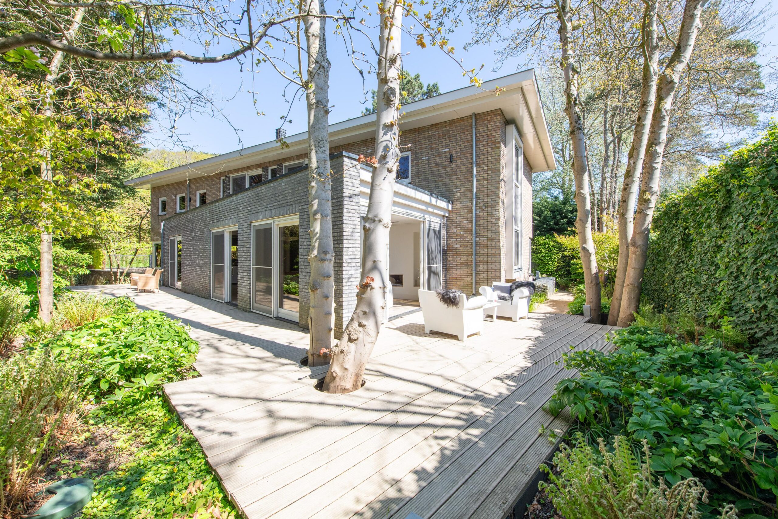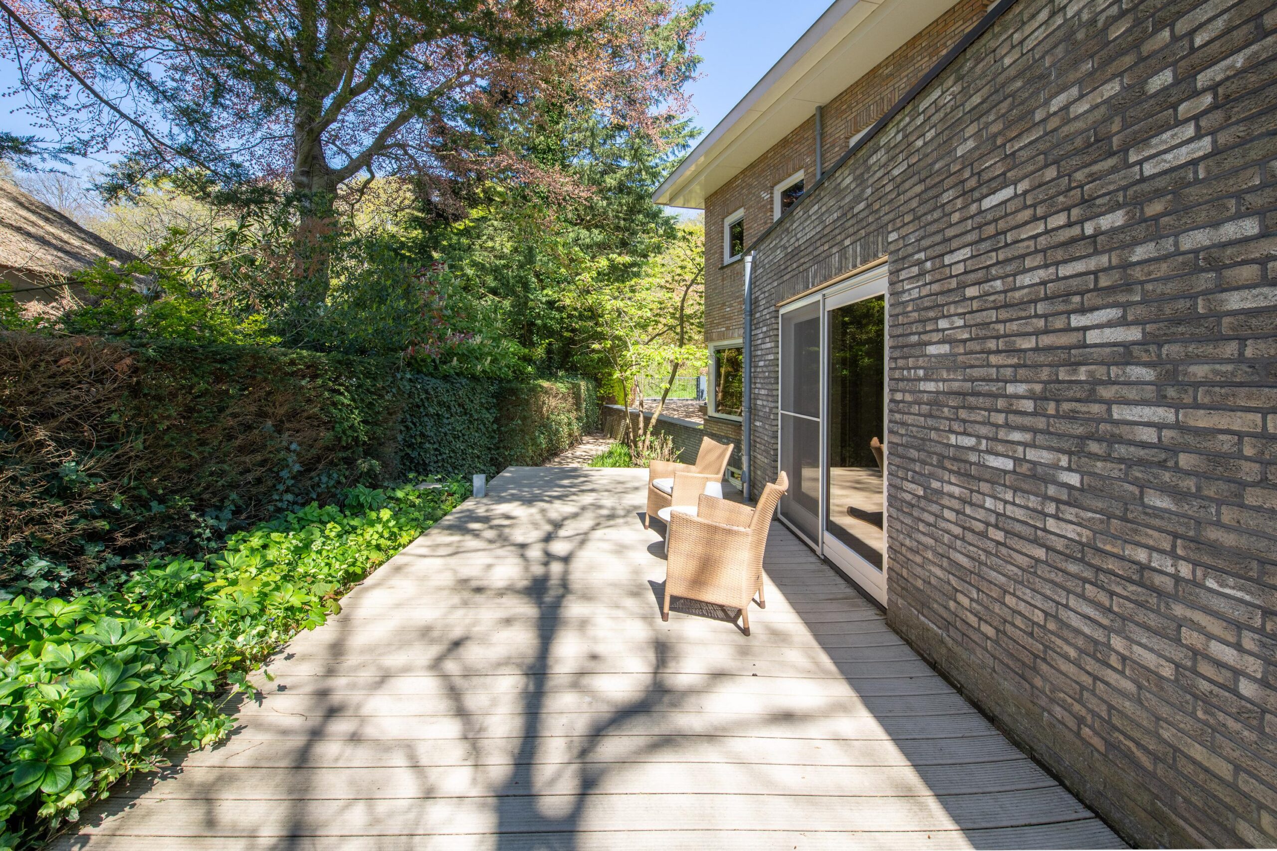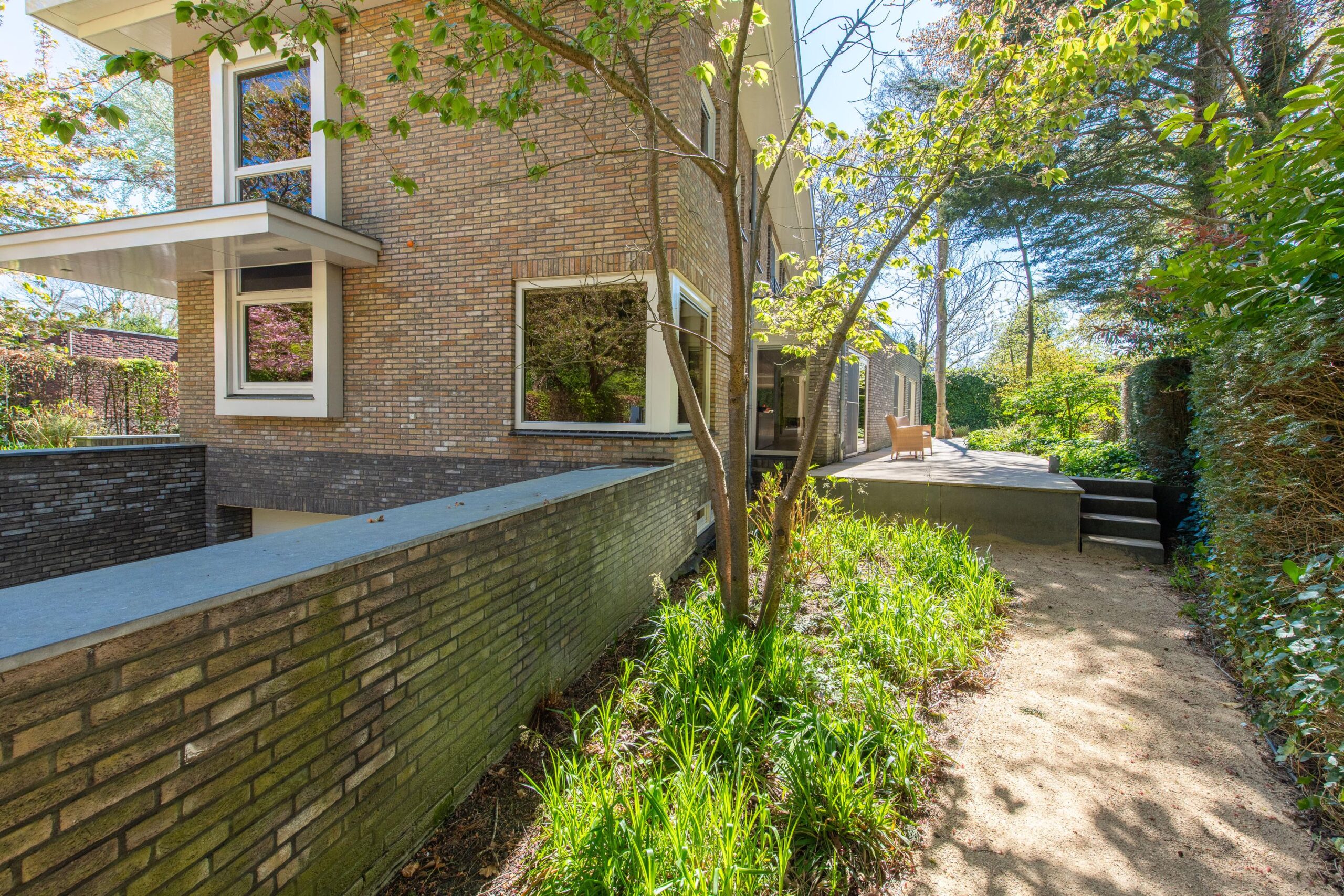 De zorgvuldig aangelegde tuin rondom de villa biedt optimale privacy en meerdere zon- en schaduwterrassen. Hier geniet u op elk moment van de dag van rust, natuur en groen. Of u nu een kop koffie drinkt onder de bomen, dineert met vrienden of simpelweg ontspant na een dag werken – dit is een buitenruimte die leeft.