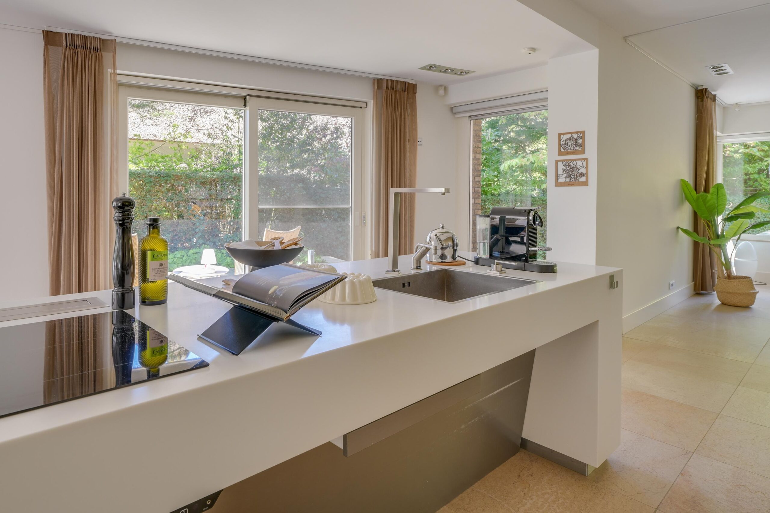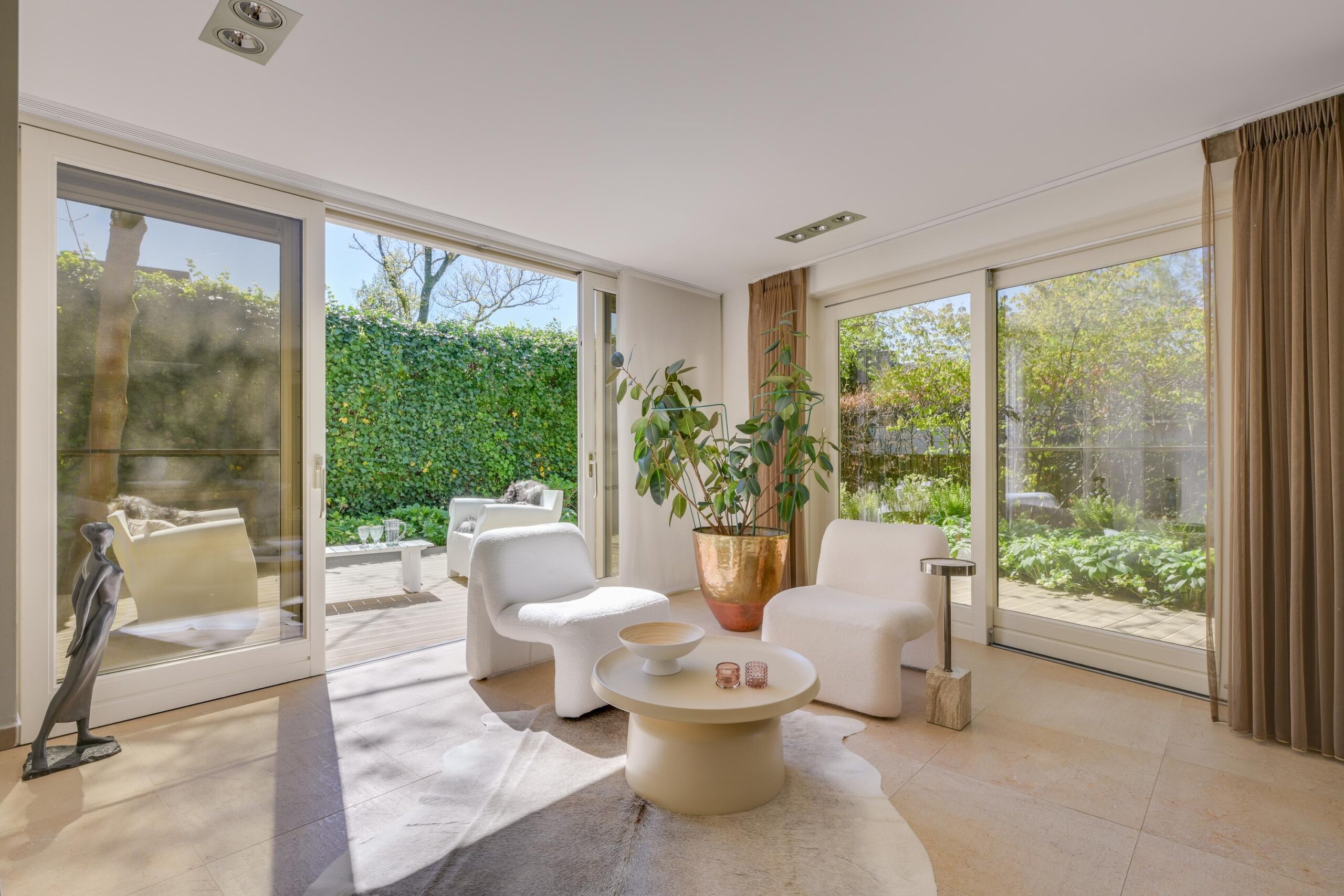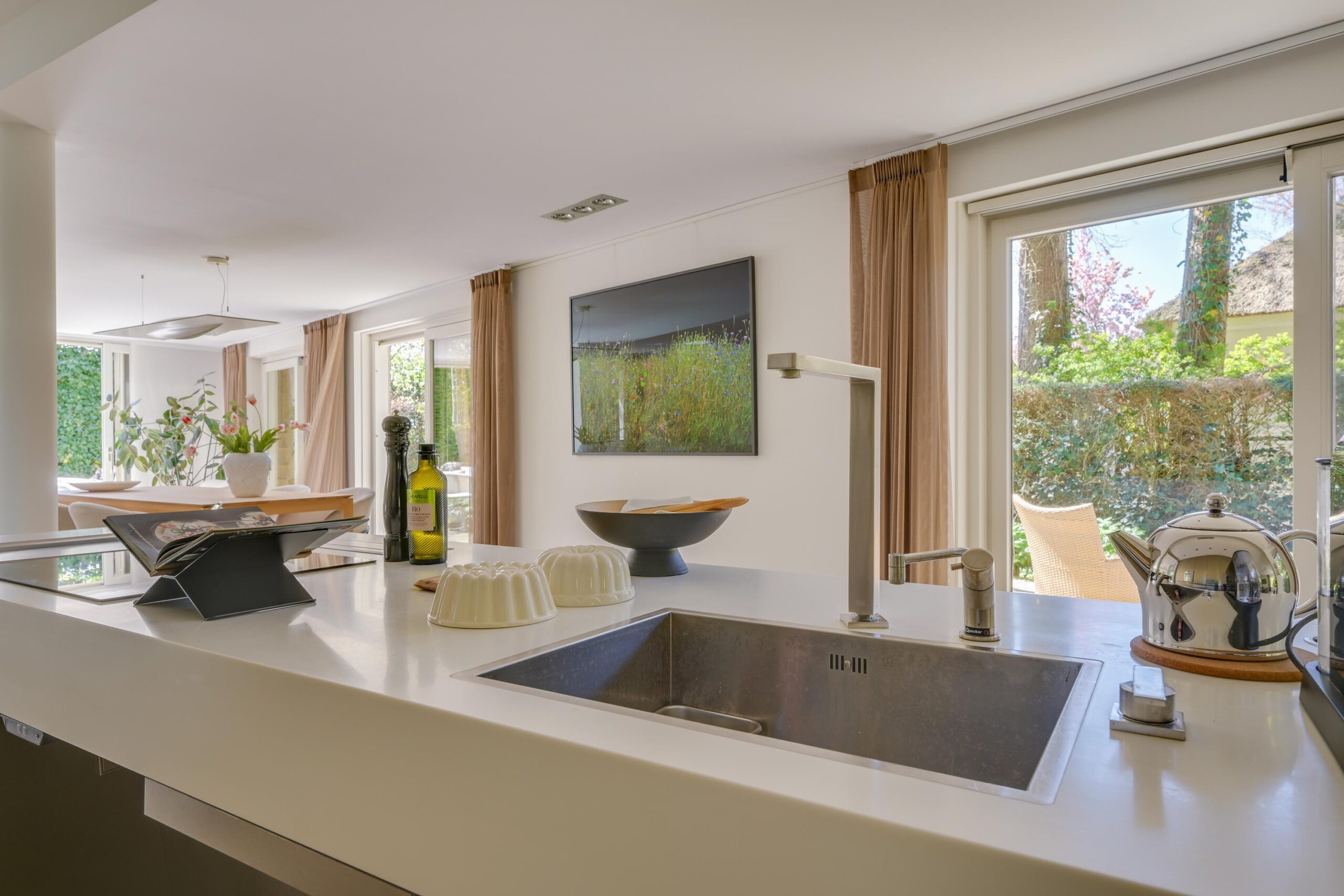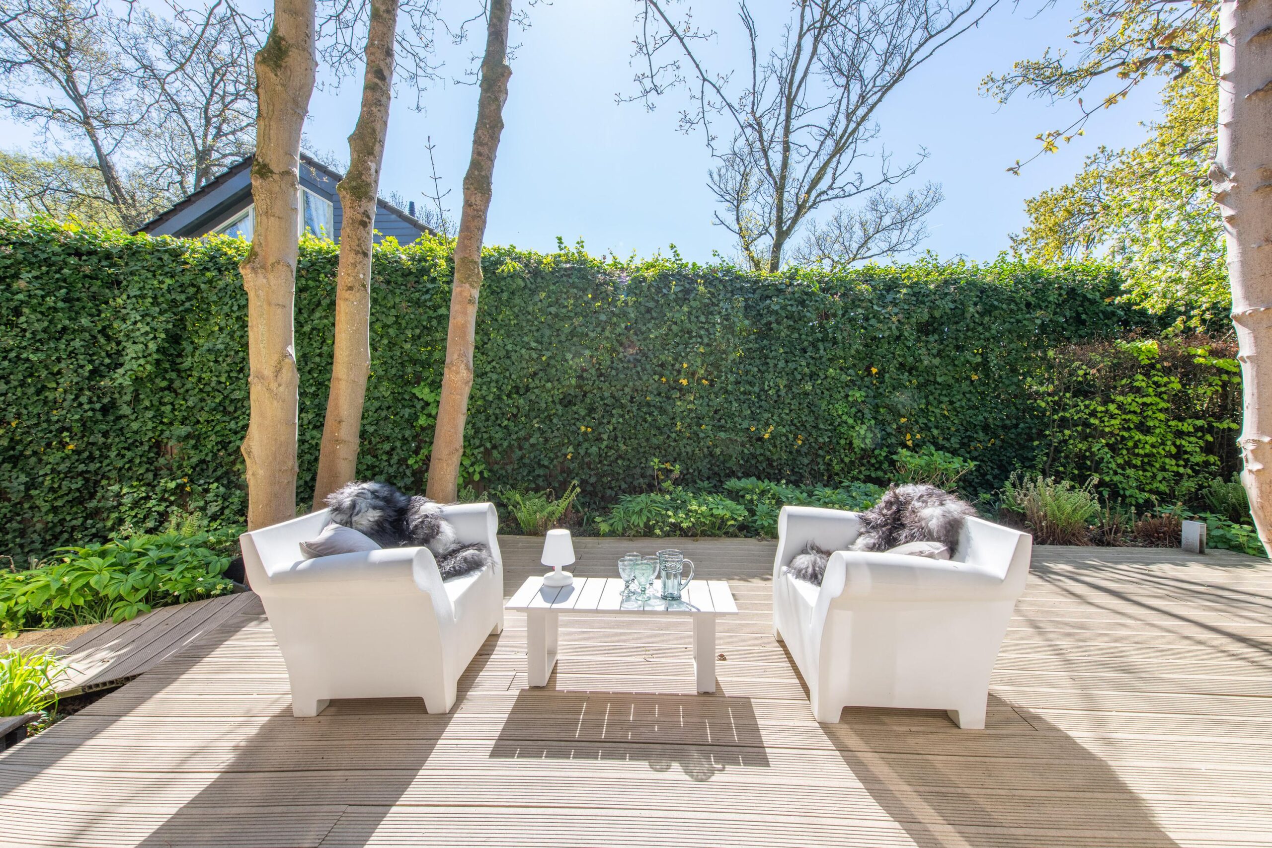 De zorgvuldig aangelegde tuin rondom de villa biedt optimale privacy en meerdere zon- en schaduwterrassen. Hier geniet u op elk moment van de dag van rust, natuur en groen. Of u nu een kop koffie drinkt onder de bomen, dineert met vrienden of simpelweg ontspant na een dag werken – dit is een buitenruimte die leeft.