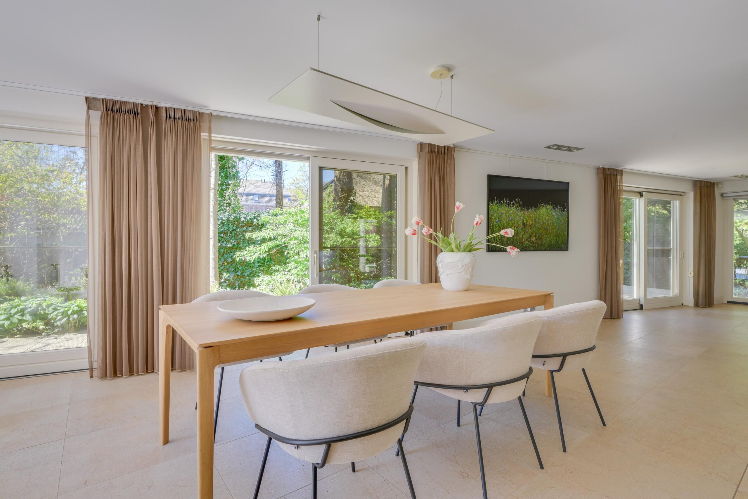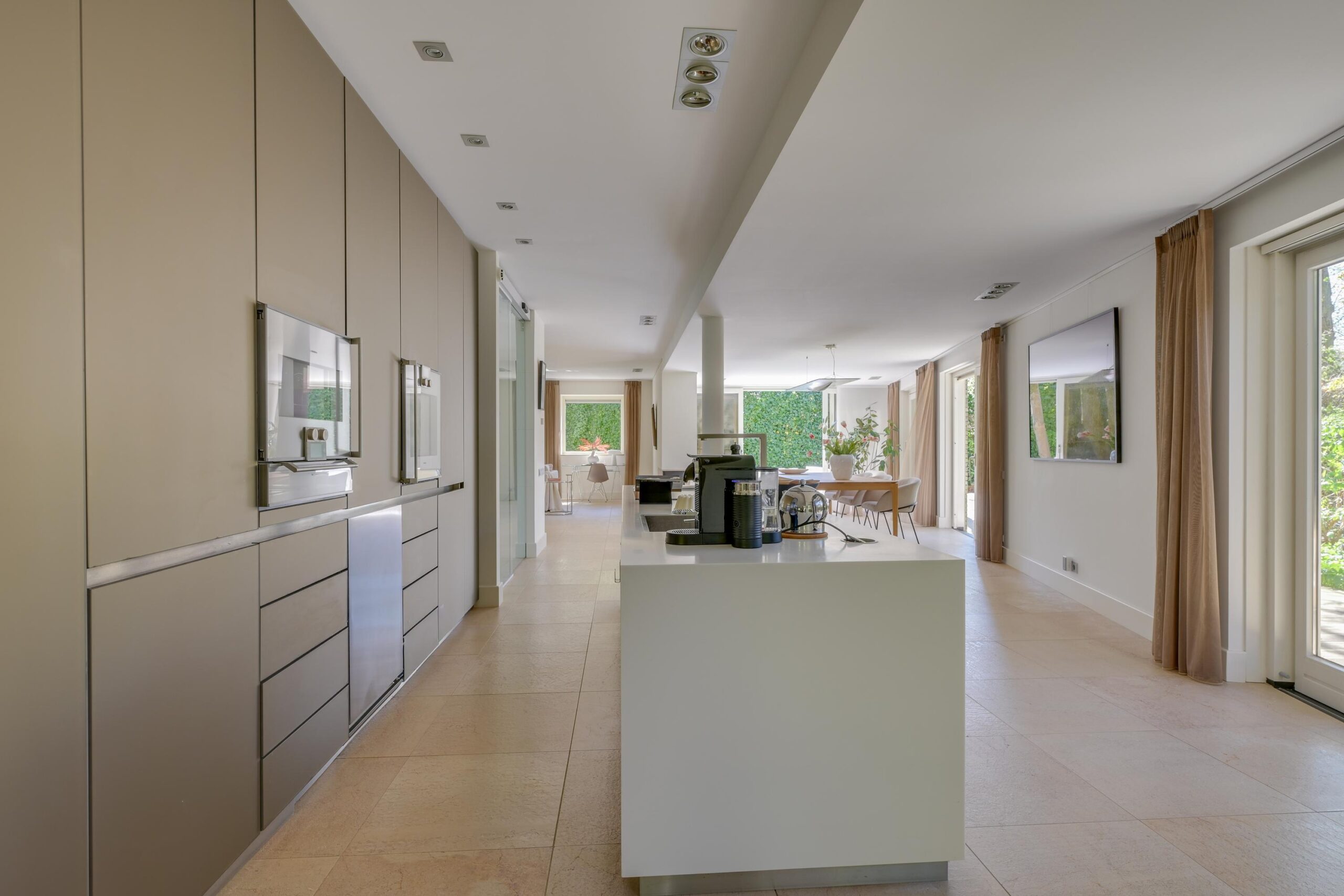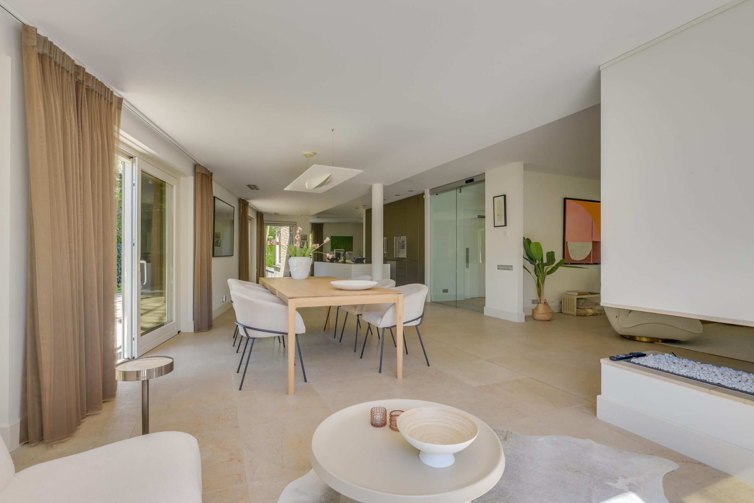 De villa verkeert in uitstekende staat van onderhoud en is afgewerkt met hoogwaardige materialen en stijlvol maatwerk. De royale living van circa 101 m² vormt het hart van de woning: licht, ruimtelijk en warm, met een gashaard en grote raampartijen die het buitenleven naar binnen halen. De (elektrische) schuifpuien verbinden de woonkamer moeiteloos met de fraai aangelegde tuin en diverse terrassen.