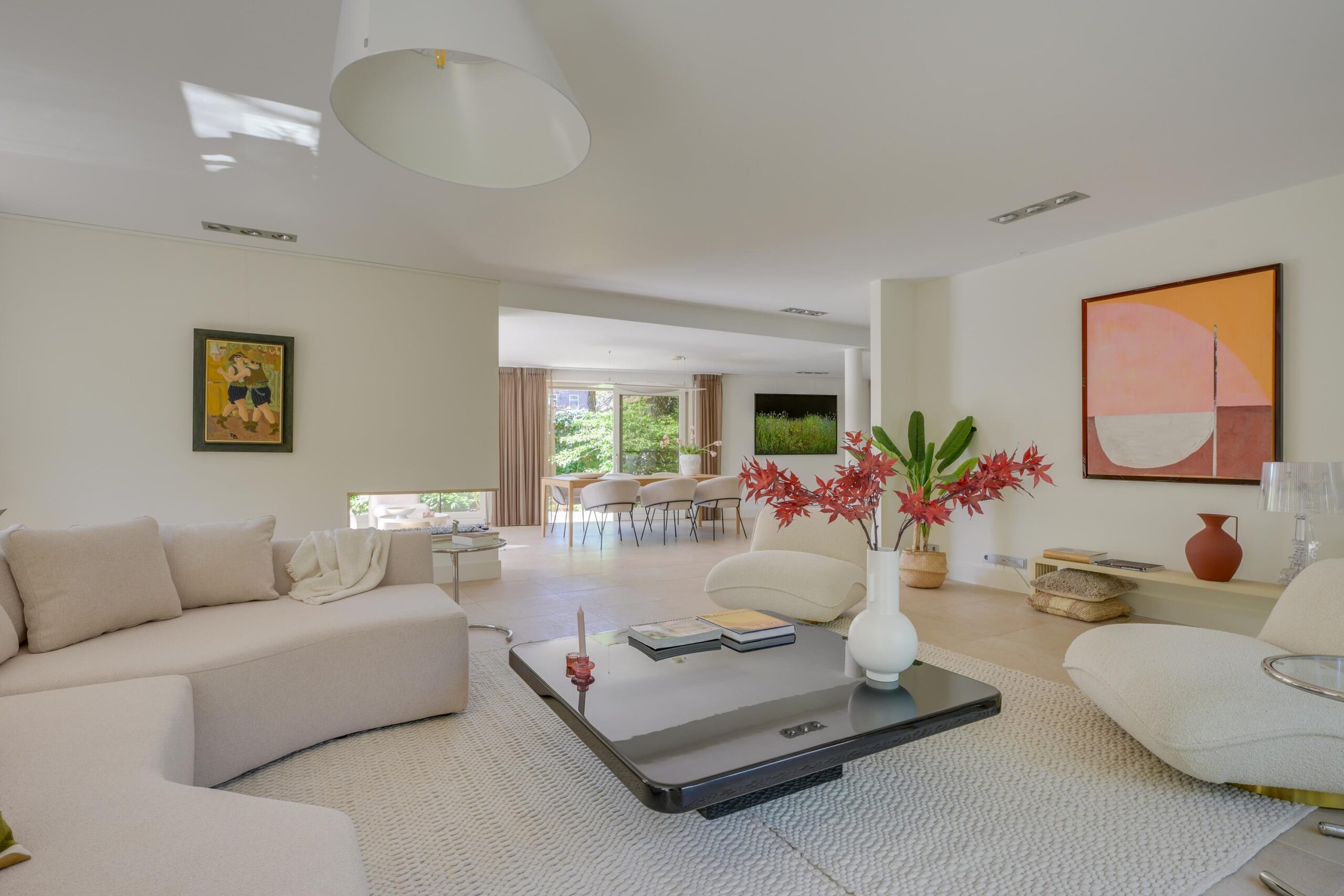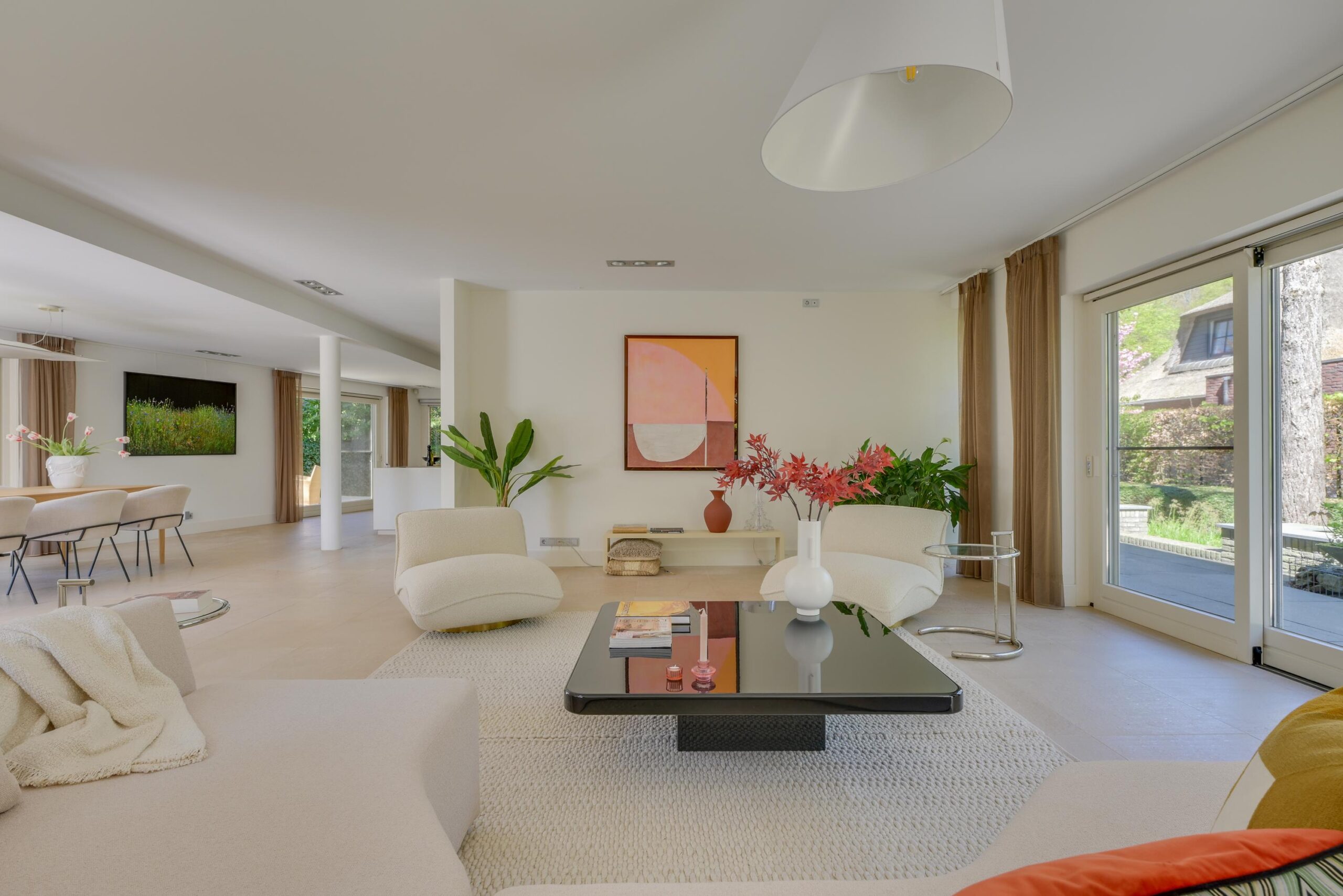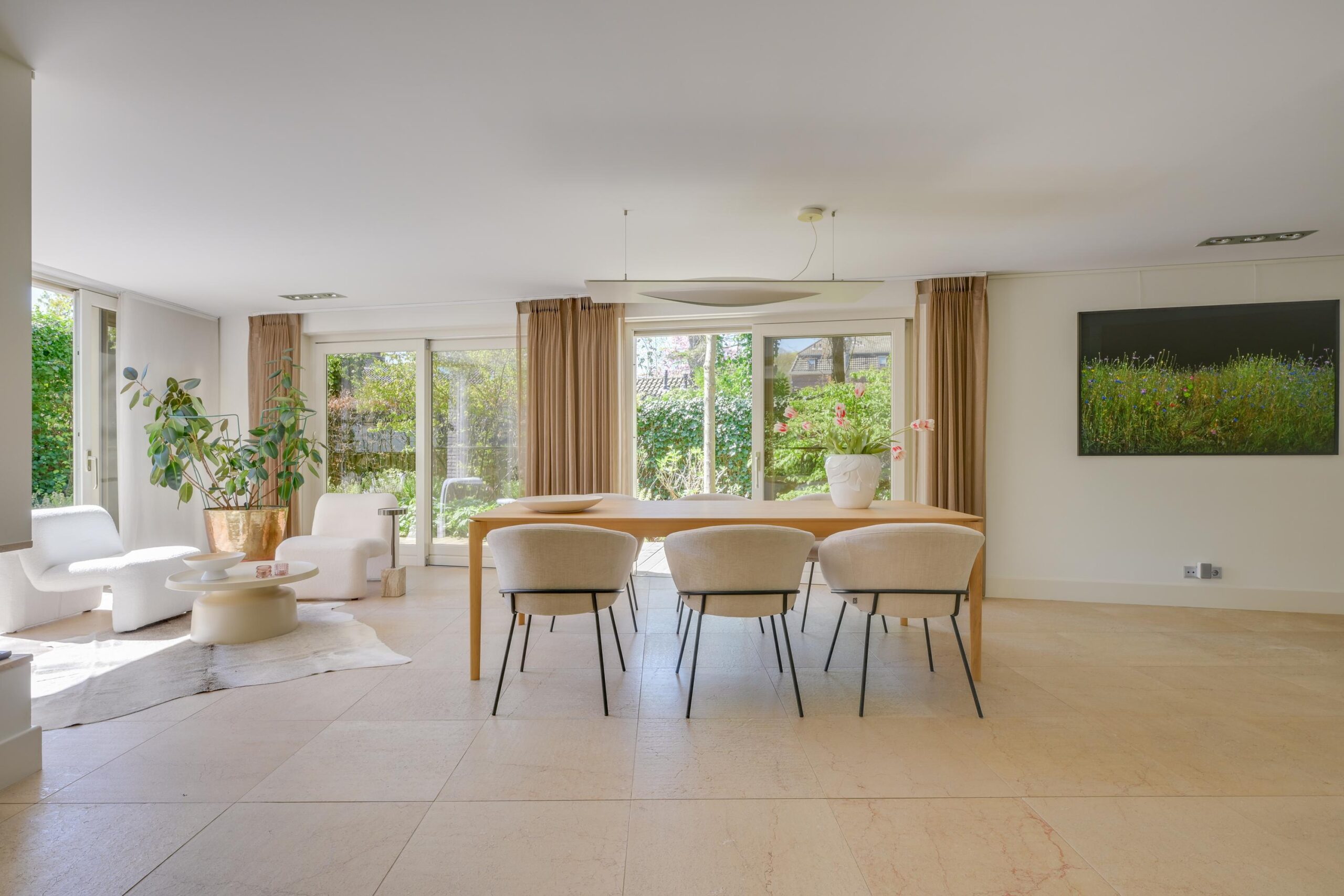 De villa verkeert in uitstekende staat van onderhoud en is afgewerkt met hoogwaardige materialen en stijlvol maatwerk. De royale living van circa 101 m² vormt het hart van de woning: licht, ruimtelijk en warm, met een gashaard en grote raampartijen die het buitenleven naar binnen halen. De (elektrische) schuifpuien verbinden de woonkamer moeiteloos met de fraai aangelegde tuin en diverse terrassen.