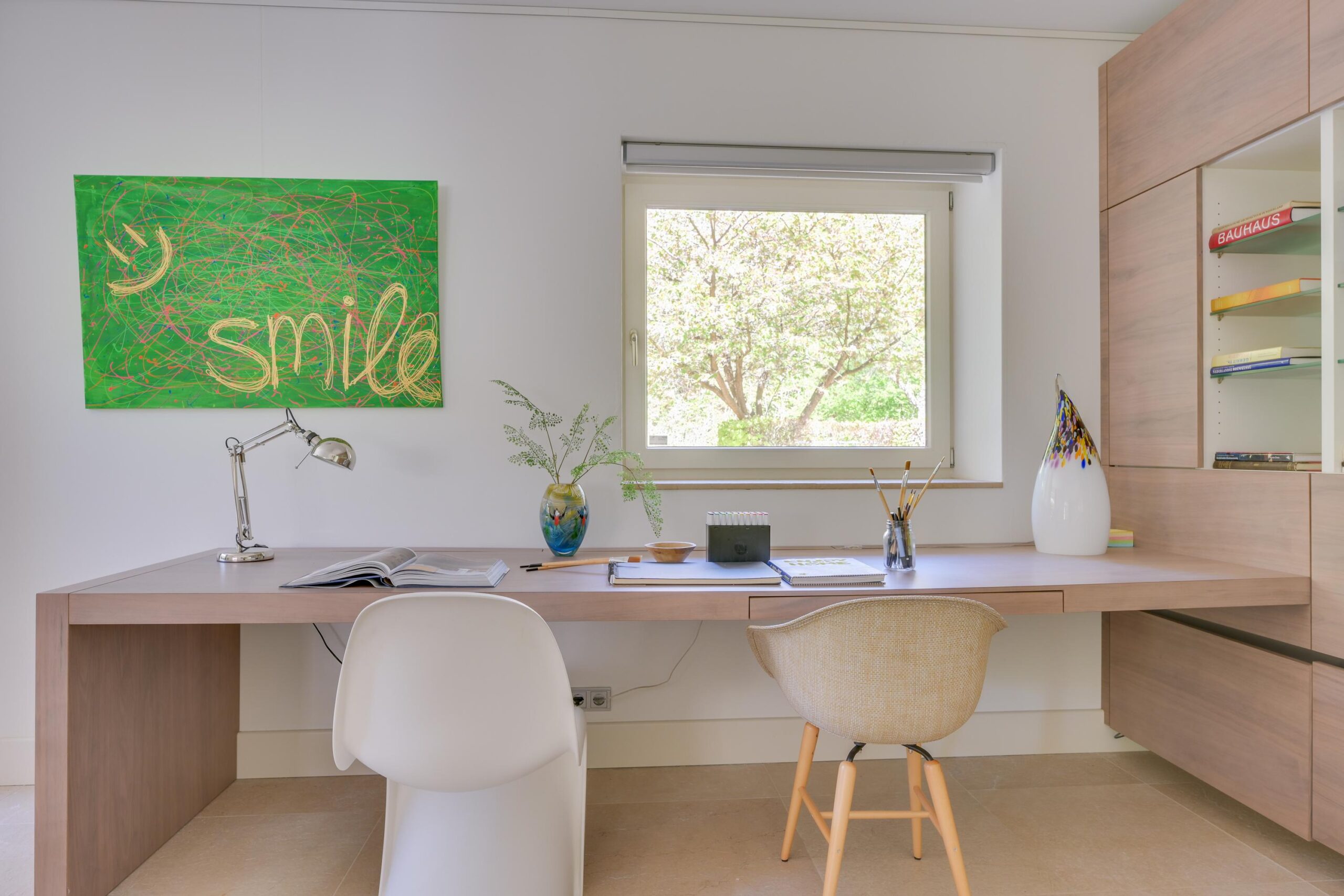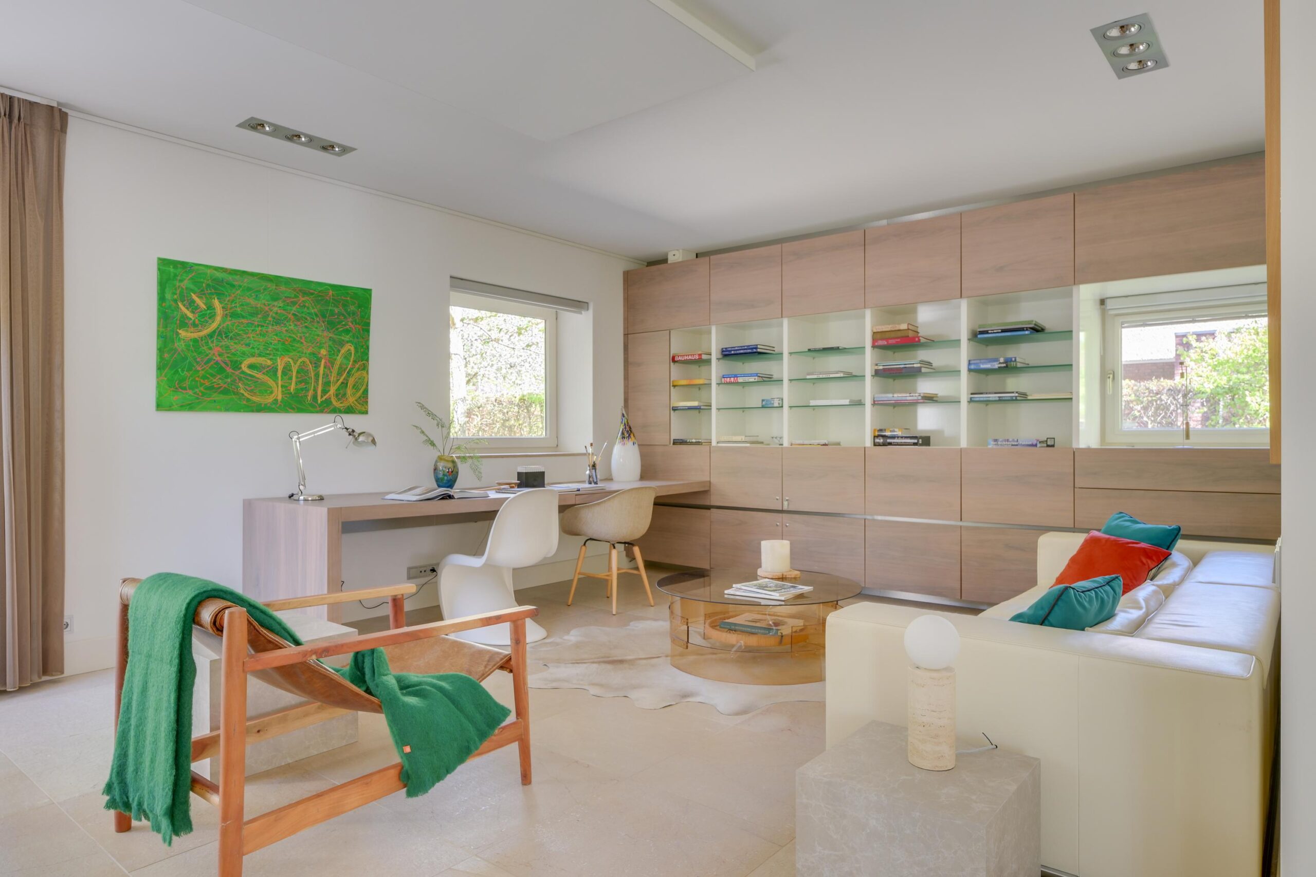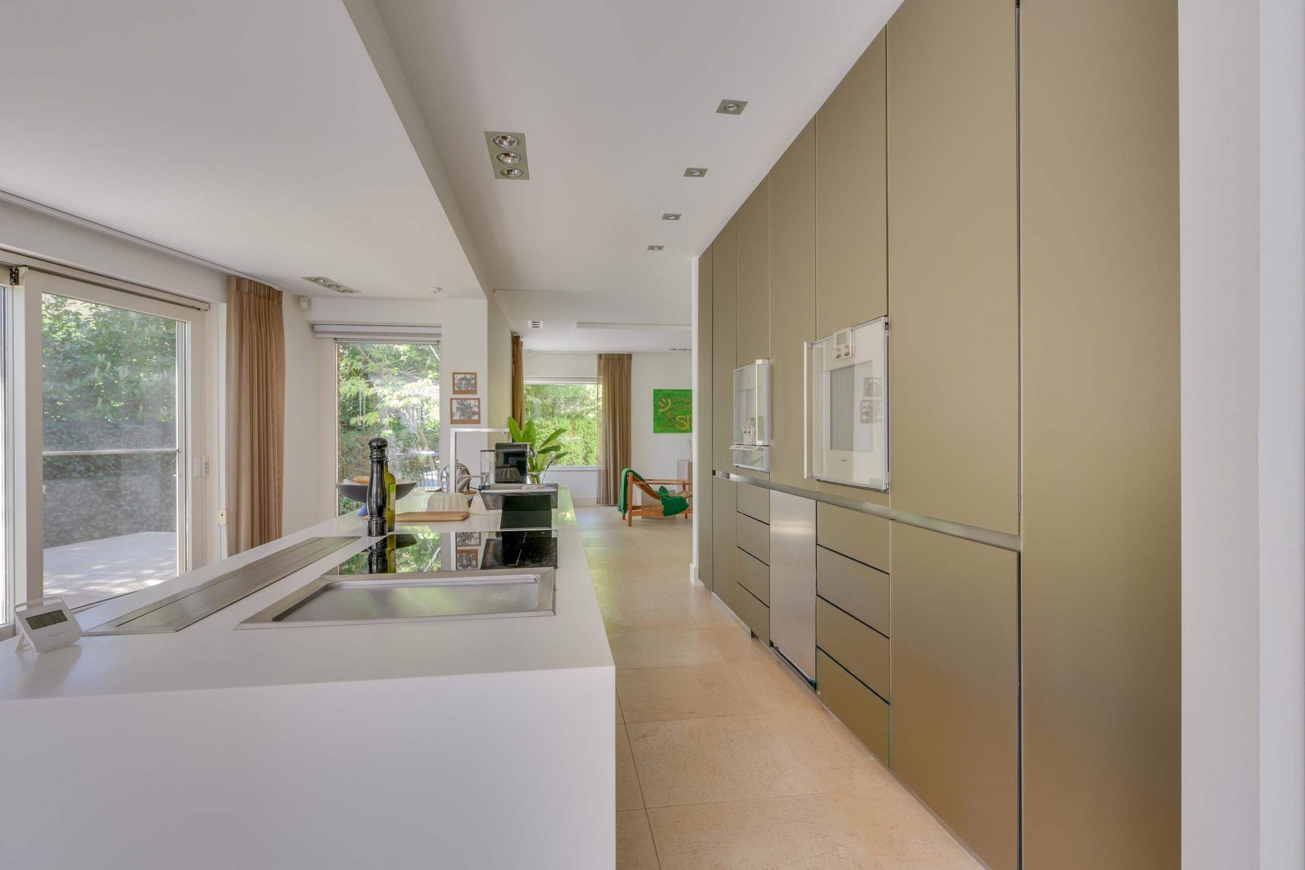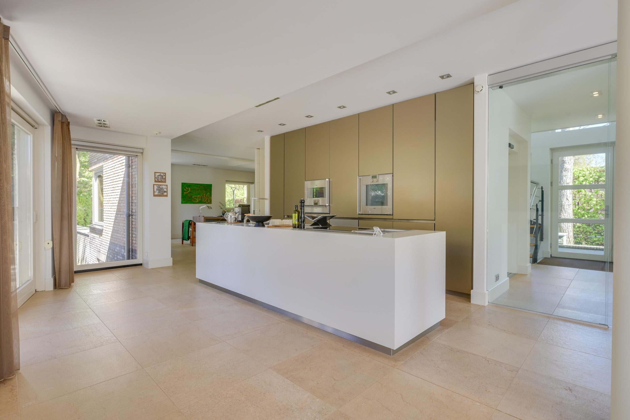 De open leefkeuken is van alle gemakken voorzien, uitgerust met luxe inbouwapparatuur en een in hoogte verstelbaar kookeiland, perfect voor zowel dagelijks comfort als het ontvangen van gasten. Aangrenzend bevindt zich een multifunctionele werk- of eetkamer van ca. 27 m², afsluitbaar met een schuifdeur, ideaal als thuiswerkplek, muziekkamer of rustige eetkamer.