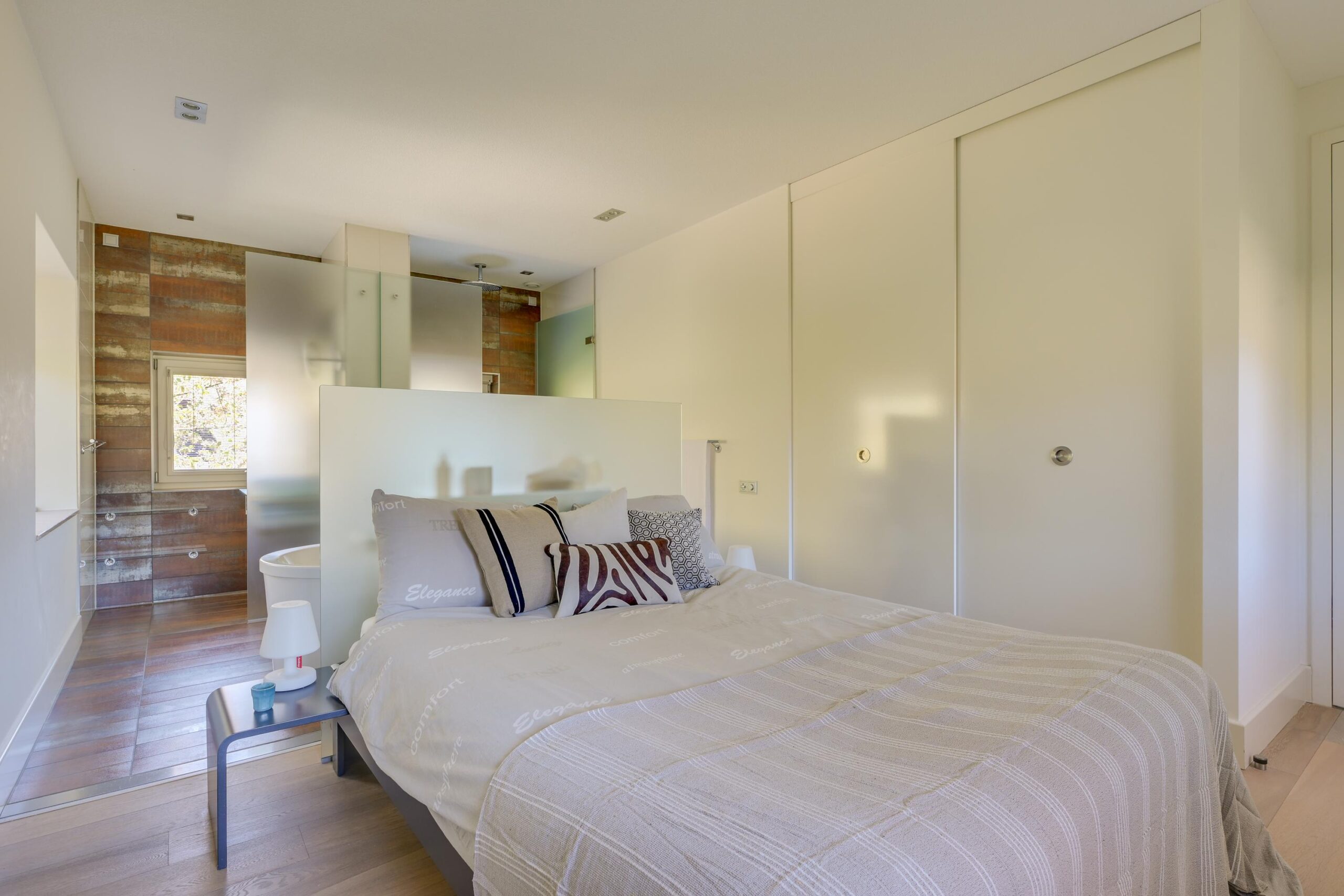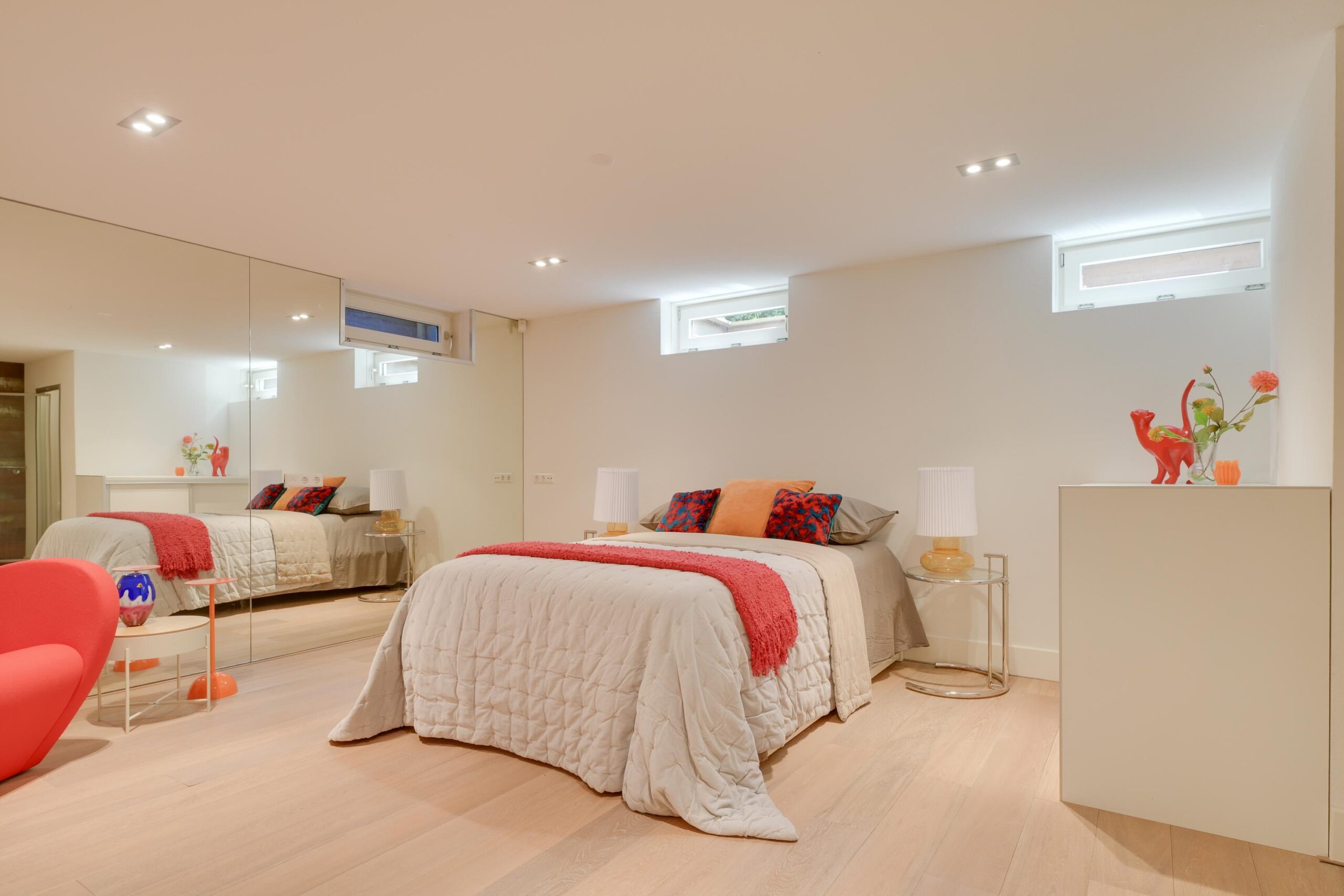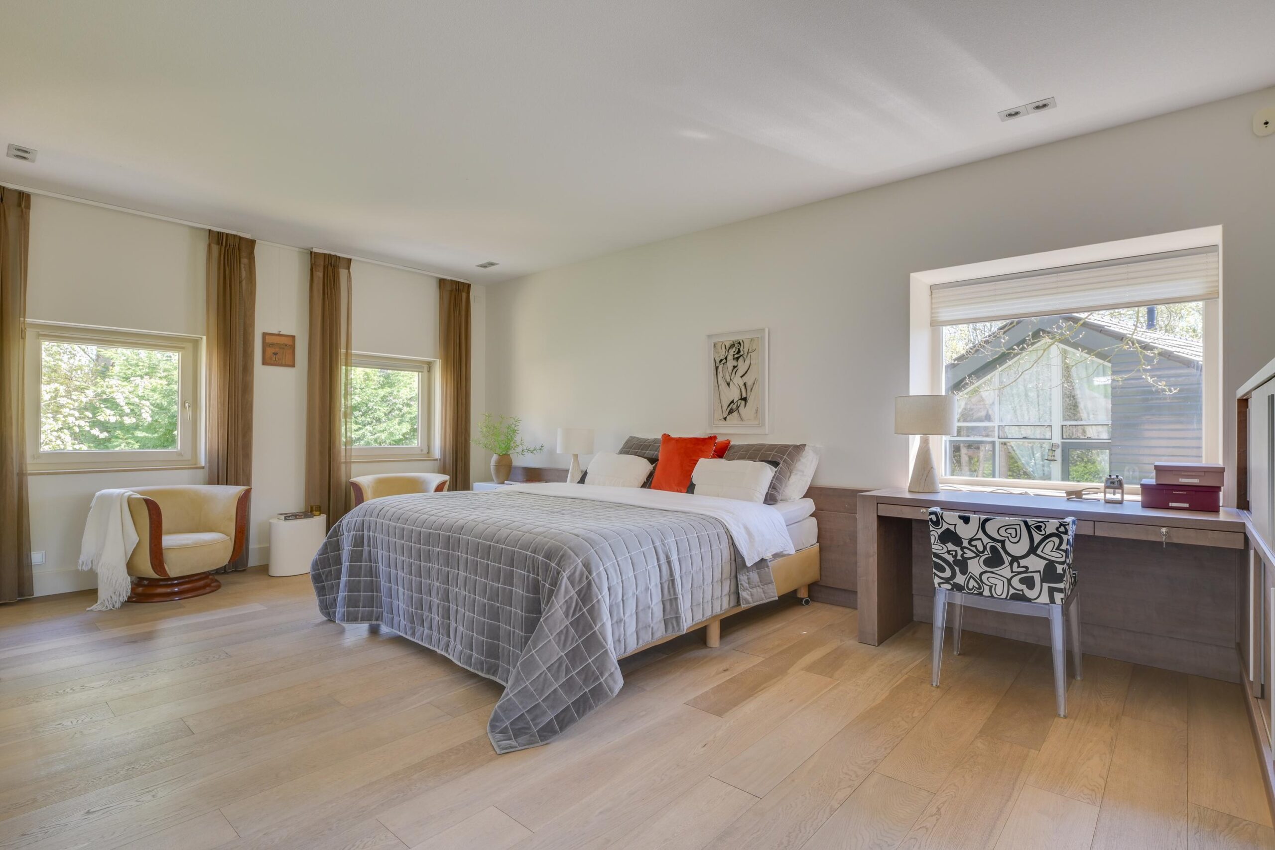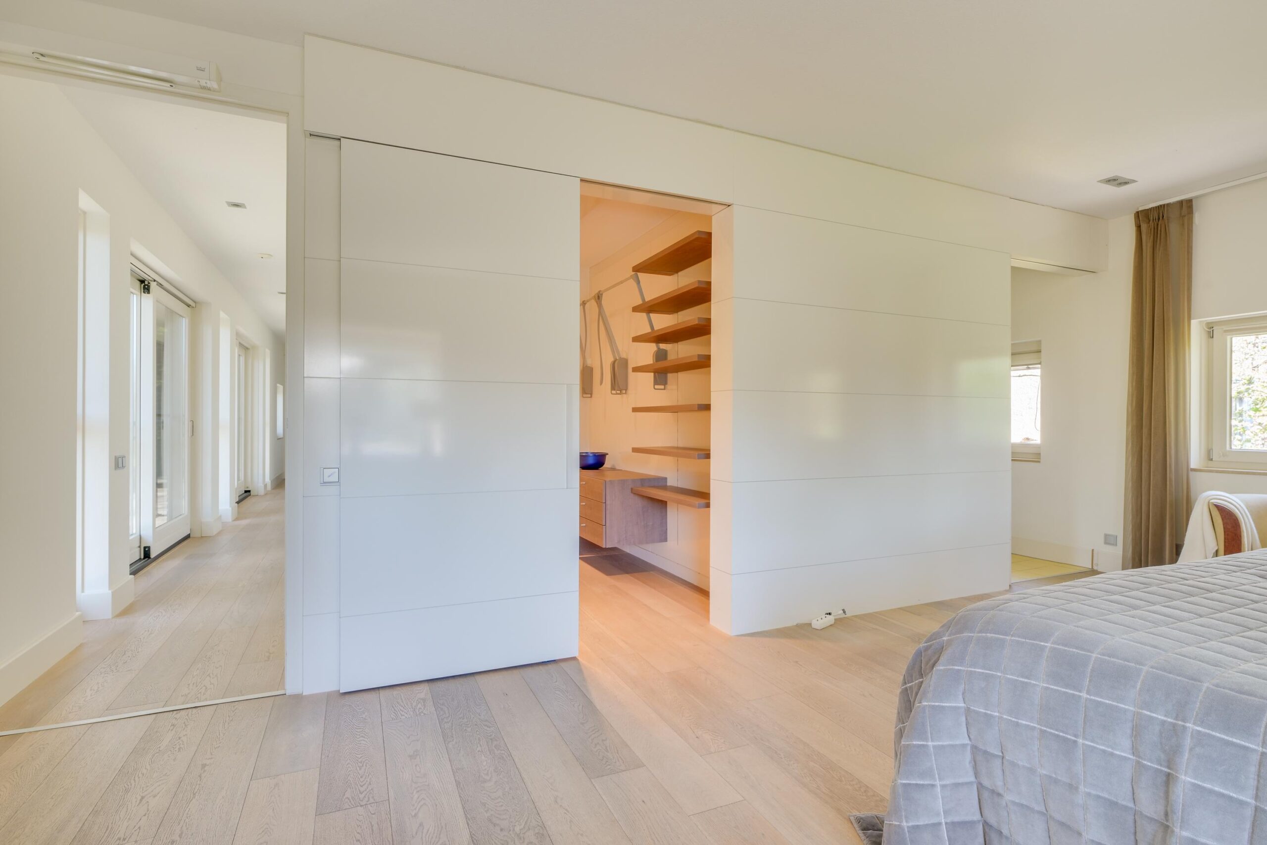 Op de eerste verdieping bevinden zich drie zeer ruime slaapkamers van ca. 25 m², 23 m² en 16 m², waarvan twee met een eigen luxe badkamer. De master bedroom beschikt over een en-suite badkamer én een royale inloopkast. Alles is ontworpen met oog voor rust, comfort en privacy. Ook deze verdieping is volledig uitgerust met vloerverwarming en een stijlvolle parketvloer.