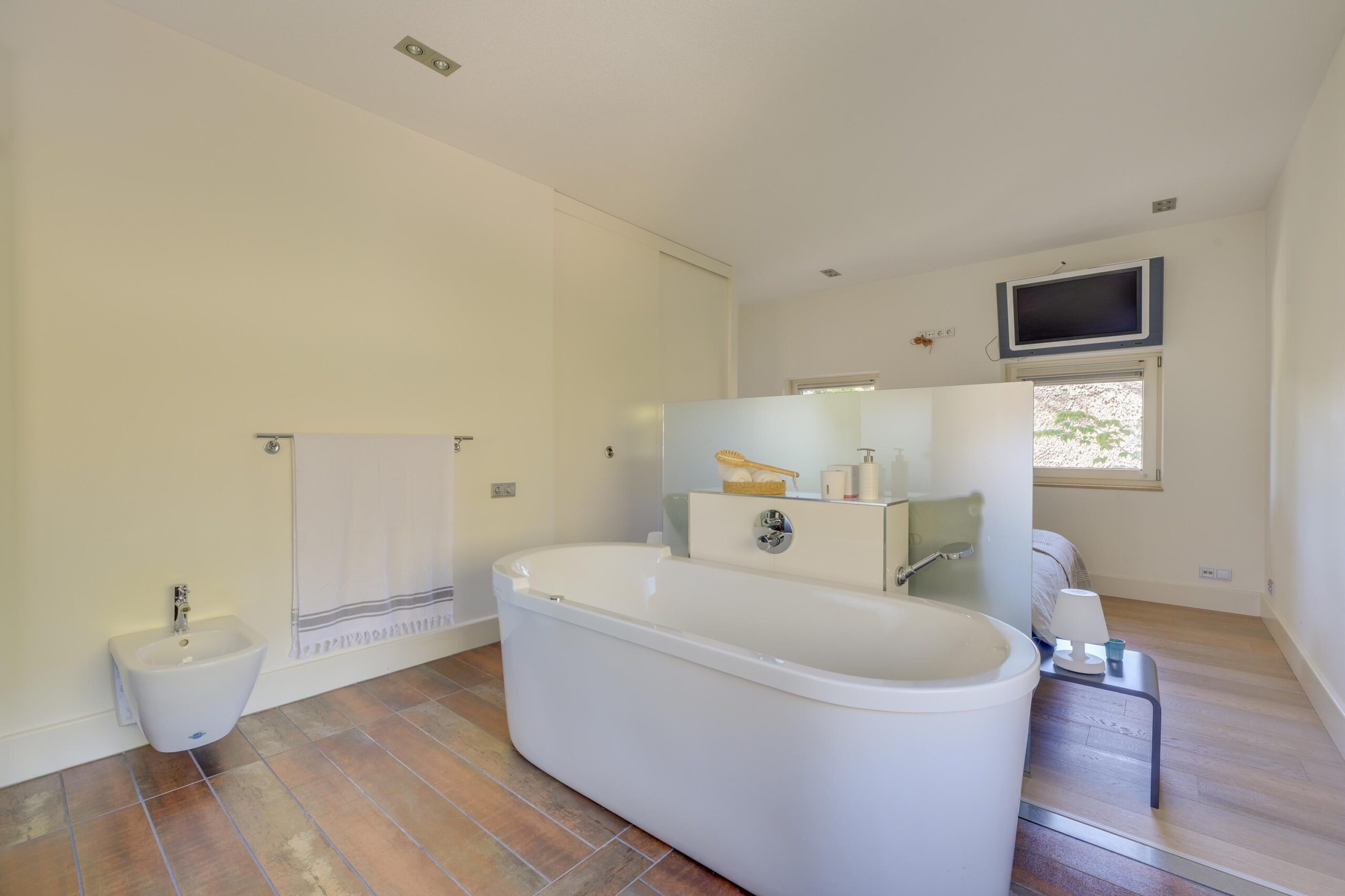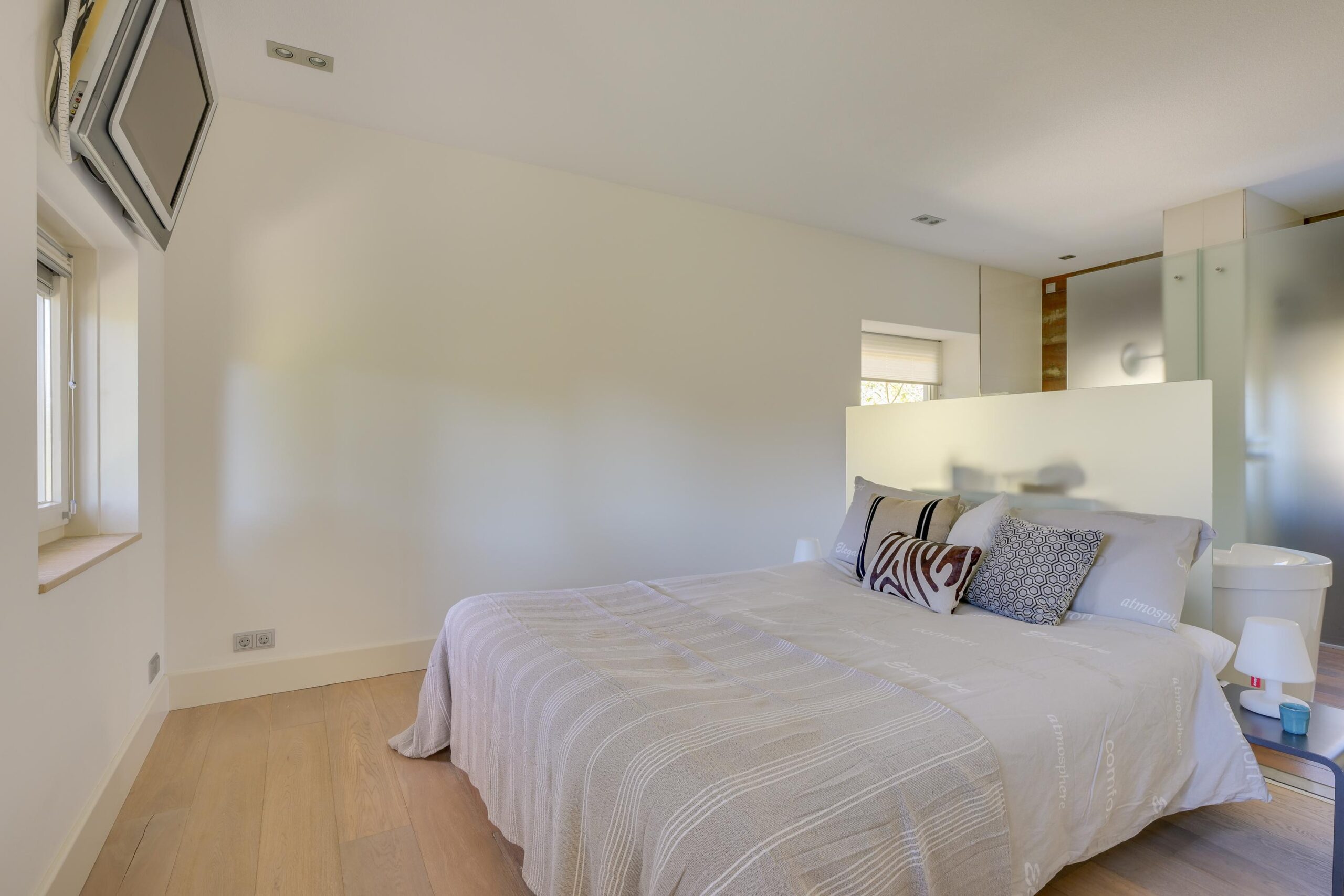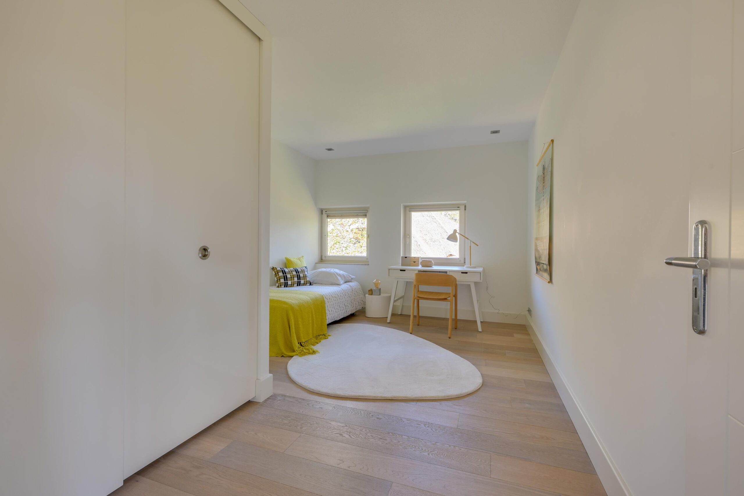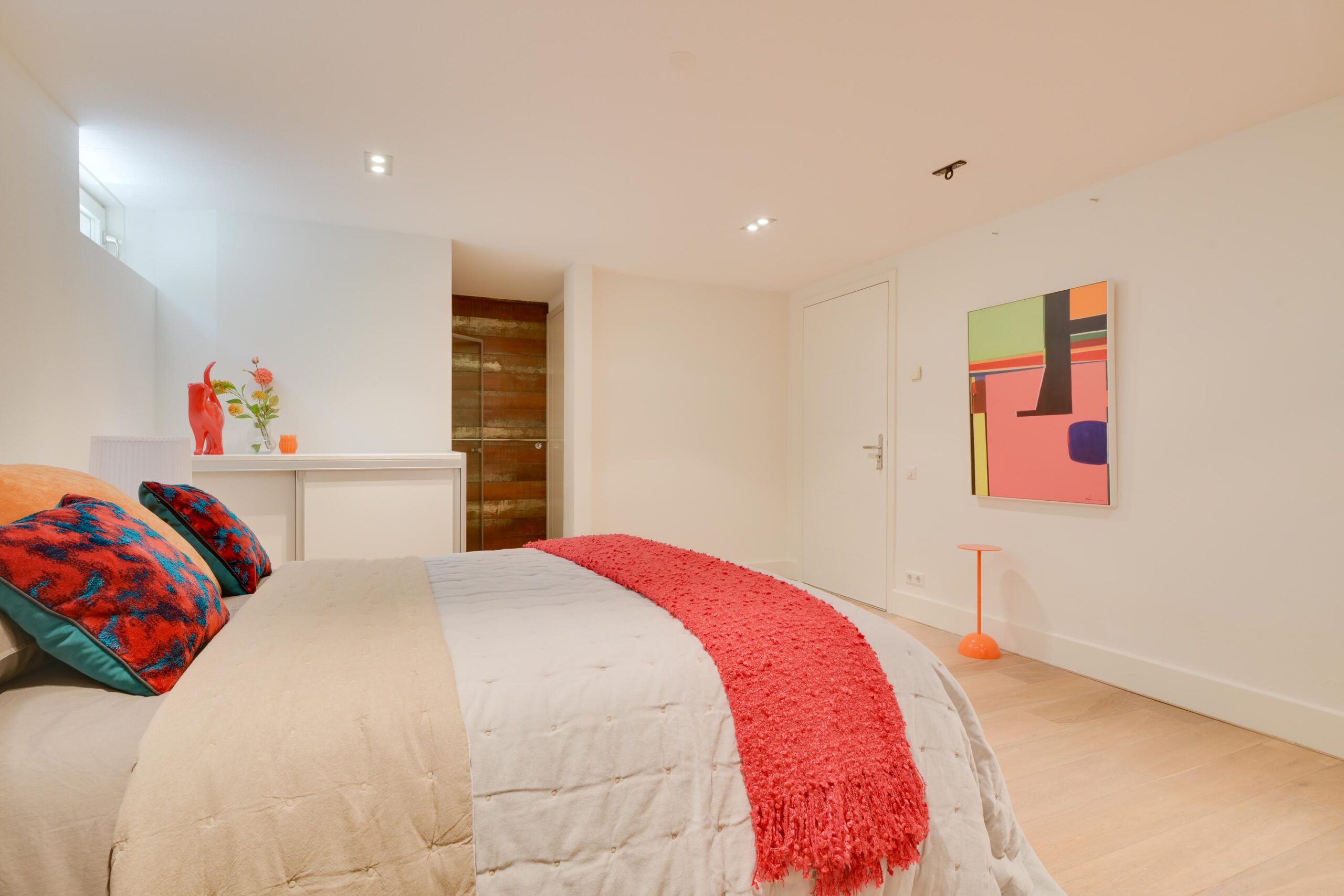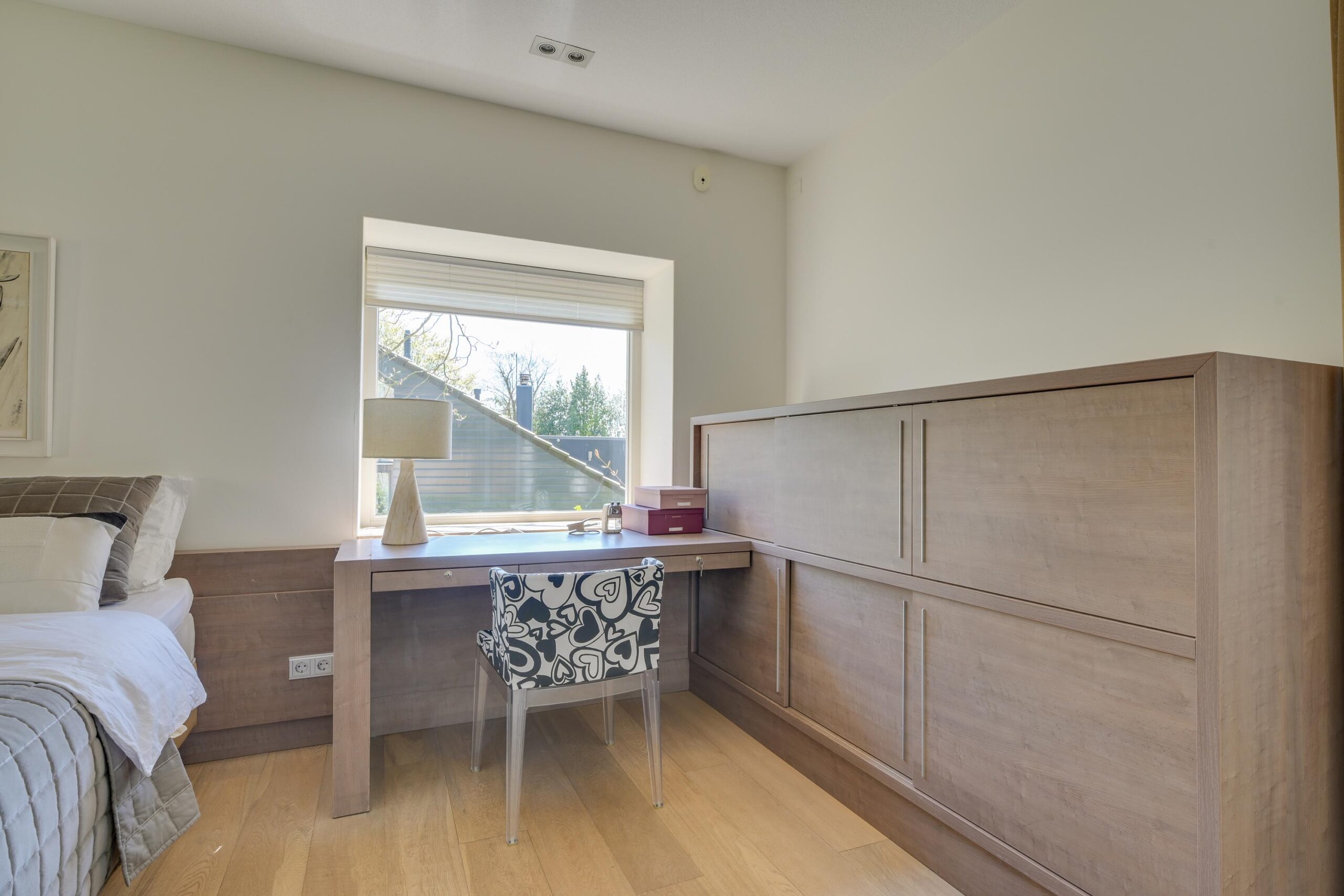 Op de eerste verdieping bevinden zich drie zeer ruime slaapkamers van ca. 25 m², 23 m² en 16 m², waarvan twee met een eigen luxe badkamer. De master bedroom beschikt over een en-suite badkamer én een royale inloopkast. Alles is ontworpen met oog voor rust, comfort en privacy. Ook deze verdieping is volledig uitgerust met vloerverwarming en een stijlvolle parketvloer.