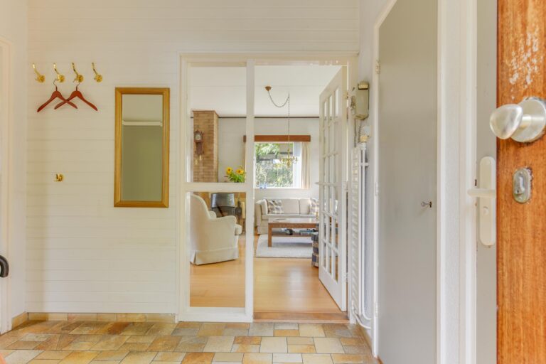 Via de zijkant van de woning komt u binnen in de hal waar direct de Solnhofener natuurstenen vloer opvalt, karakteristiek voor de vroege jaren zestig. De hal geeft toegang tot het toilet, de trapopgang, kelder, keuken en woonkamer.