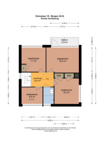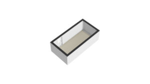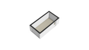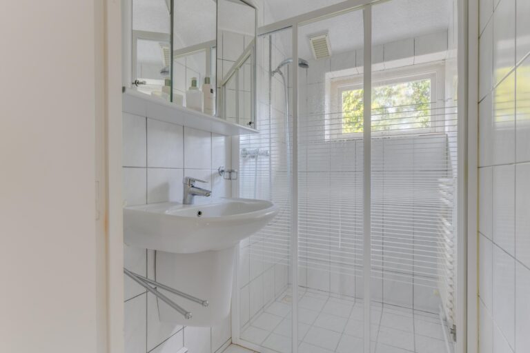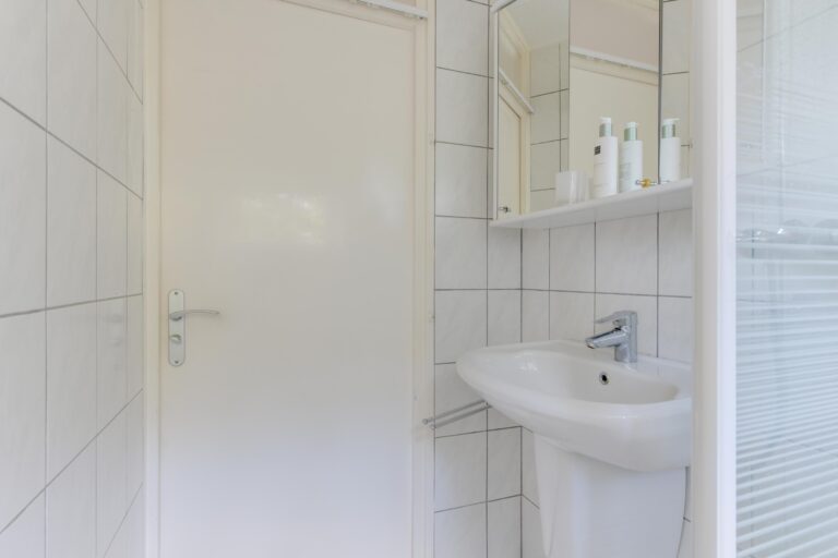 De badkamer bevindt zich aan de voorzijde en is voorzien van een wastafel, radiator en een douchecabine over de gehele breedte.