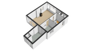 De lichte en ruime woonkamer met toegang tot de achtertuin, is sfeervol ingedeeld met de in Solnhofener natuursteen uitgevoerde schouw en de schuin geplaatste Tasso houtkachel als middelpunt. Er is voldoende ruimte voor een zit- en eetgedeelte.