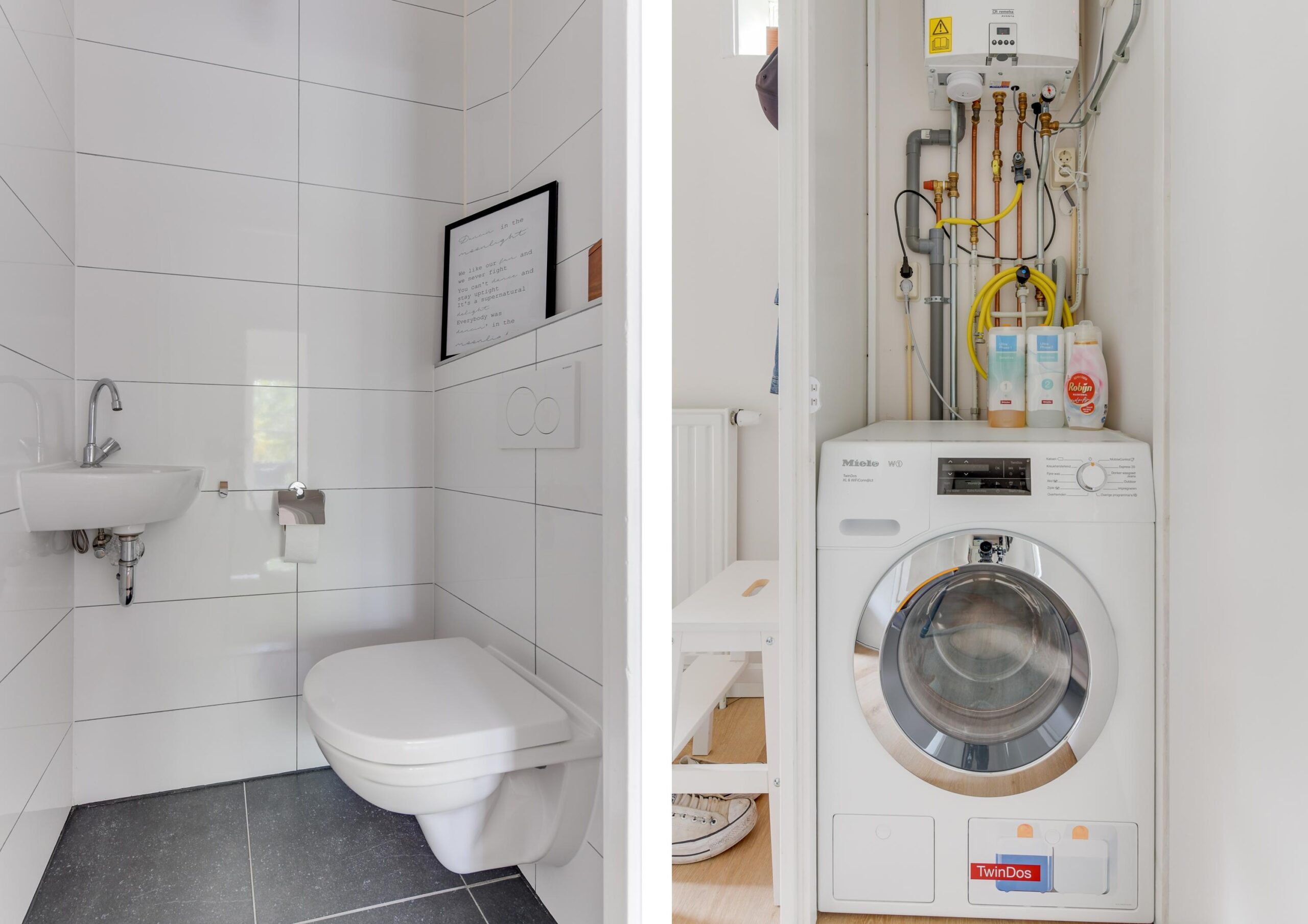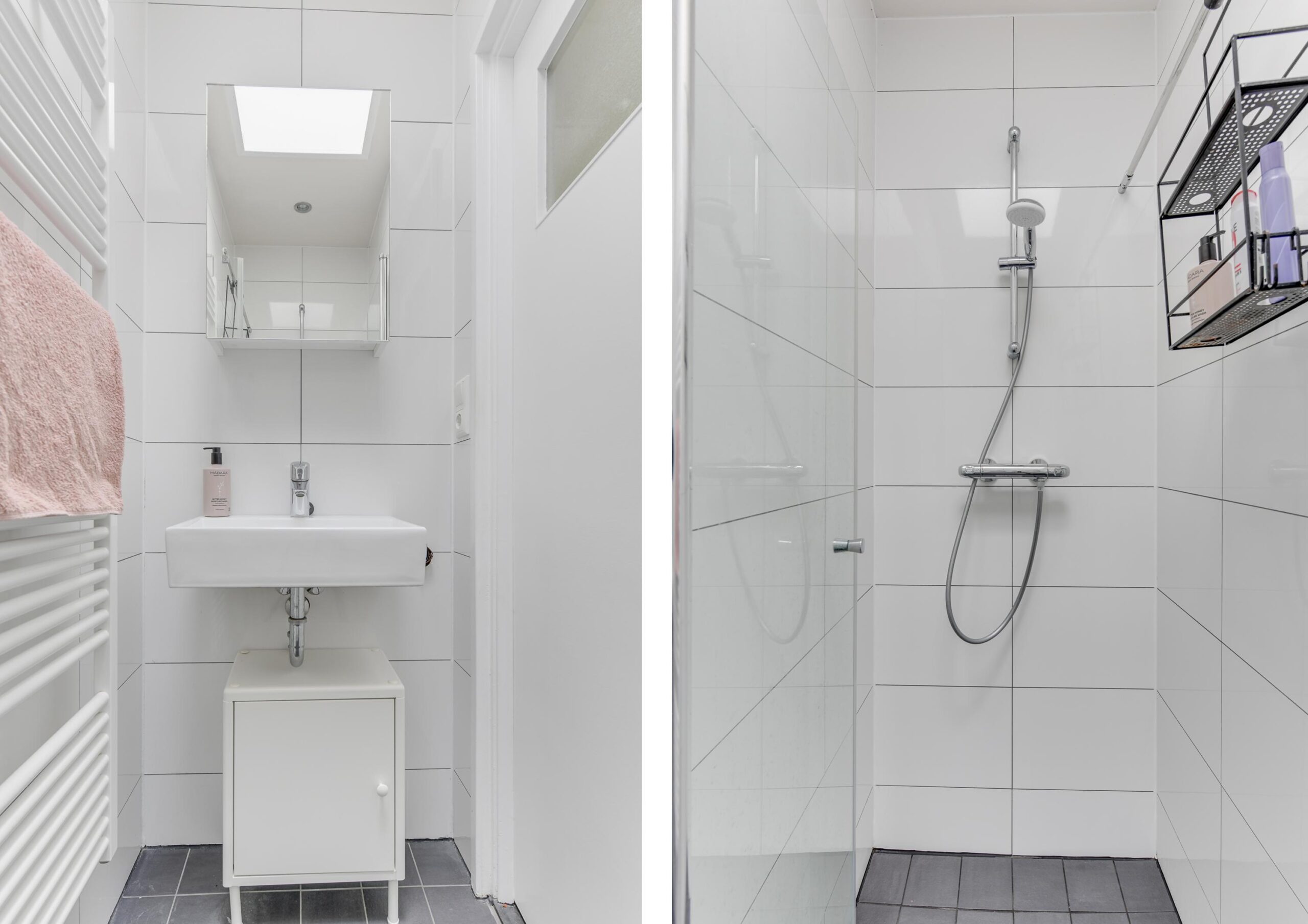 De badkamer is voorzien van een douche en wastafel. het separaat toilet is voorzien van een hangtoilet en fonteintje.