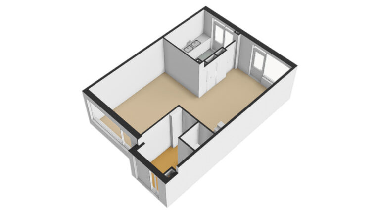 De dichte keuken van ca. 7 m² is voorzien van een eenvoudig keukenblok