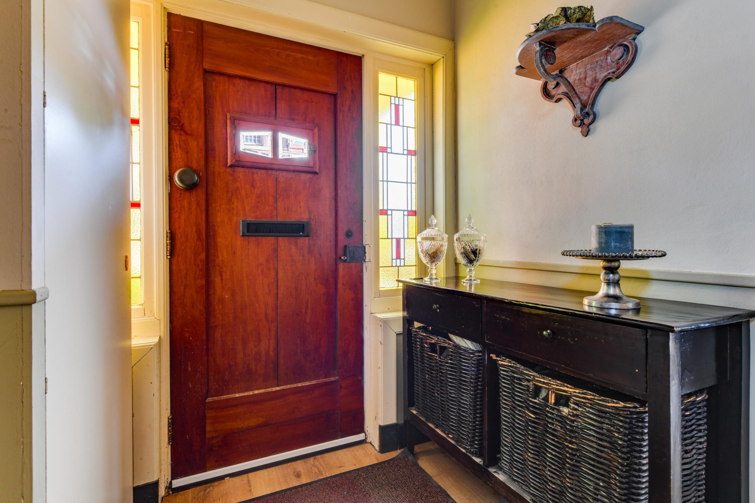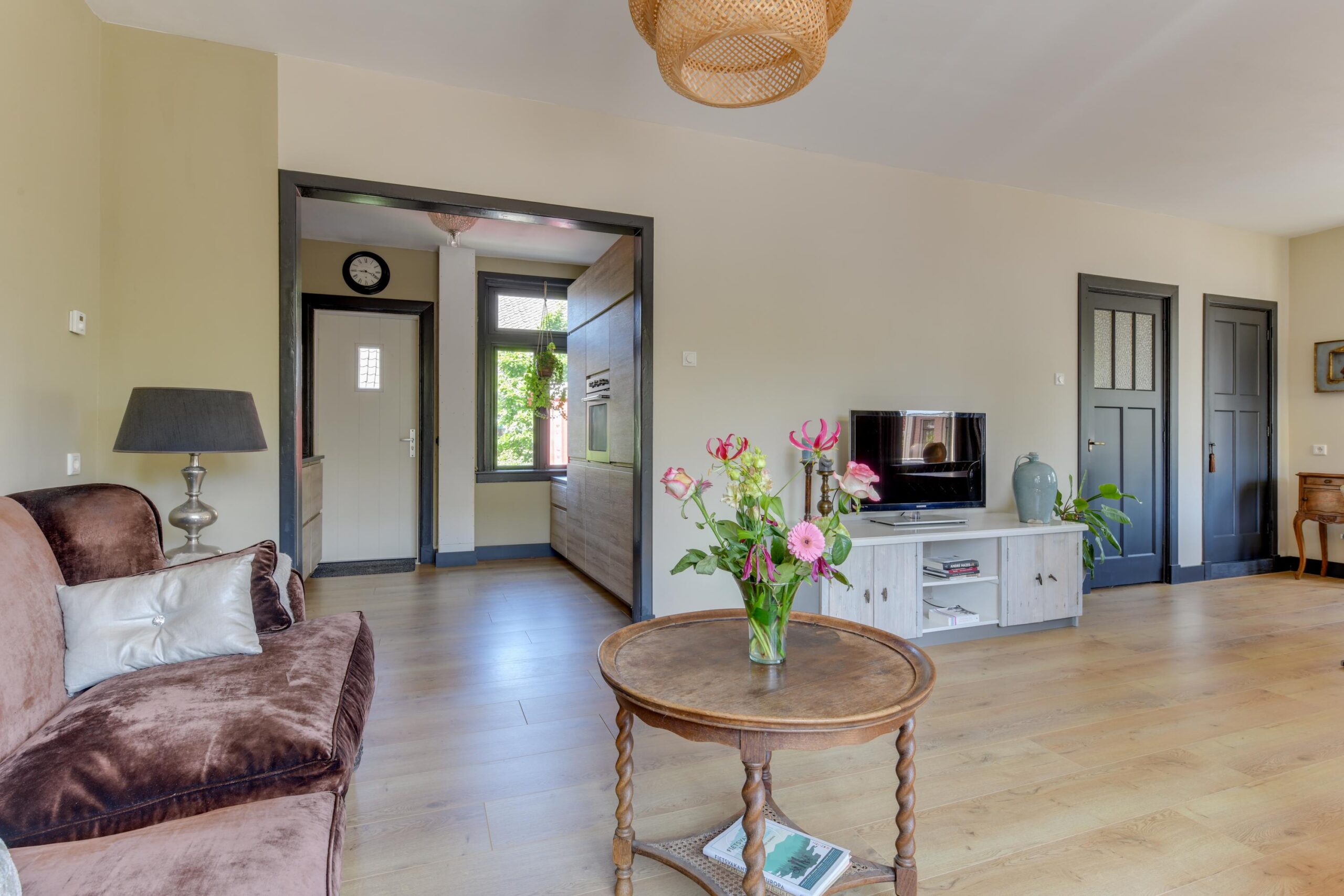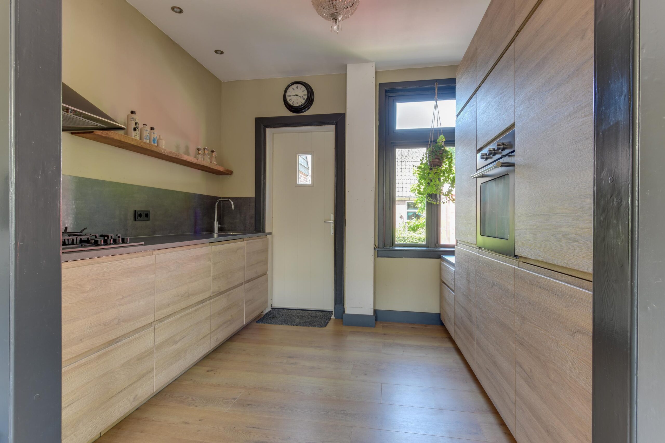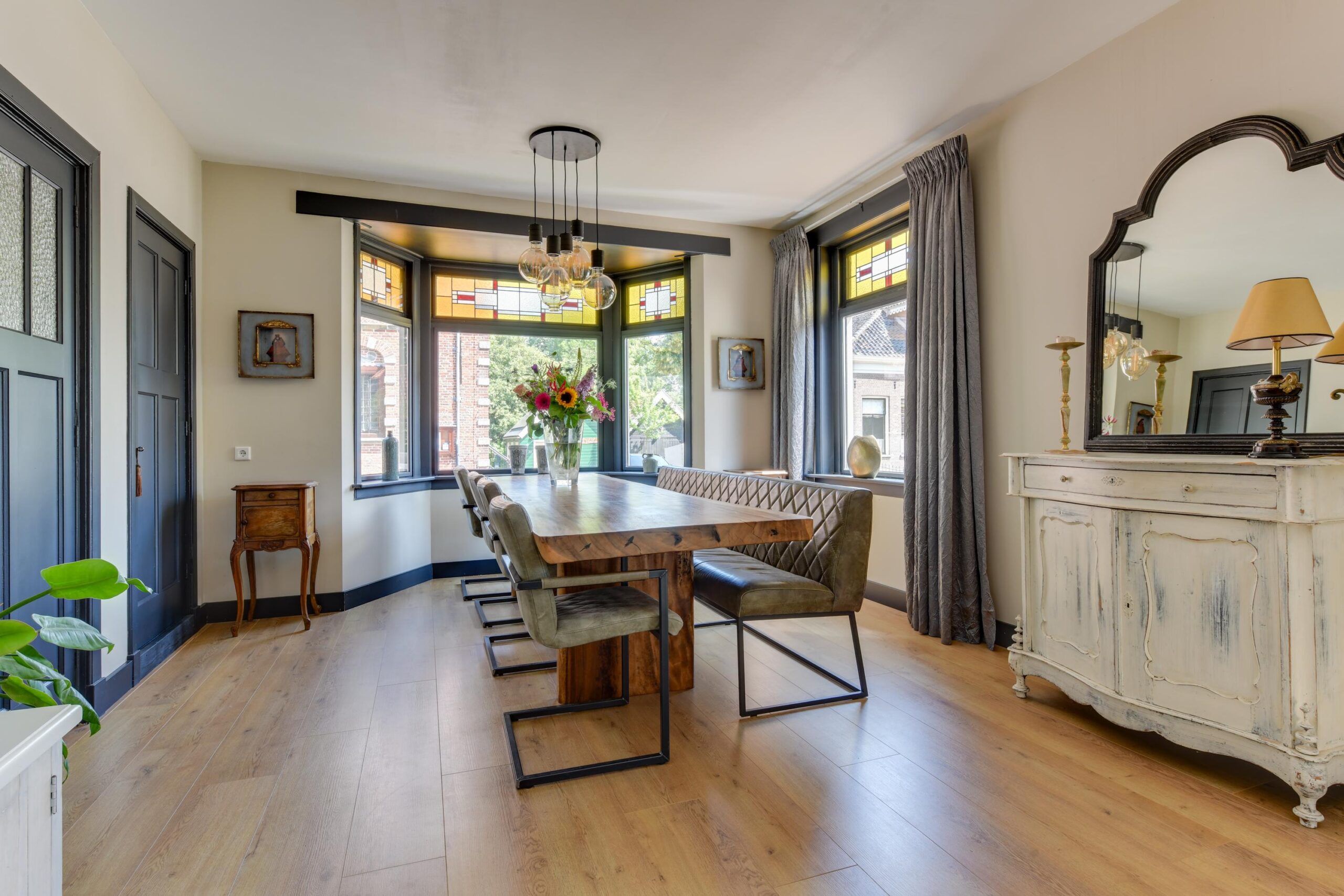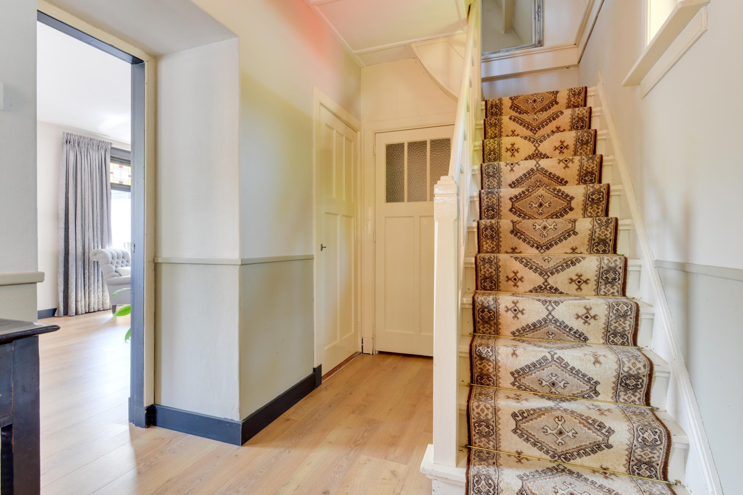 Bij binnenkomst in de ruime hal (ca. 6 m²) wordt u direct verwelkomd door het prachtige glas-in-lood detail naast de voordeur, dat meteen een warme en sfeervolle indruk achterlaat. Vanuit de hal heeft u toegang tot het moderne toilet, de trap naar boven en de lichte, gezellige woonkamer. De woonkamer met erker geniet van veel natuurlijk licht dankzij de grote raampartijen. Authentieke paneeldeuren, glas-in-loodramen en een sfeervolle laminaat vloer met comfortabele vloerverwarming geven deze ruimte een unieke charme waar u zich direct thuis zult voelen. De moderne, half open keuken (ca. 8 m²) is strak uitgevoerd en van alle gemakken voorzien, zoals een gaskookplaat, oven, vaatwasser en afzuigkap.