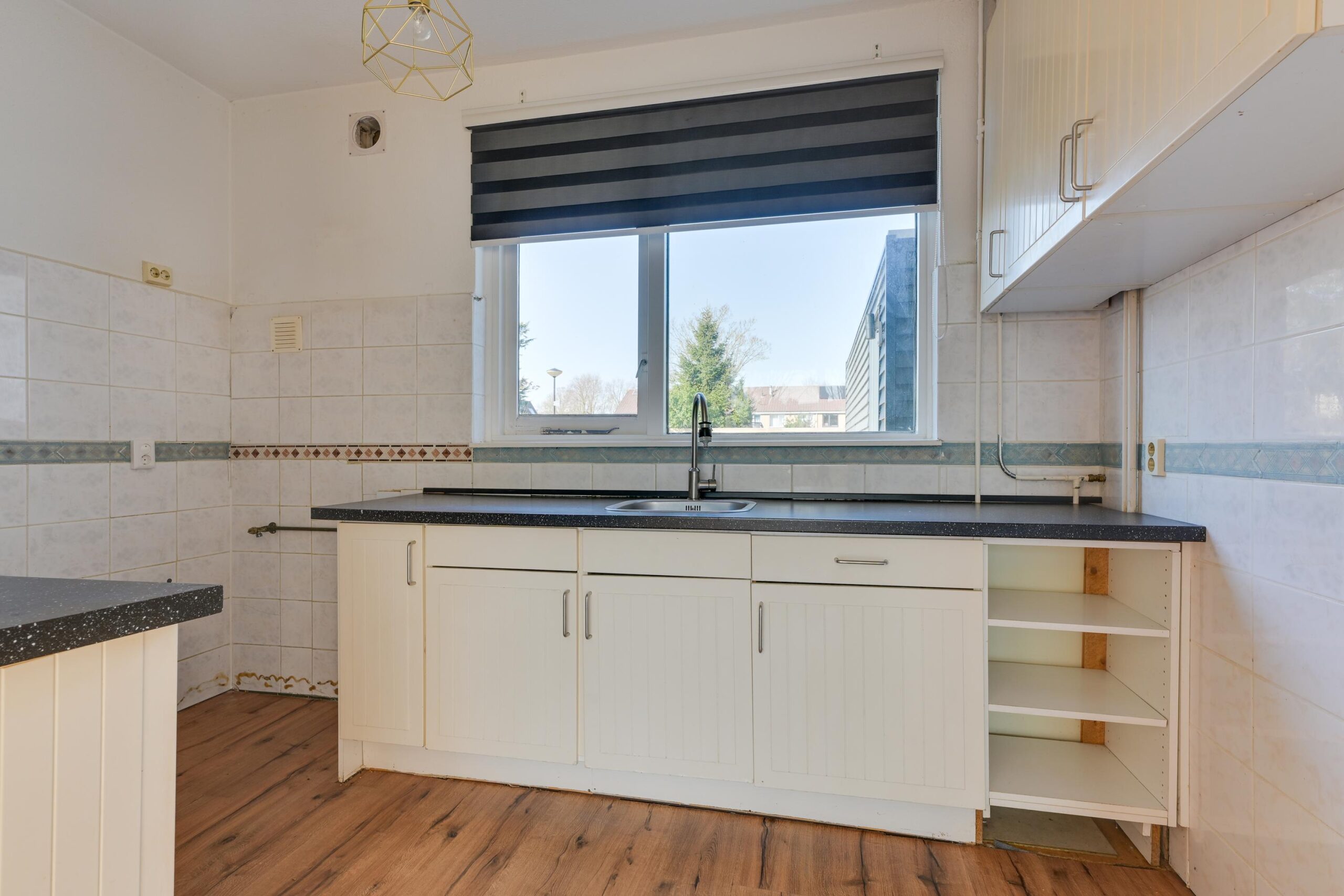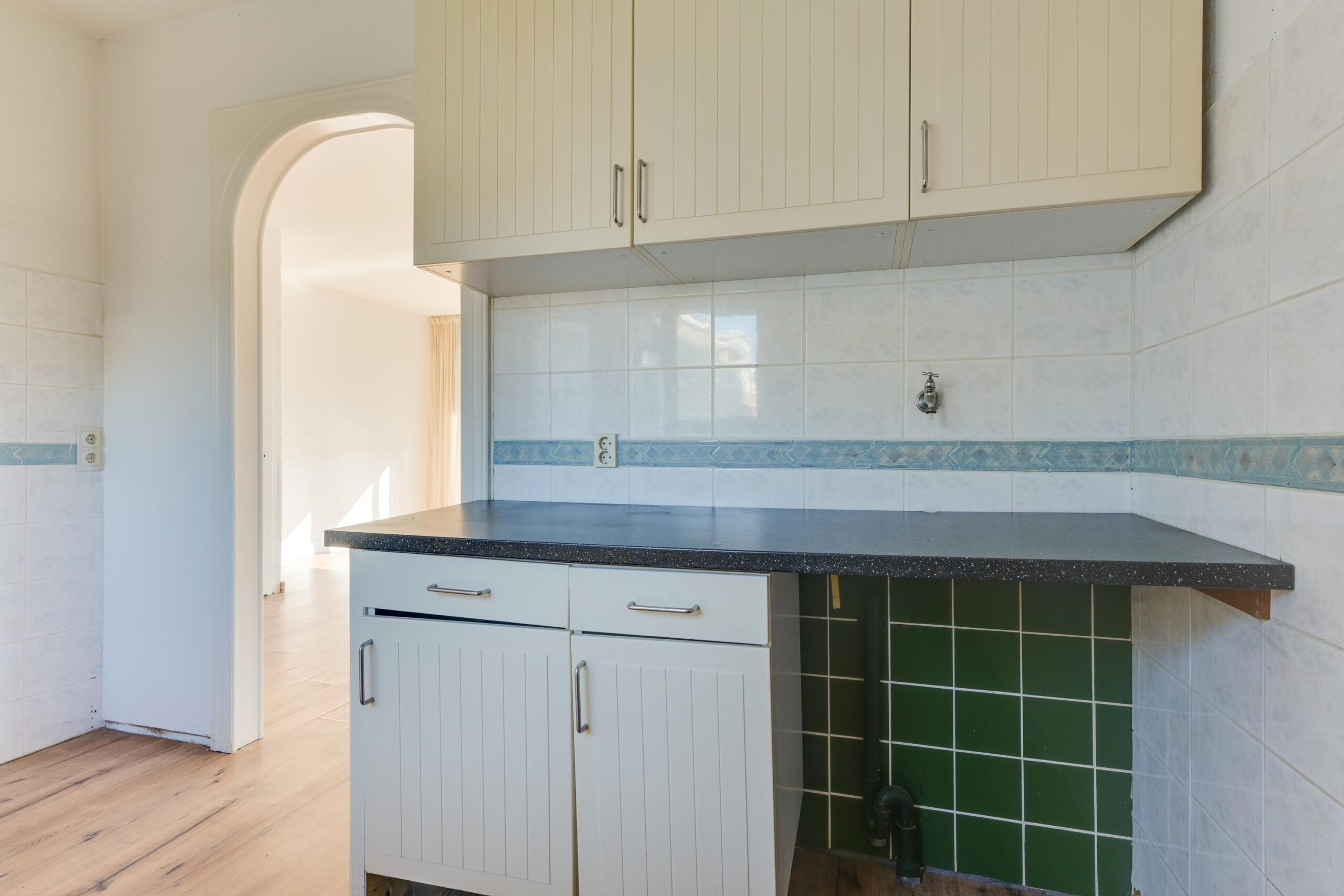 De halfopen keuken van ca. 8 m² is voorzien van een eenvoudig keukenblok met wasbak en diverse opbergmogelijkheden.