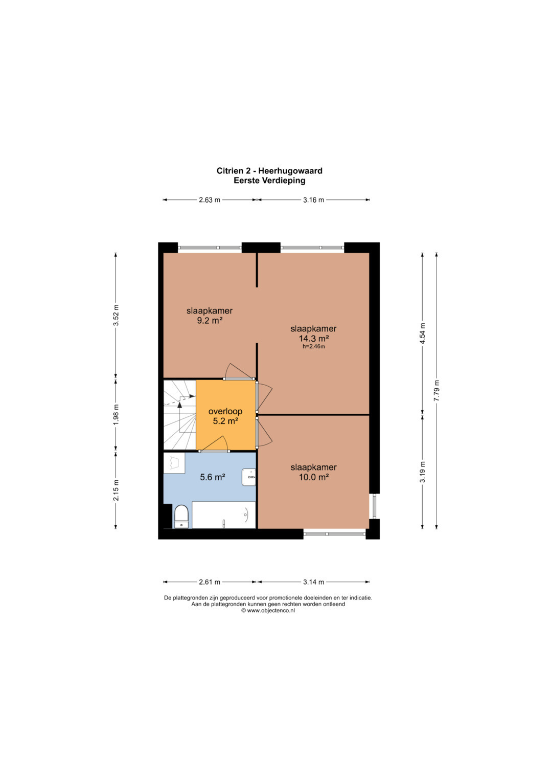 Op de eerste verdieping bereikt u via de overloop de drie slaapkamers van ca. 14 m², 10 m² en 9 m². De twee slaapkamers aan de tuinzijde zijn samengevoegd. U kunt ervoor kiezen dit zo te houden, maar u kunt ze ook weer van elkaar scheiden.