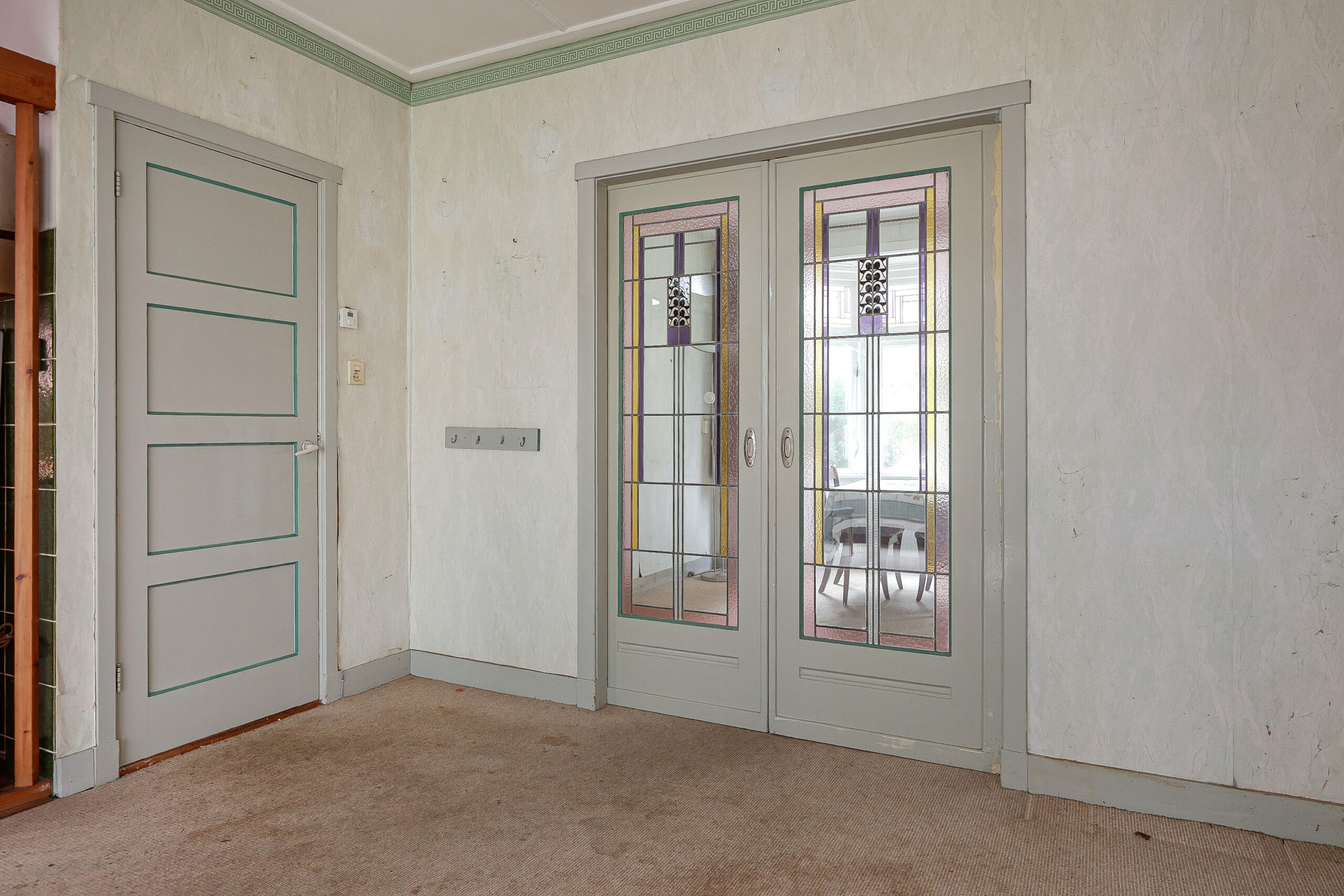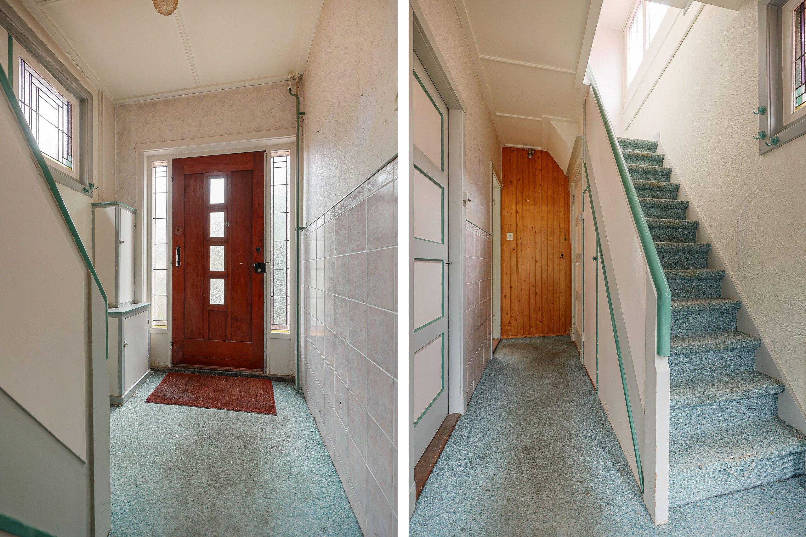 Via de ruime hal met trapopgang, trapkast en toilet betreedt u de woning. Hier zijn nog mooie originele details aanwezig, zoals de deur en glas-in-loodramen. Vanuit de hal bereikt u zowel de voorkamer als de woonkamer.