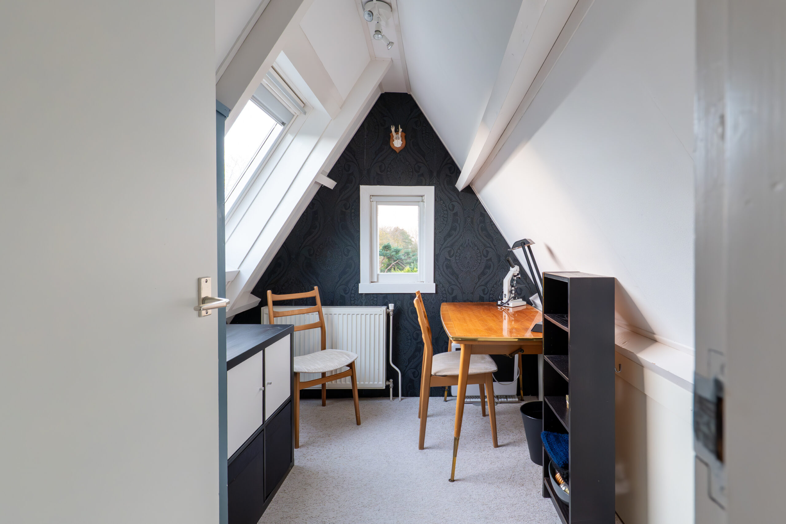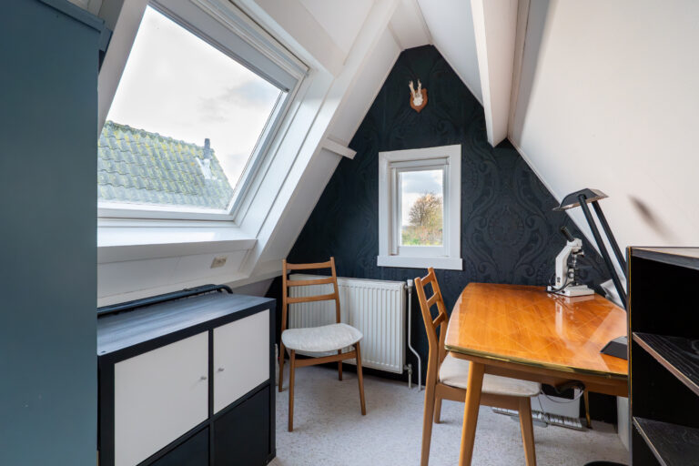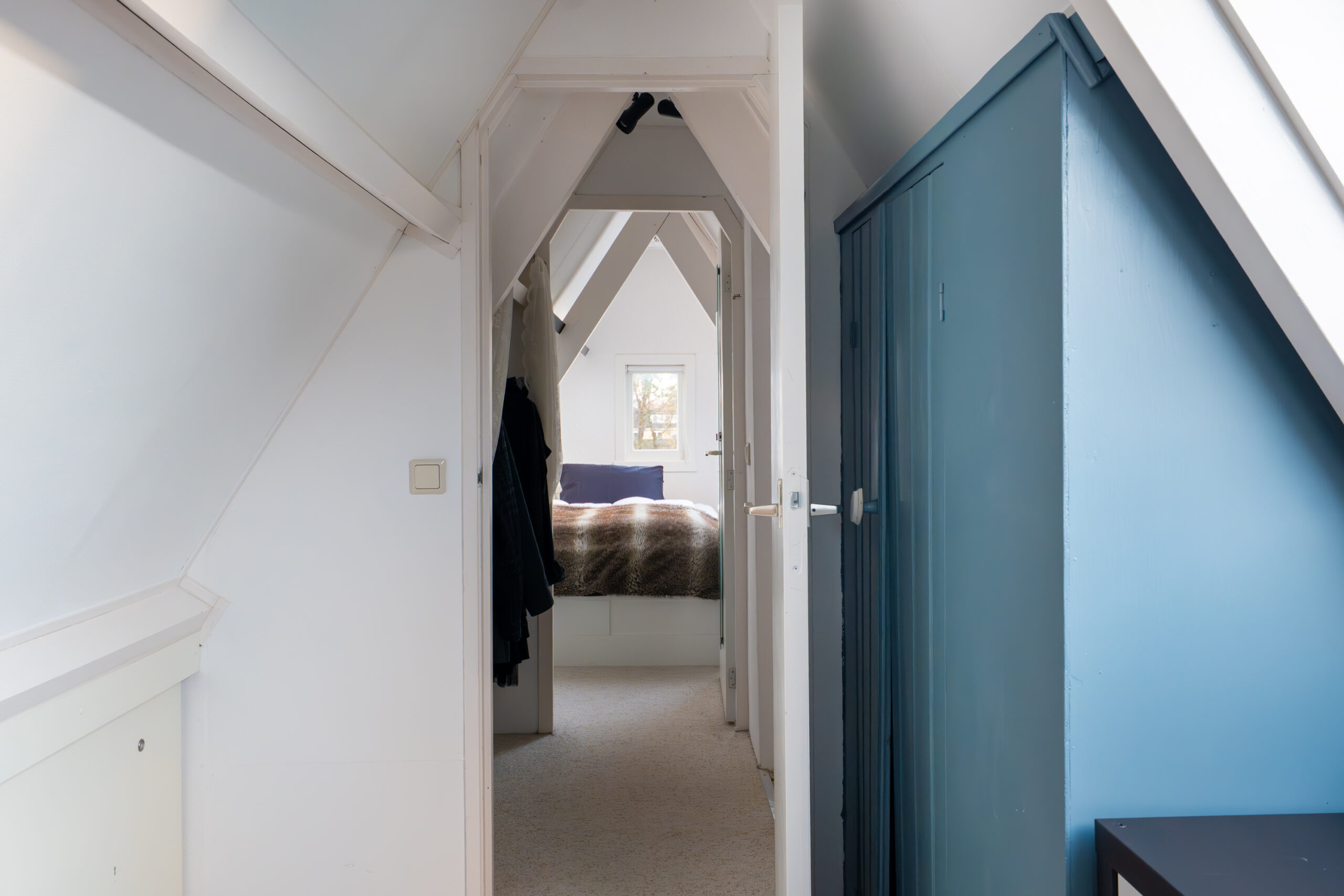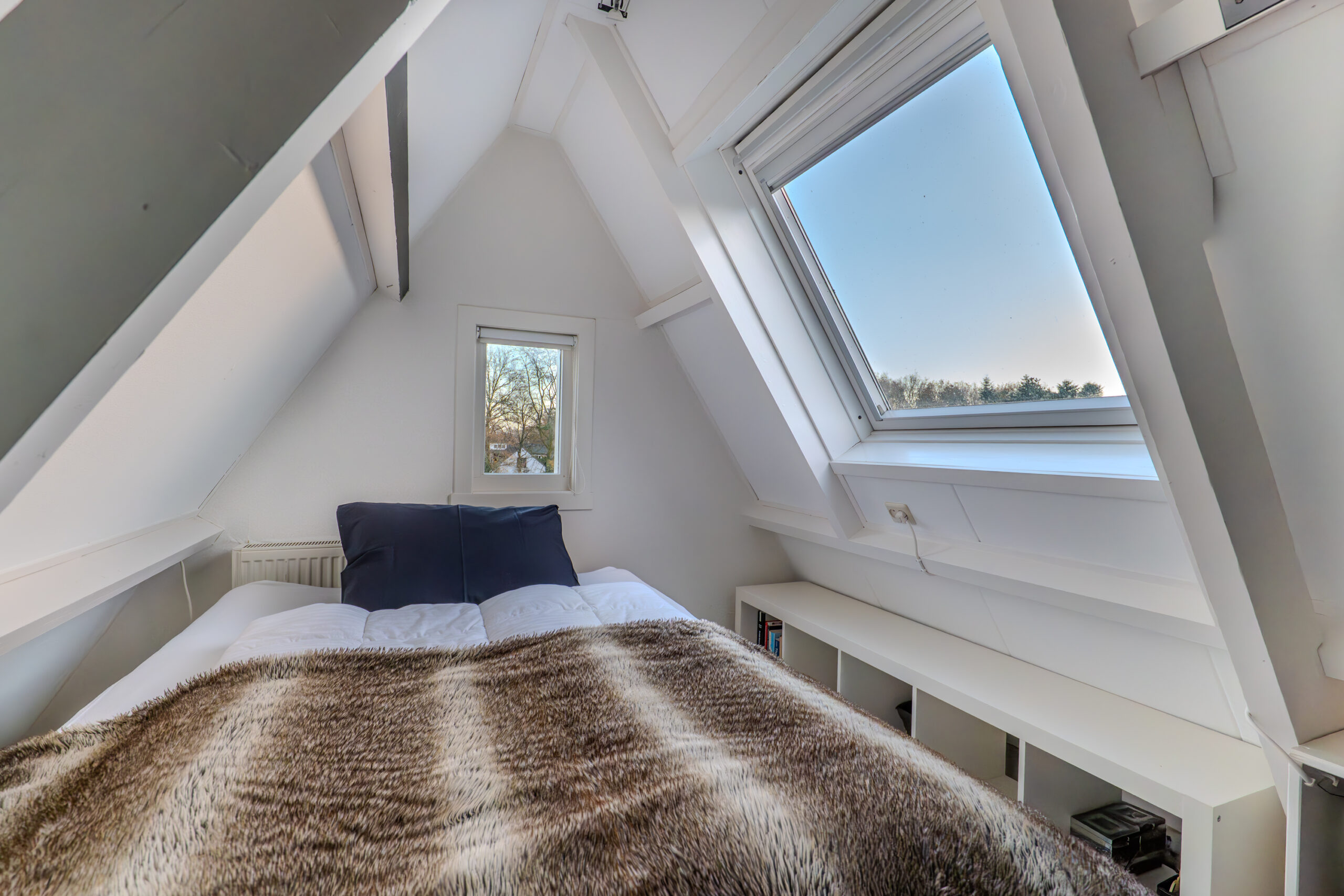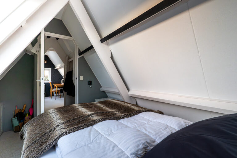 Een vaste trap brengt u naar de tweede verdieping met schuine kap. Hier bevinden zich twee slaapkamers van 11 m² en 7 m², beide voorzien van dakramen. De slaapkamer aan de achterzijde beschikt bovendien over een vaste kast.