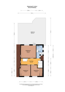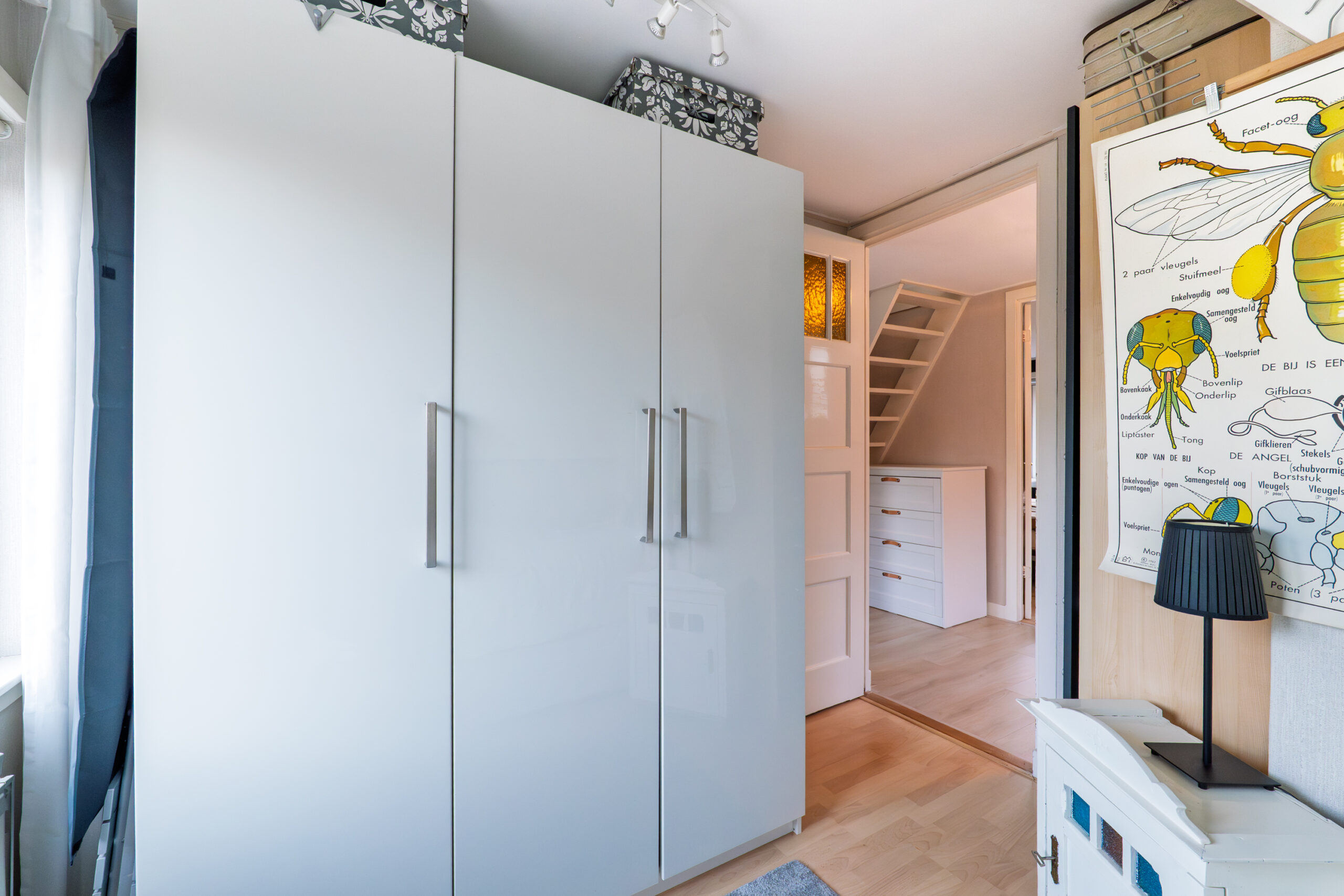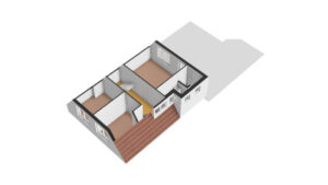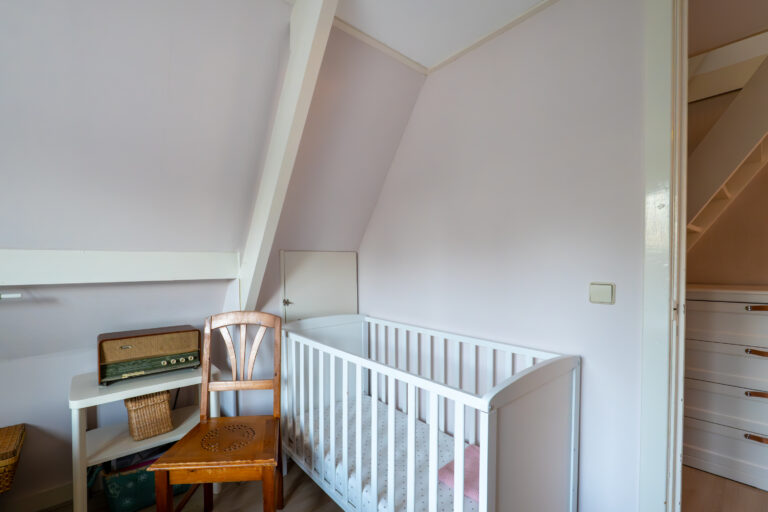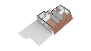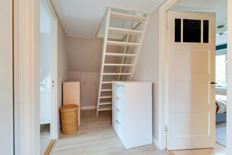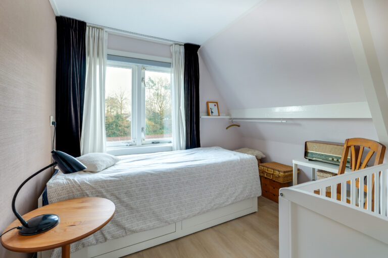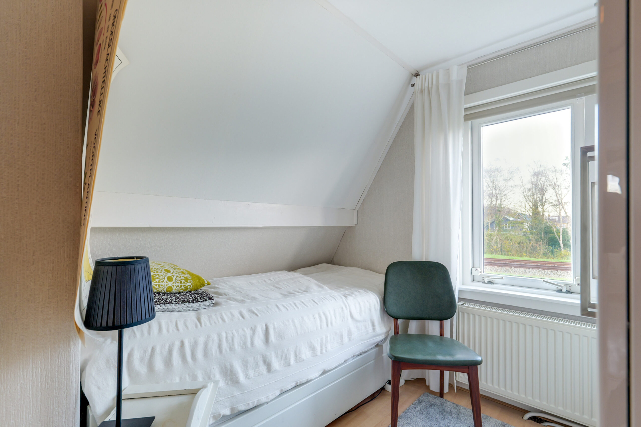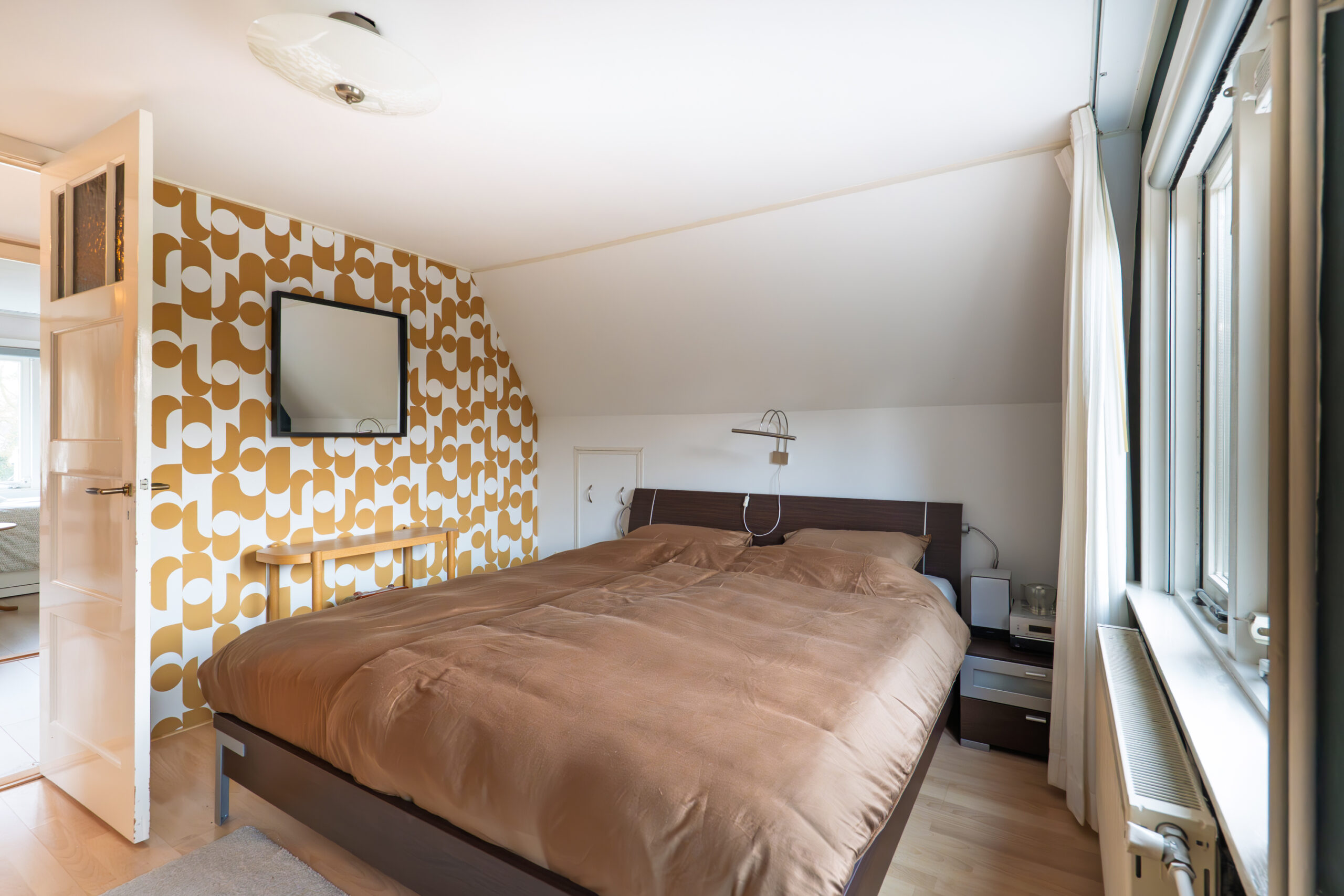 Een vaste trap brengt u naar de tweede verdieping met schuine kap. Hier bevinden zich twee slaapkamers van 11 m² en 7 m², beide voorzien van dakramen. De slaapkamer aan de achterzijde beschikt bovendien over een vaste kast.