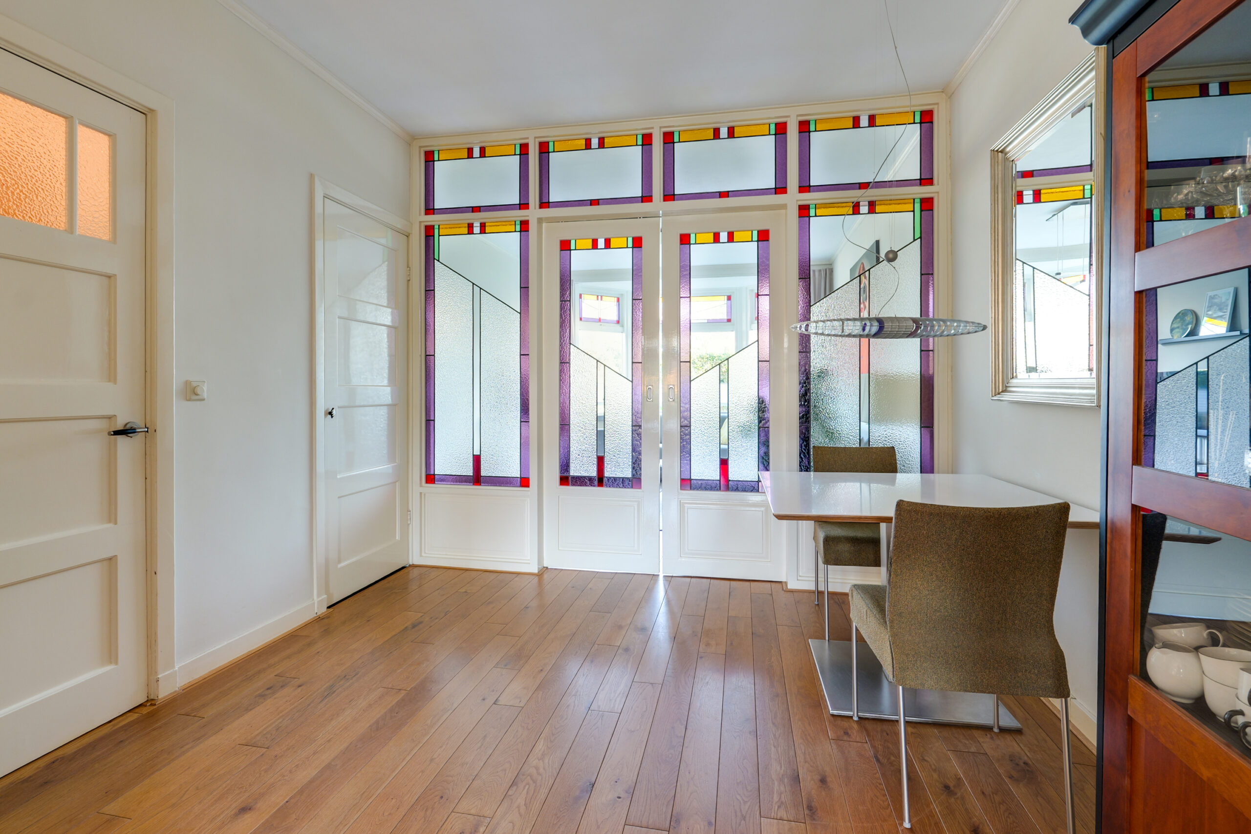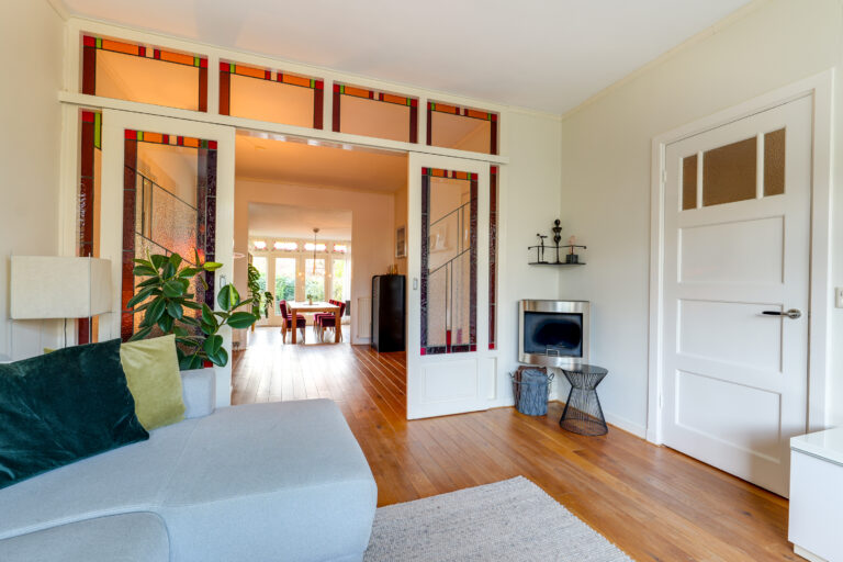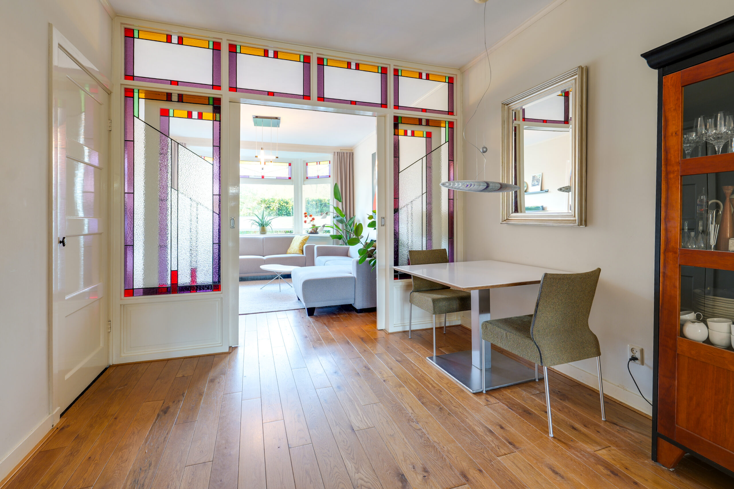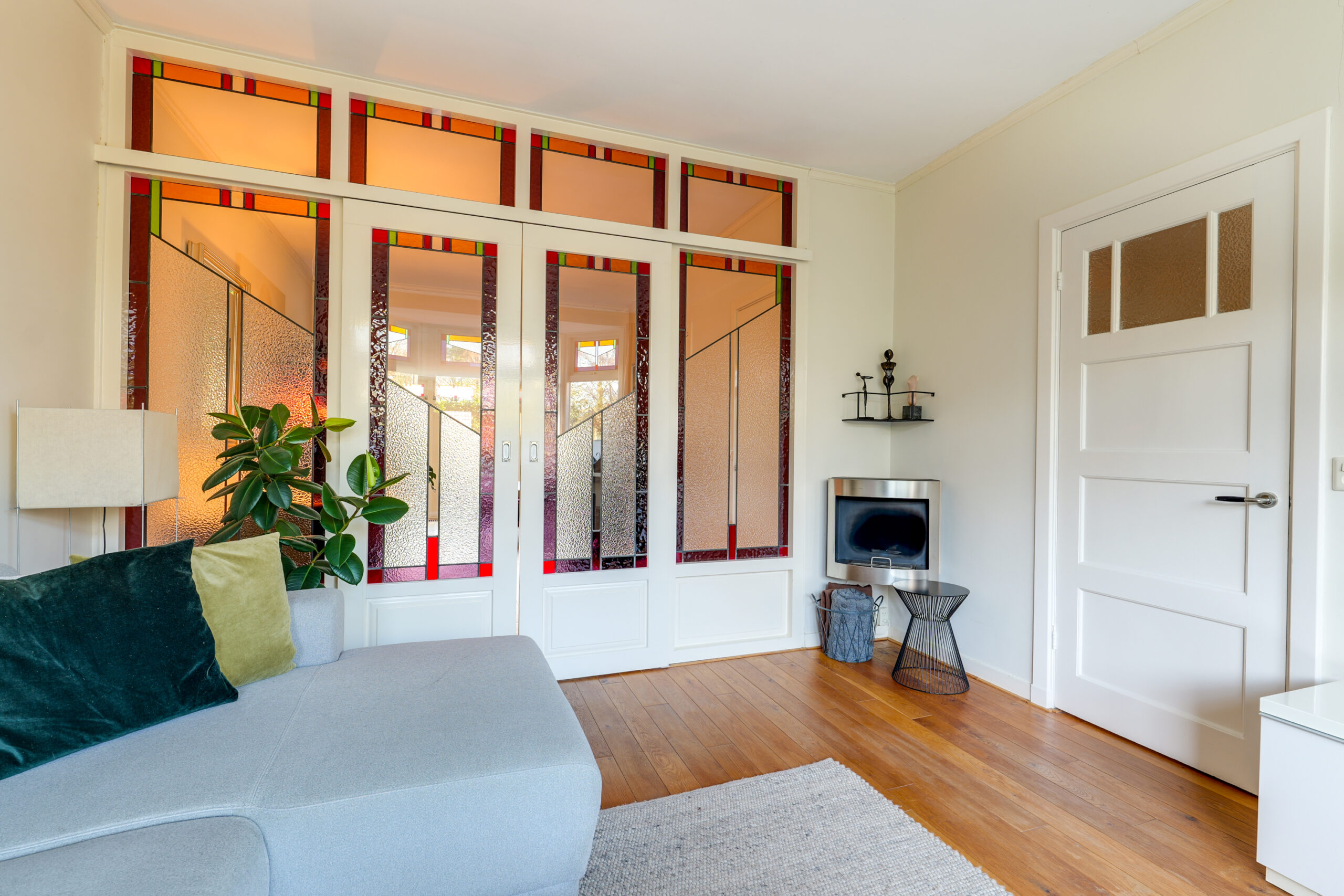 Vanuit de hal bereikt u zowel de werkkamer als de woonkamer. Aan de voorzijde van de woonkamer bevindt zich een mooie erker met kleurrijk glas-in-lood en voorzetramen. De en suite schuifdeuren zorgen ervoor dat de ruimte indien gewenst afsluitbaar is. De woonkamer geeft toegang tot een fijne werkkamer van ca. 7 m², ideaal voor thuiswerken.