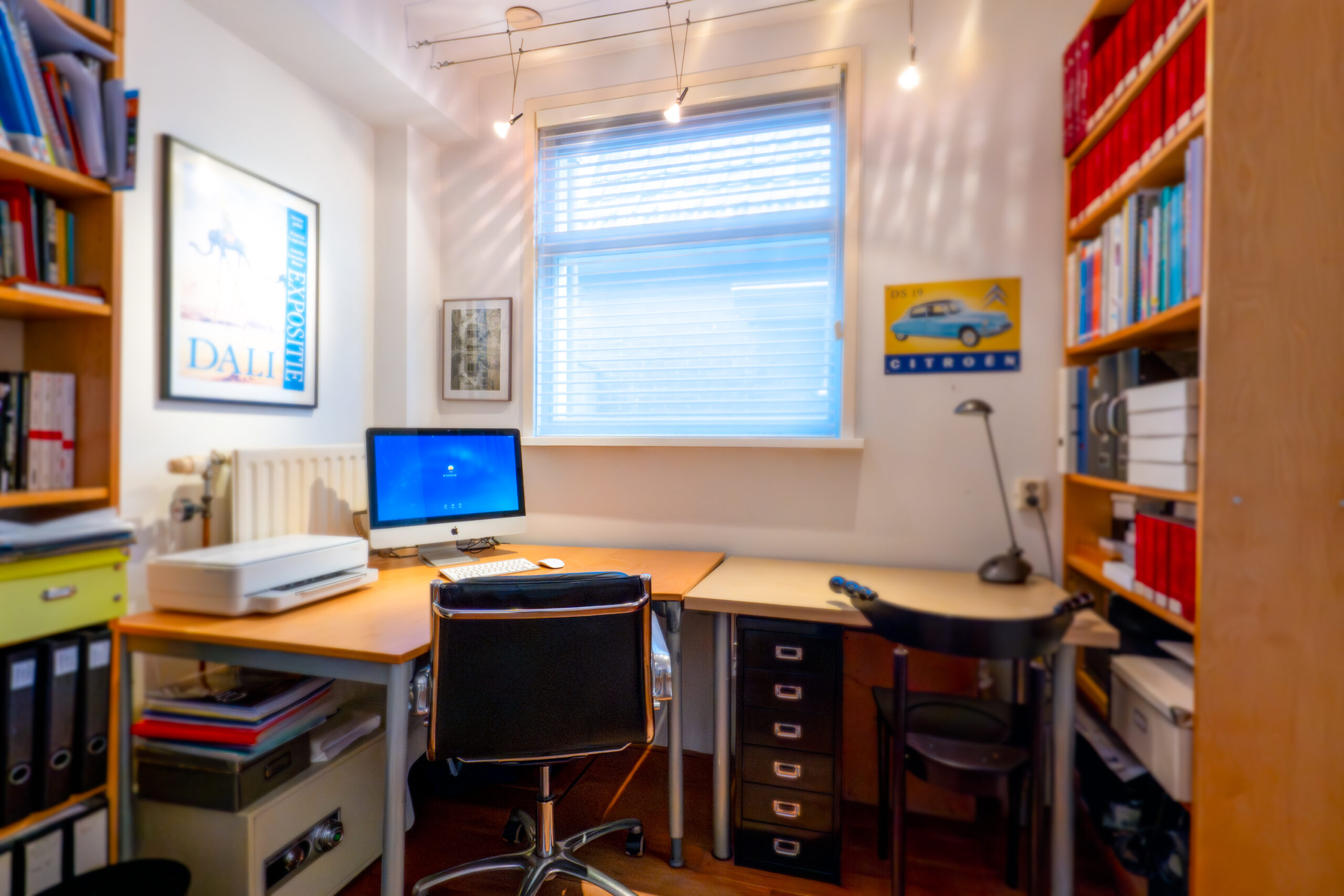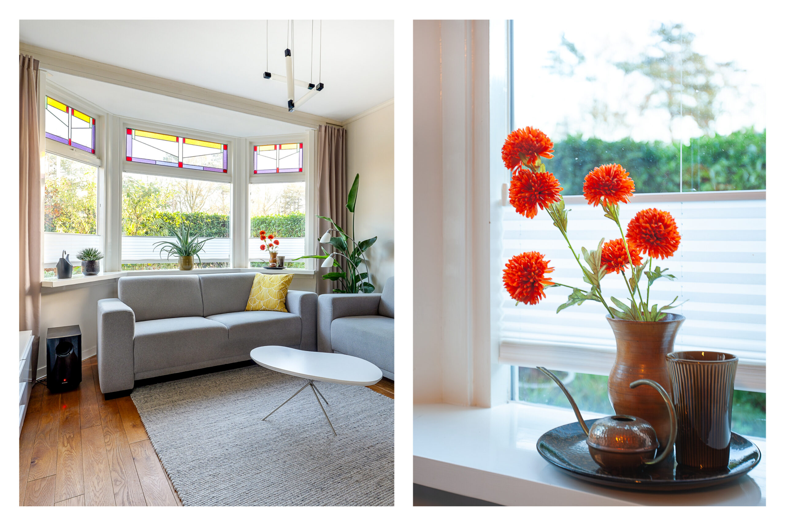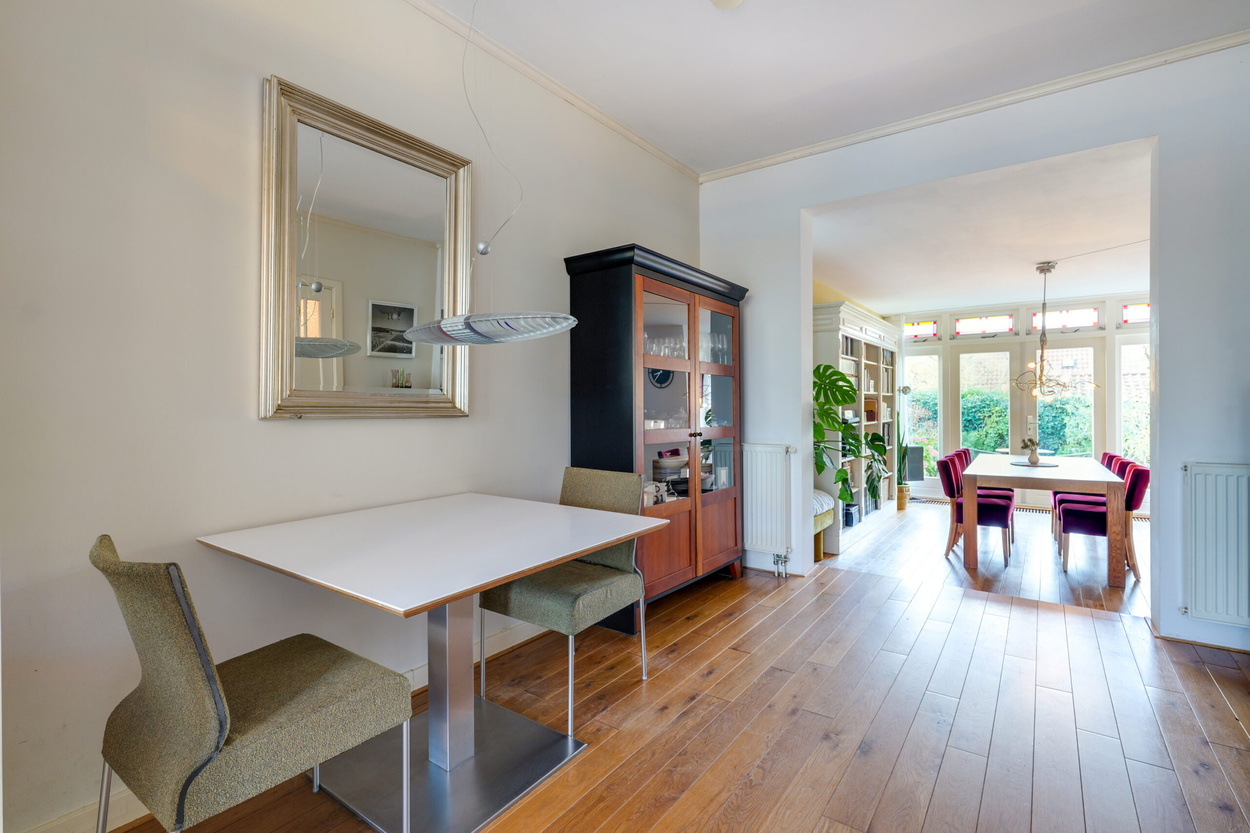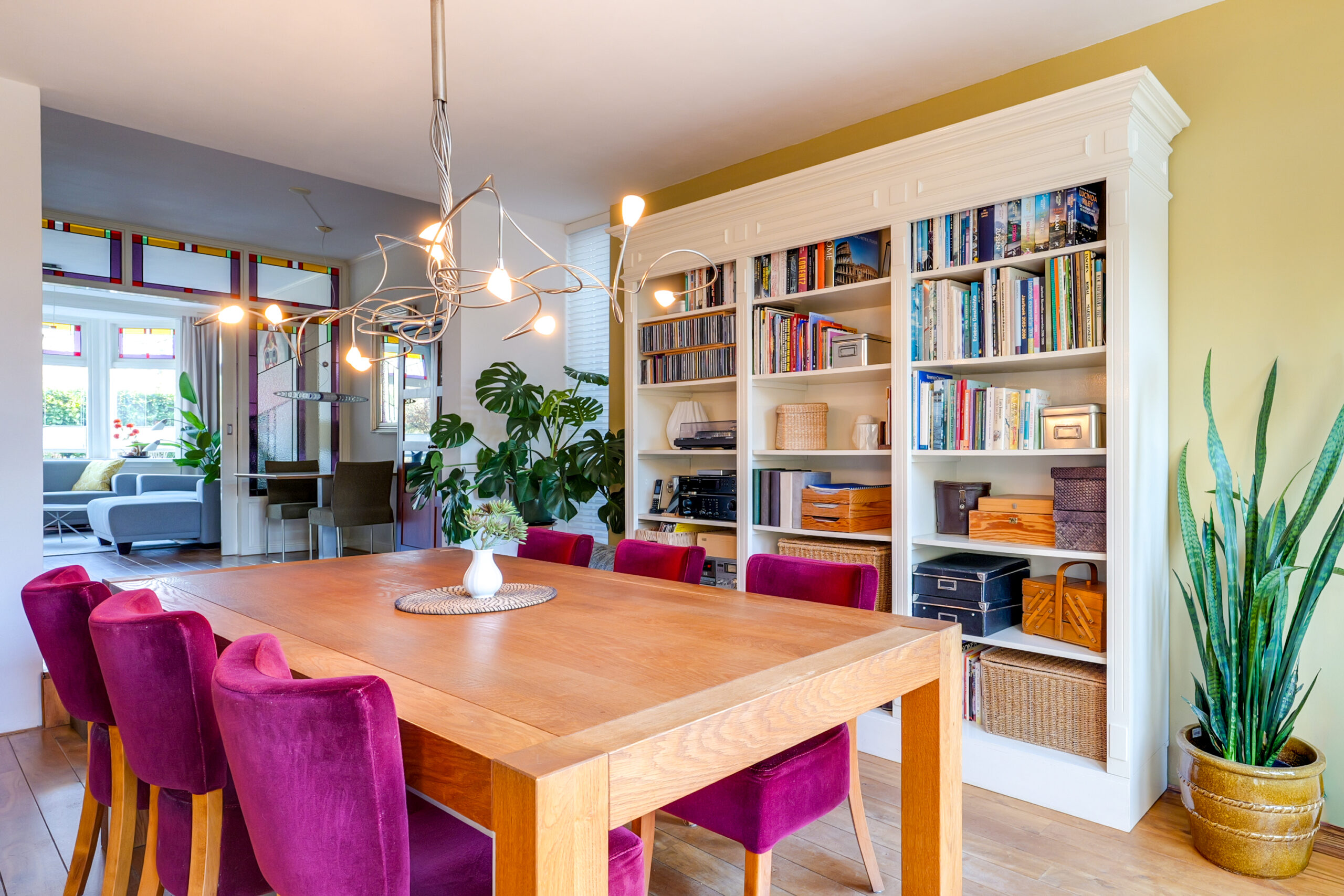 Vanuit de hal bereikt u zowel de werkkamer als de woonkamer. Aan de voorzijde van de woonkamer bevindt zich een mooie erker met kleurrijk glas-in-lood en voorzetramen. De en suite schuifdeuren zorgen ervoor dat de ruimte indien gewenst afsluitbaar is. De woonkamer geeft toegang tot een fijne werkkamer van ca. 7 m², ideaal voor thuiswerken.