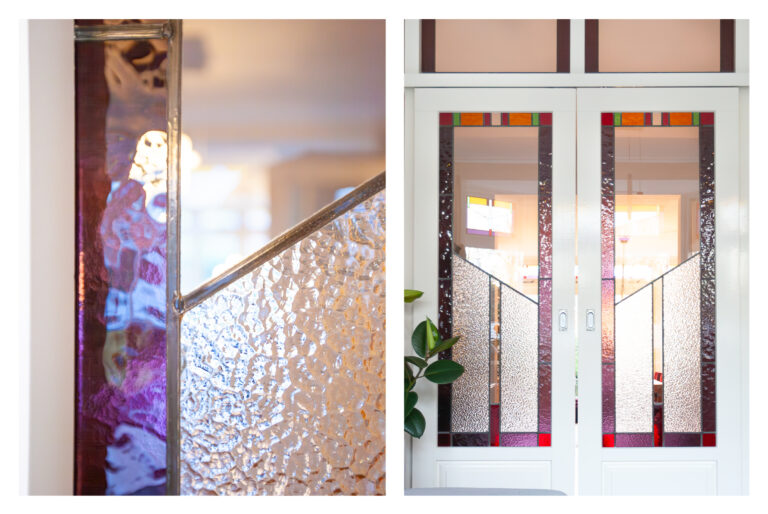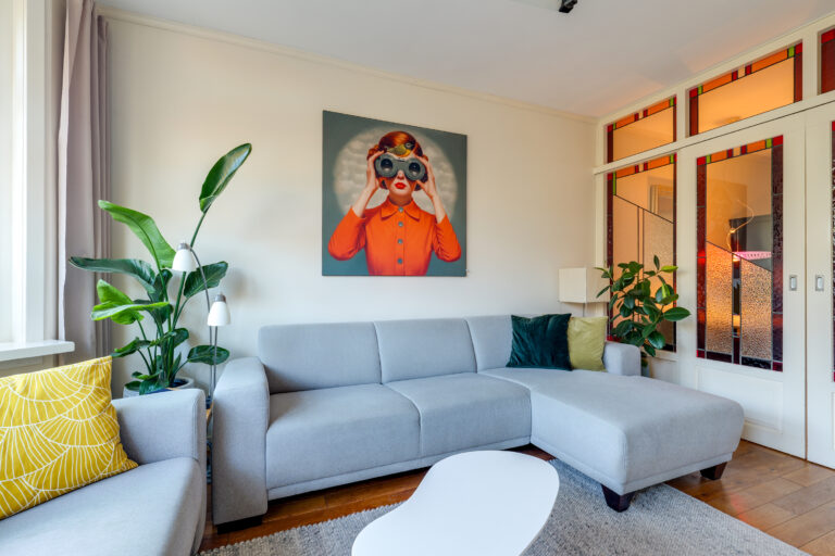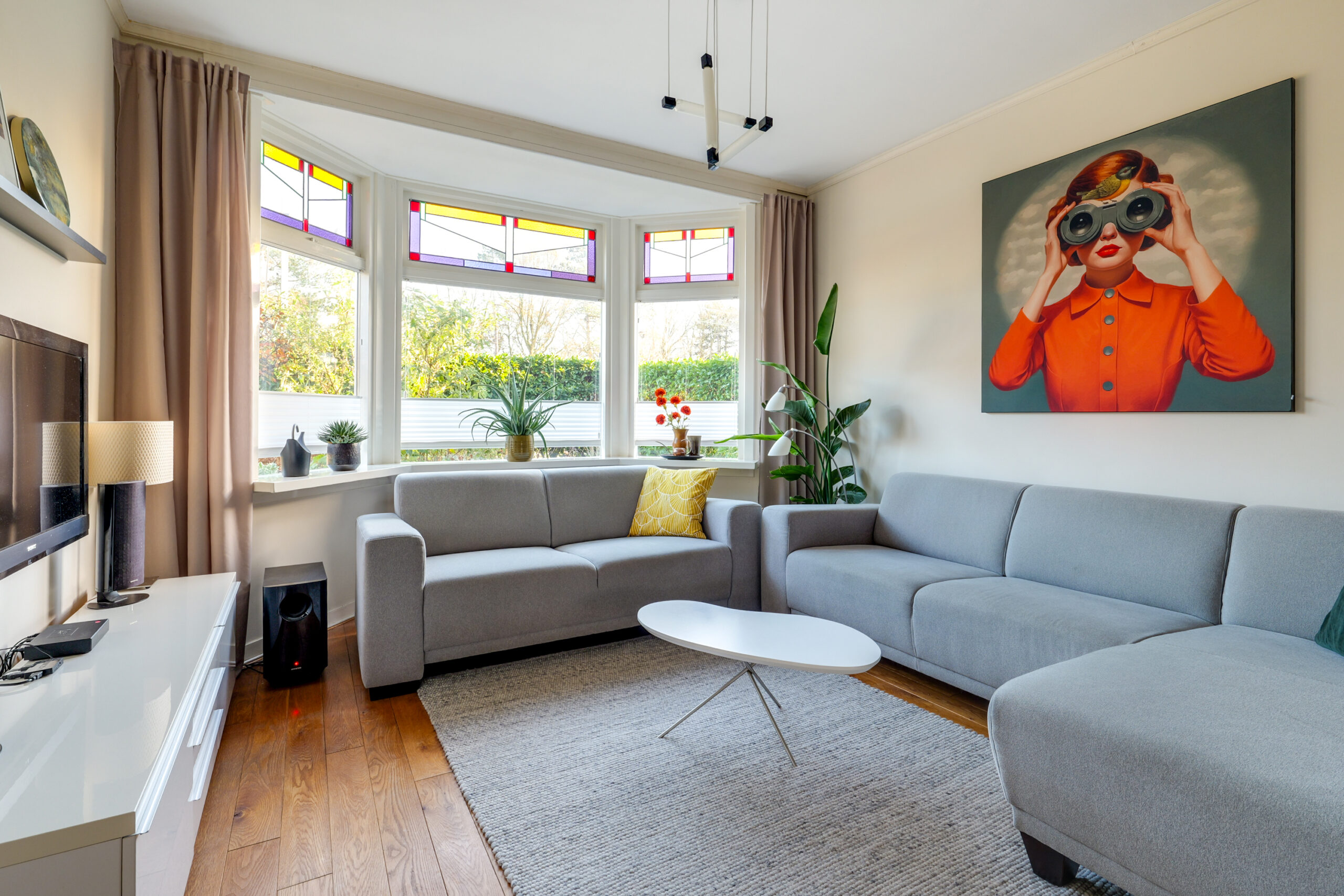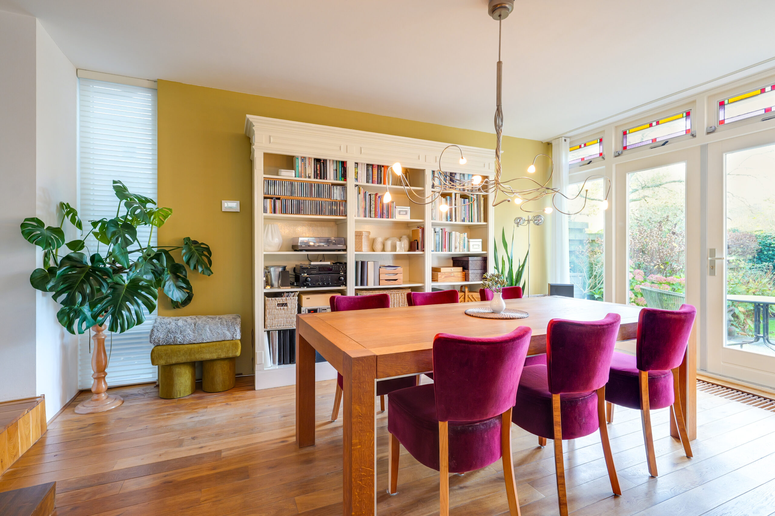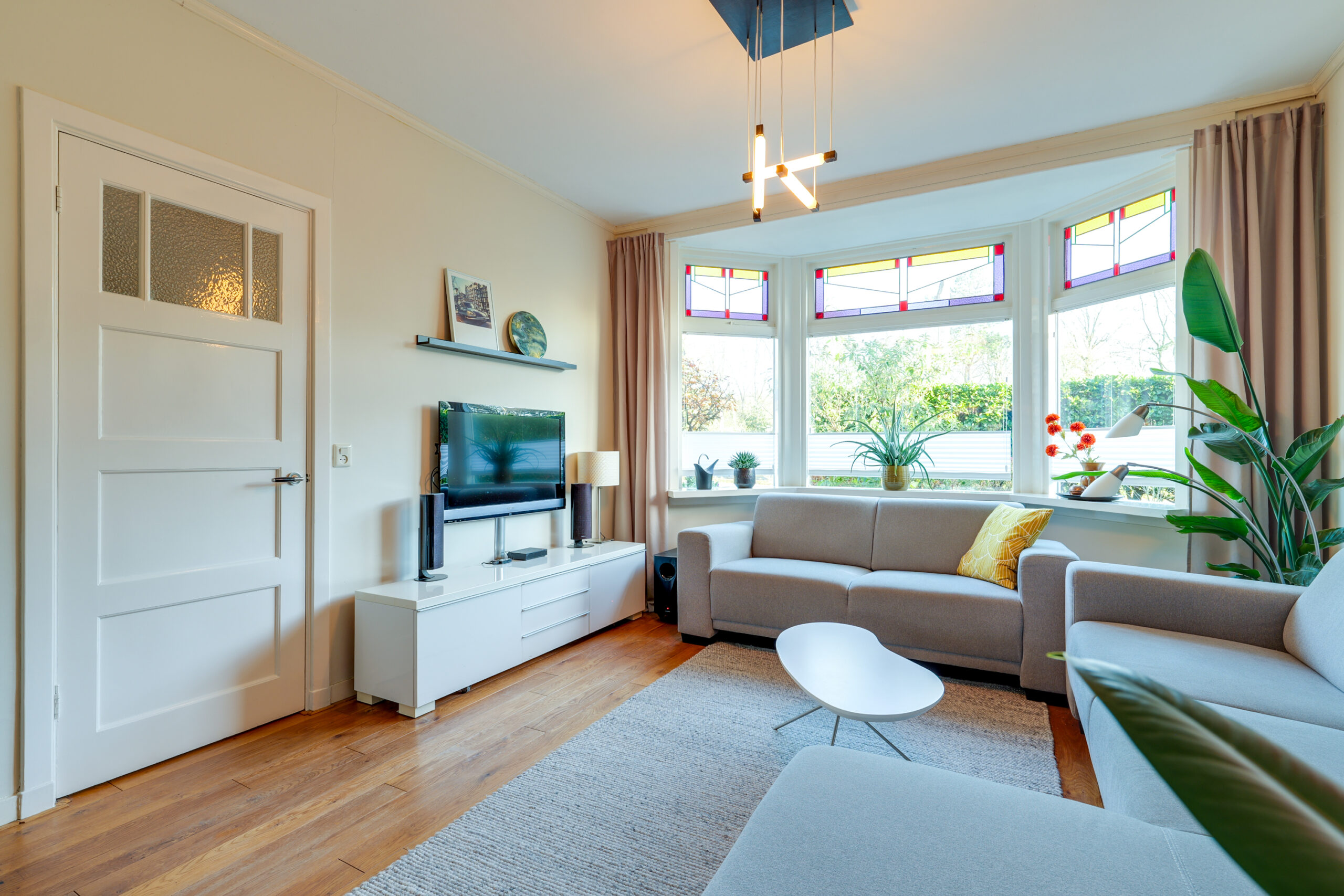 Vanuit de hal bereikt u zowel de werkkamer als de woonkamer. Aan de voorzijde van de woonkamer bevindt zich een mooie erker met kleurrijk glas-in-lood en voorzetramen. De en suite schuifdeuren zorgen ervoor dat de ruimte indien gewenst afsluitbaar is. De woonkamer geeft toegang tot een fijne werkkamer van ca. 7 m², ideaal voor thuiswerken.