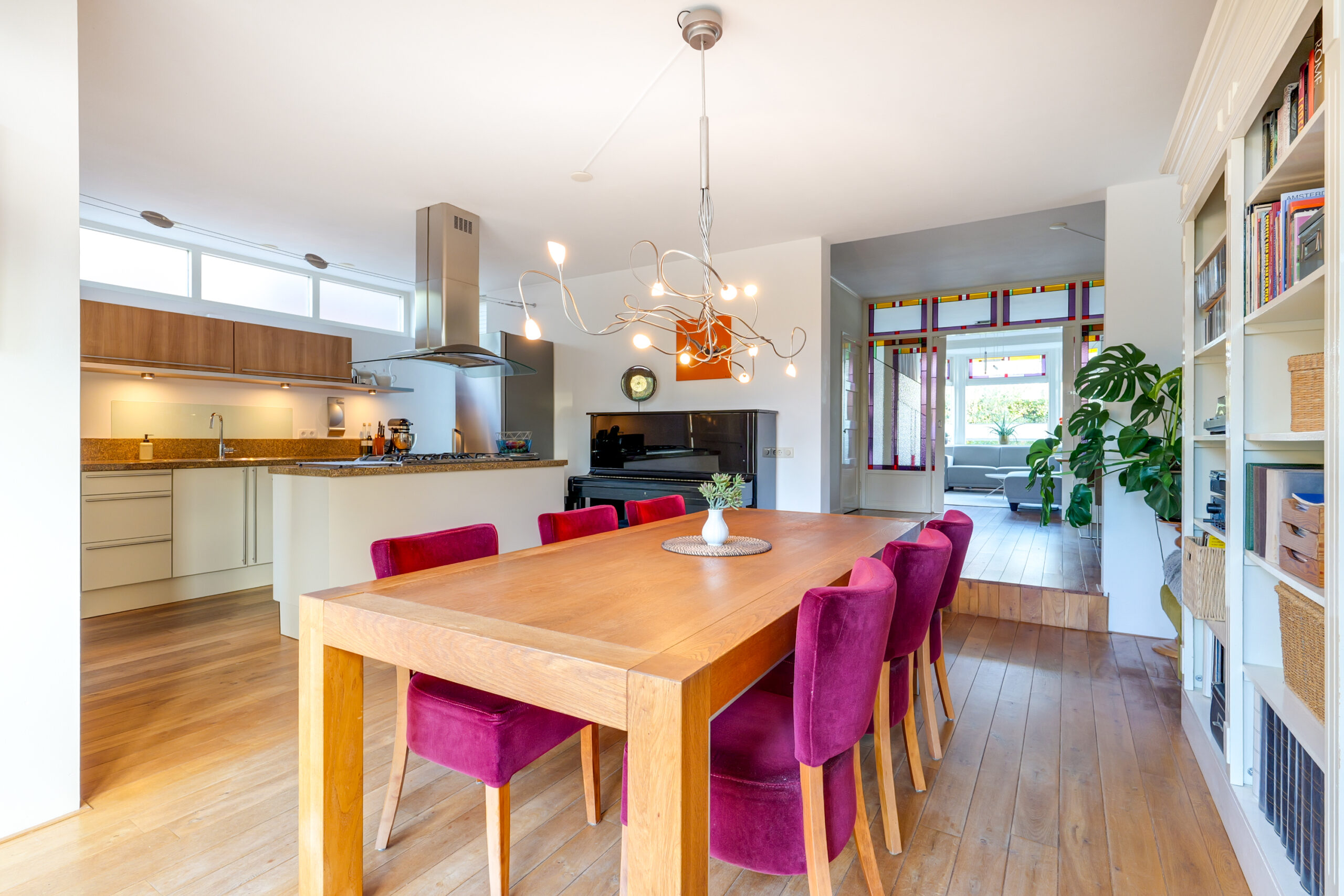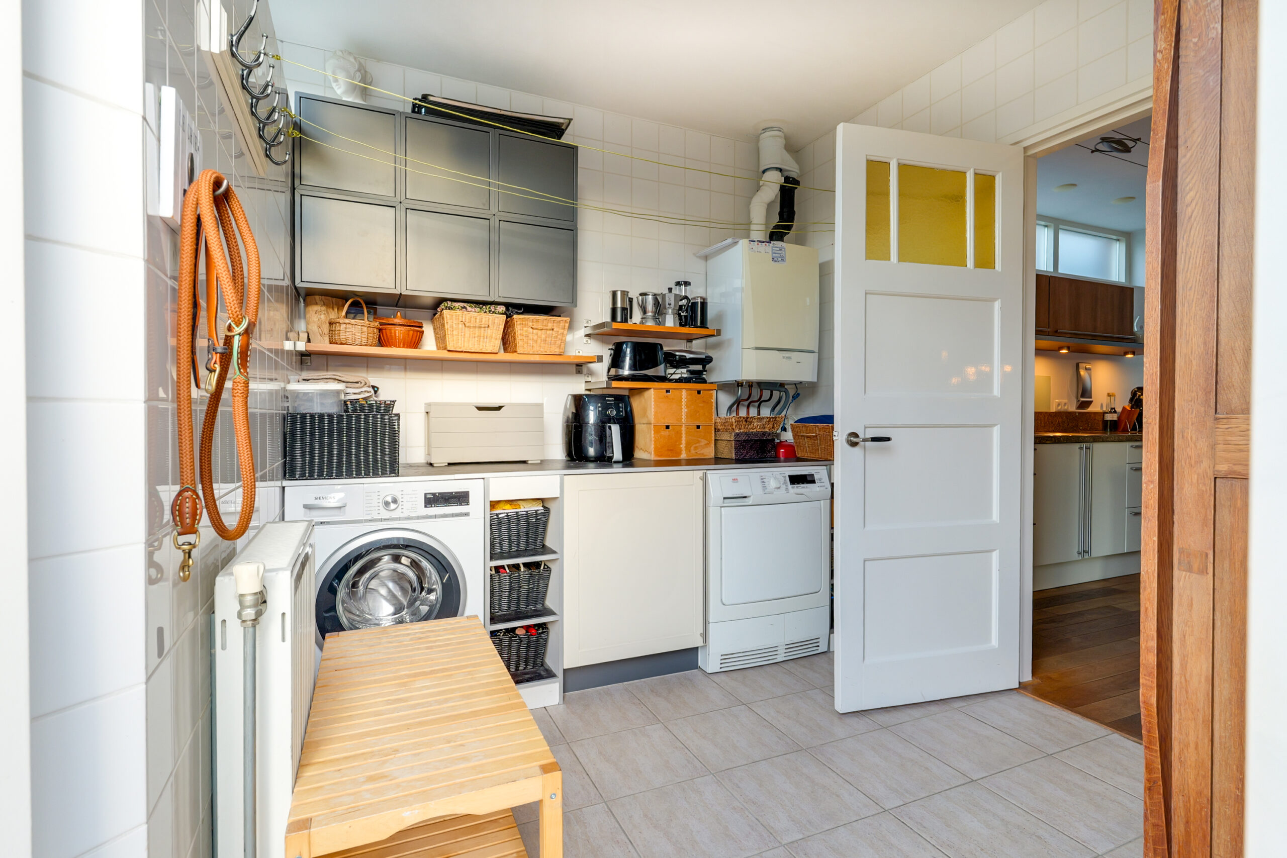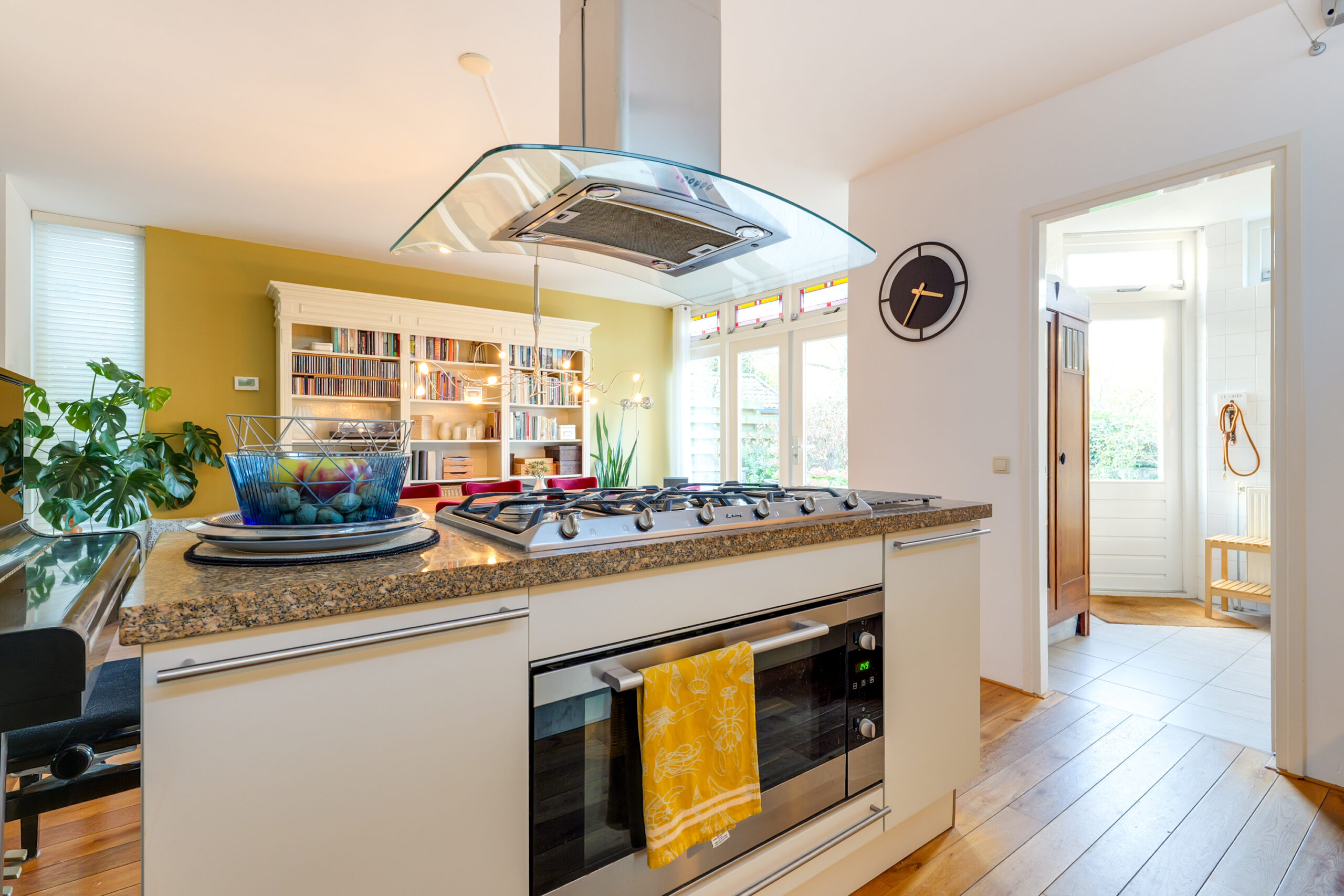 In het aangebouwde deel van ca. 29 m² bevindt zich de ruime open keuken met kookeiland en royale eetplek. Een heerlijke ruimte om samen te tafelen. De keuken is voorzien van een vaatwasser, oven, 5-pits gaskookplaat, afzuigkap en een vrijstaande koel-vriescombinatie. Aansluitend bereikt u de bijkeuken, waar wasmachine, droger en cv-ketel zijn geplaatst. De gehele begane grond heeft een nette houten vloer.