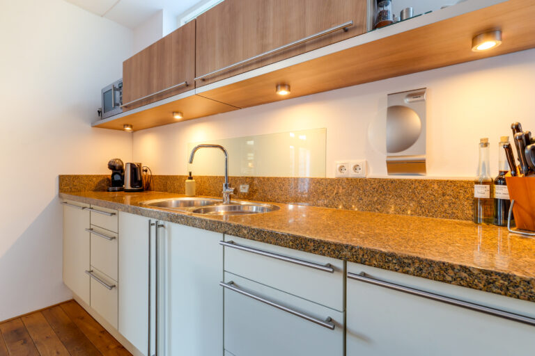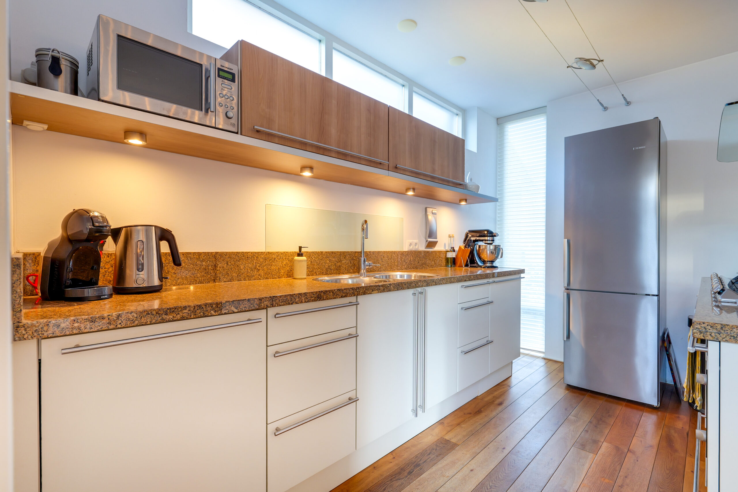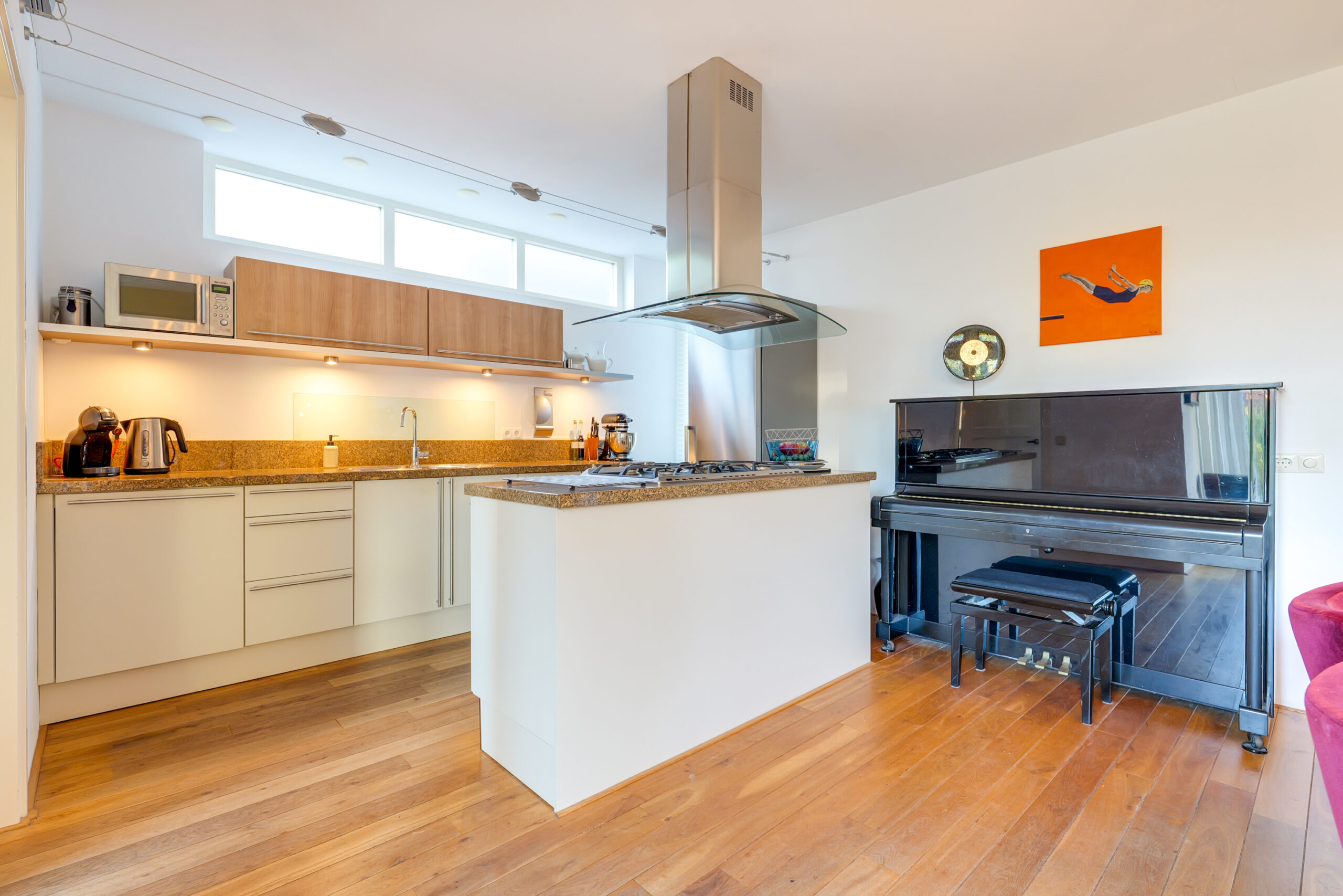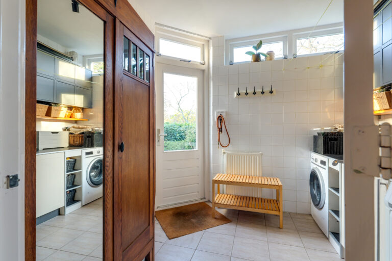 In het aangebouwde deel van ca. 29 m² bevindt zich de ruime open keuken met kookeiland en royale eetplek. Een heerlijke ruimte om samen te tafelen. De keuken is voorzien van een vaatwasser, oven, 5-pits gaskookplaat, afzuigkap en een vrijstaande koel-vriescombinatie. Aansluitend bereikt u de bijkeuken, waar wasmachine, droger en cv-ketel zijn geplaatst. De gehele begane grond heeft een nette houten vloer.