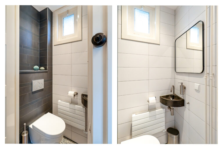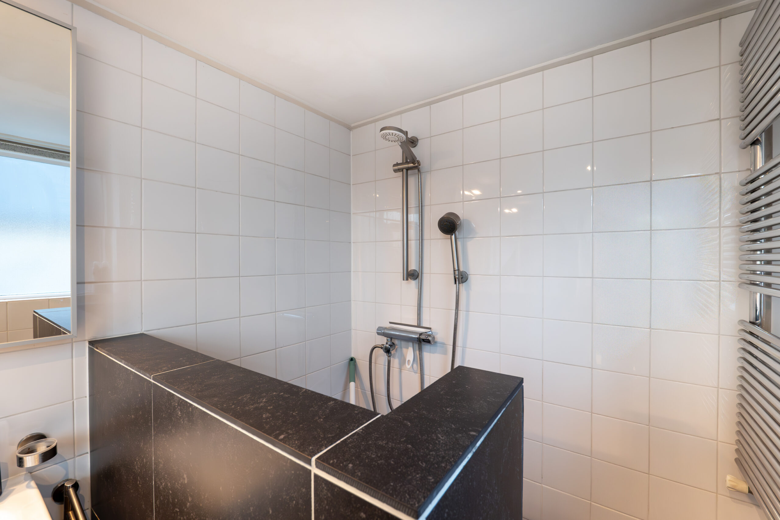 Daarnaast vindt u op deze verdieping de moderne badkamer (ca. 4 m²), uitgerust met een inloopdouche, wastafelmeubel, designradiator en een tweede toilet. De badkamer is voorzien van vloerverwarming.