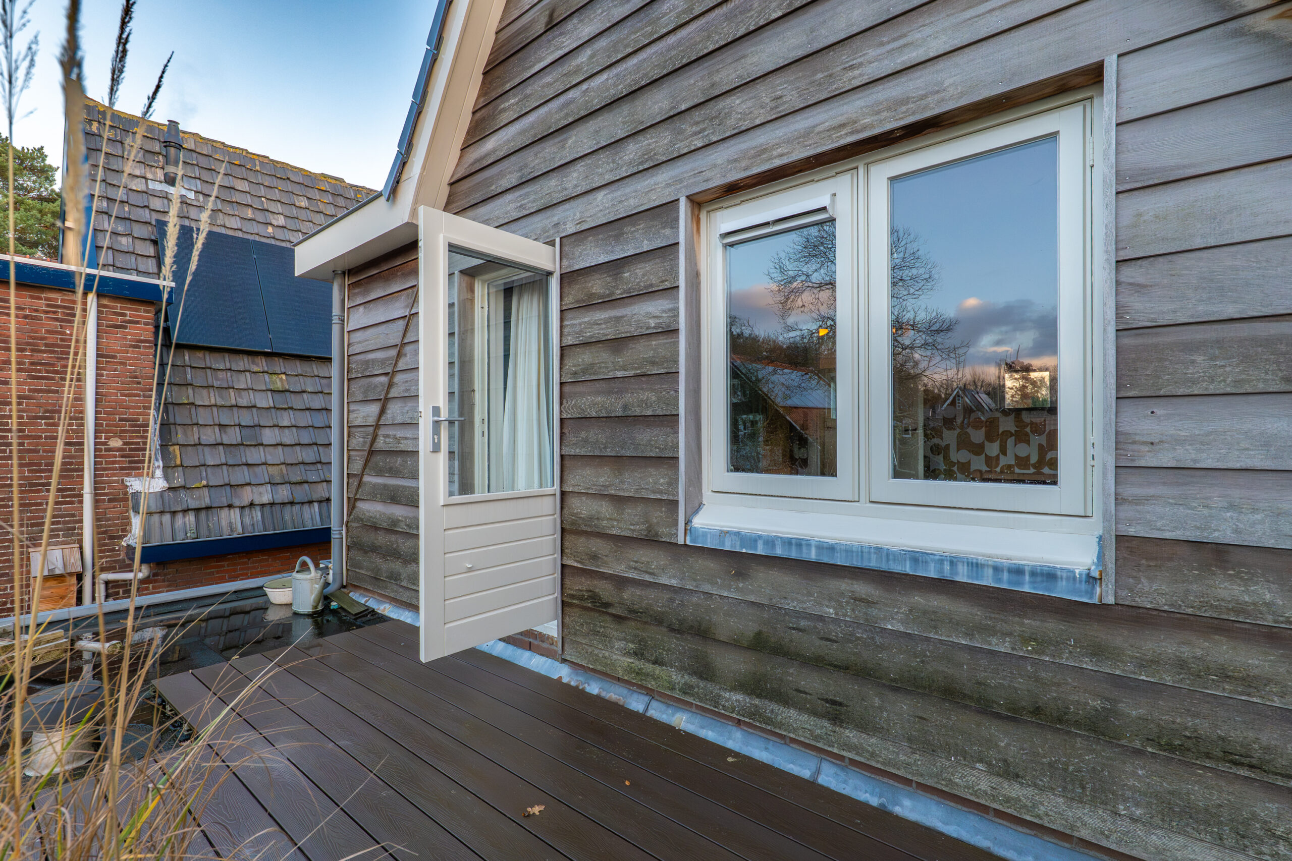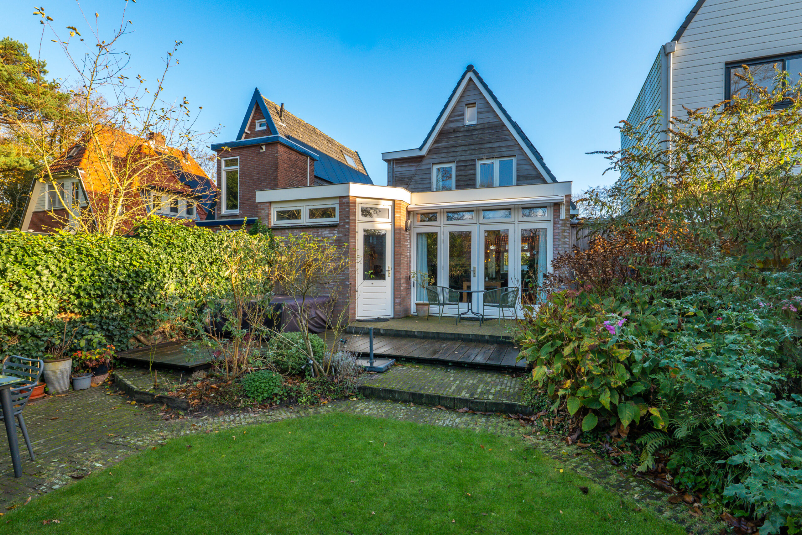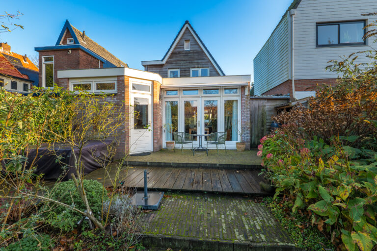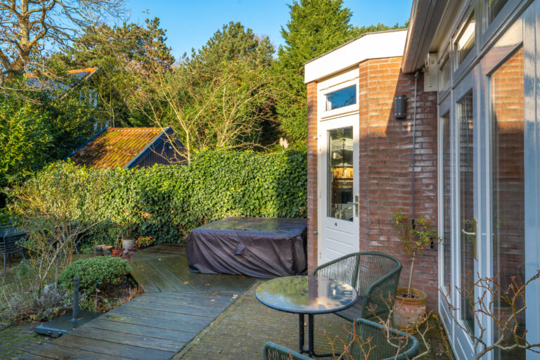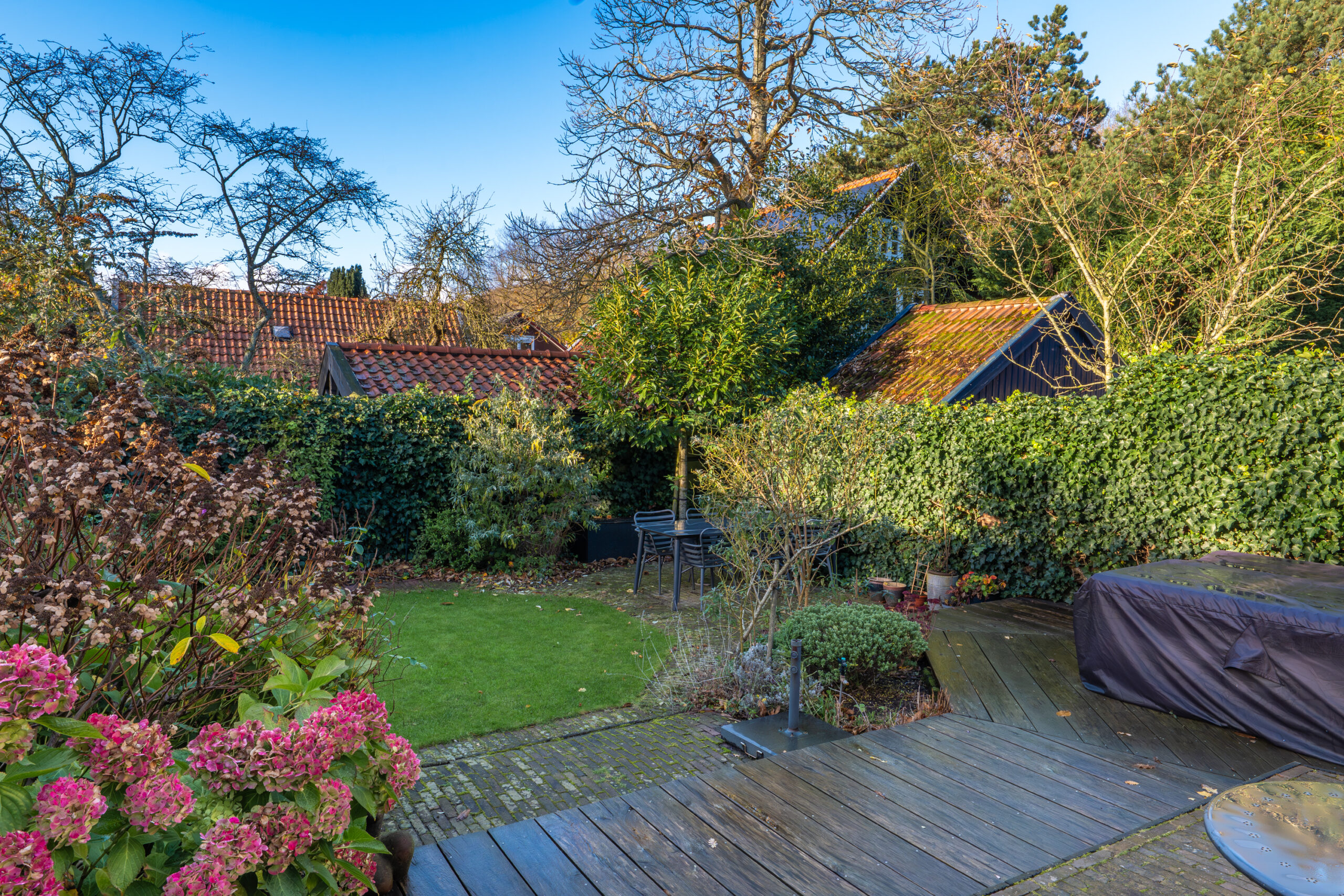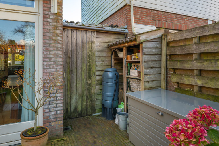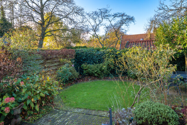 Via de openslaande deuren bereikt u de fraai verzorgde achtertuin. Deze ligt op het noordwesten en biedt volop ruimte voor spelende kinderen, ontspannen in de zon of gezellig dineren op zomeravonden. De tuin is tevens bereikbaar via een afsluitbare poort aan de linkerzijde van het huis. Hier vindt u een houten berging, ideaal voor fietsen, tuingereedschap, tuinmeubelen en de houtvoorraad.