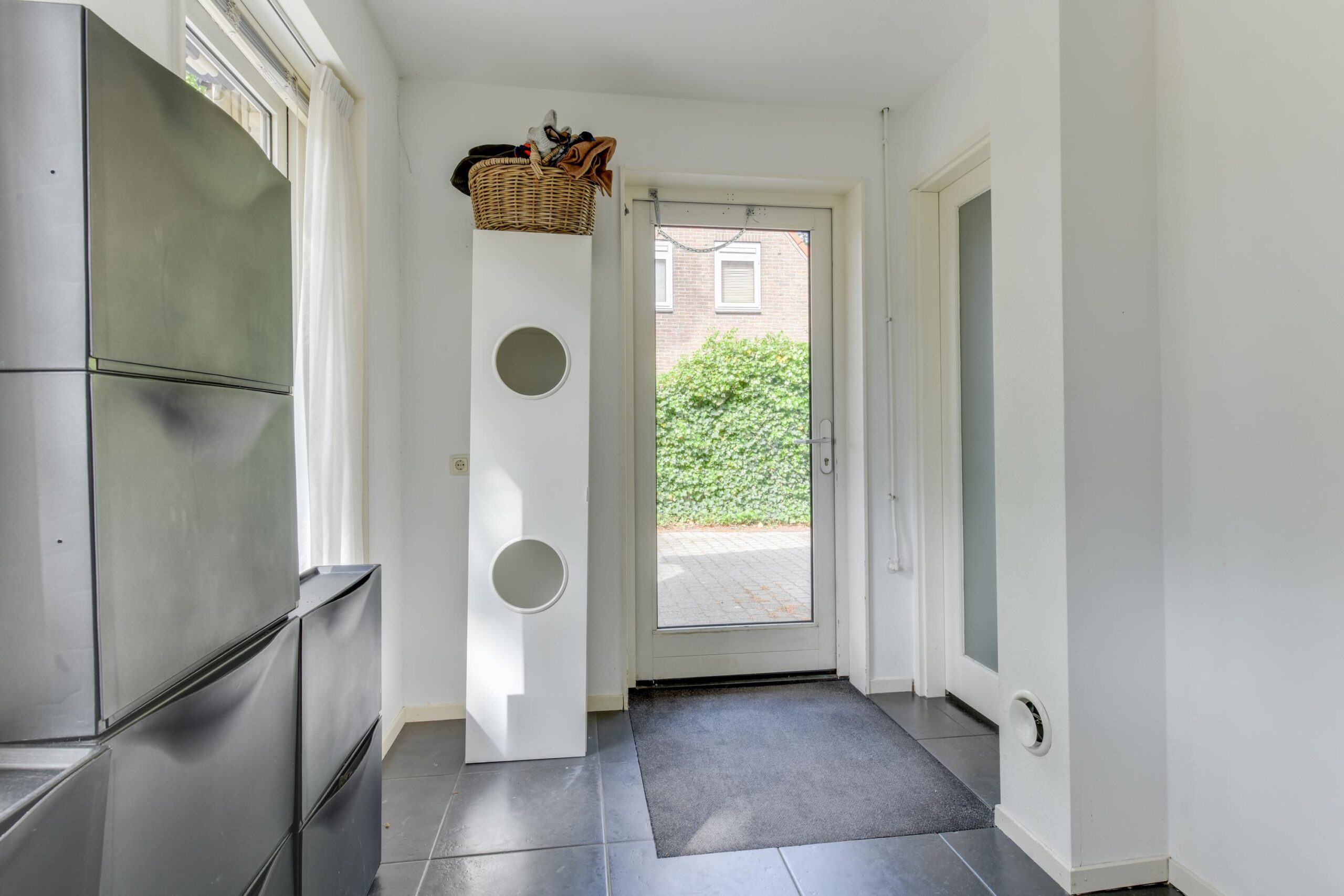 Bij binnenkomst betreedt u de ruime hal (ca. 9 m²) met trapopgang naar de eerste verdieping, een toilet met fonteintje, de meterkast en de toegang tot het kantoor, die voor diverse doeleinden geschikt is. Vanuit de hal komt u in de lichte woonkamer, met openslaande deuren naar de achtertuin. De woonkamer is voorzien van een gashaard. De keuken heeft een moderne keukenblok met een wooneiland voorzien van divers inbouwapparatuur, zoals een 5-pits gaskookplaat, afzuigkap, vaatwasser, oven, combimagnetron en koelkast. Via de keuken komt u in de bijkeuken, waar u o.a. de wasmachine en droger kunt plaatsen.