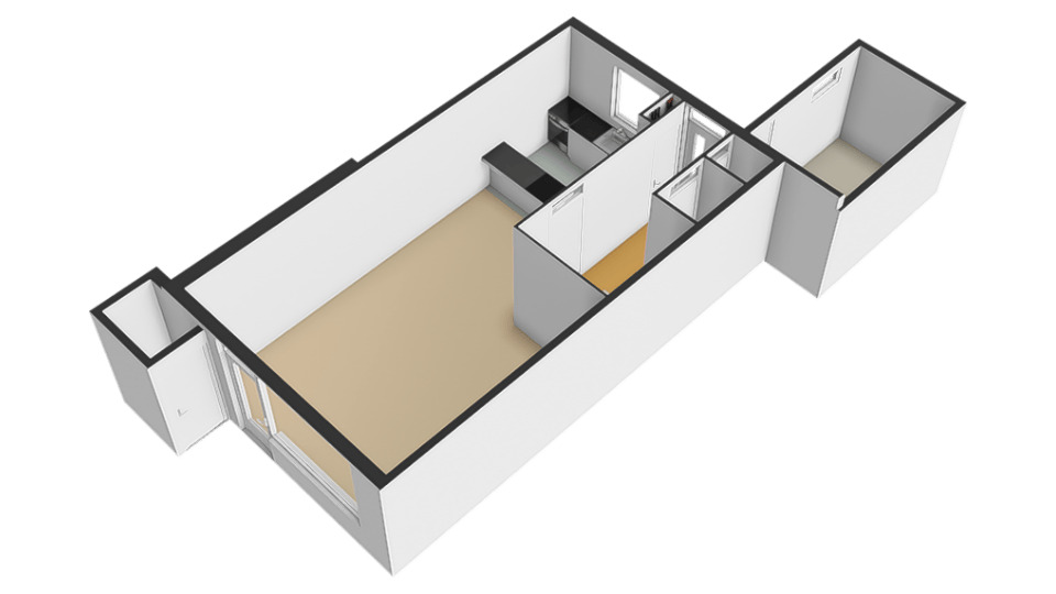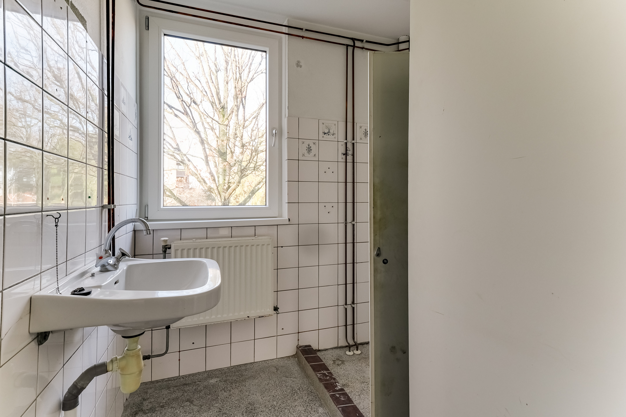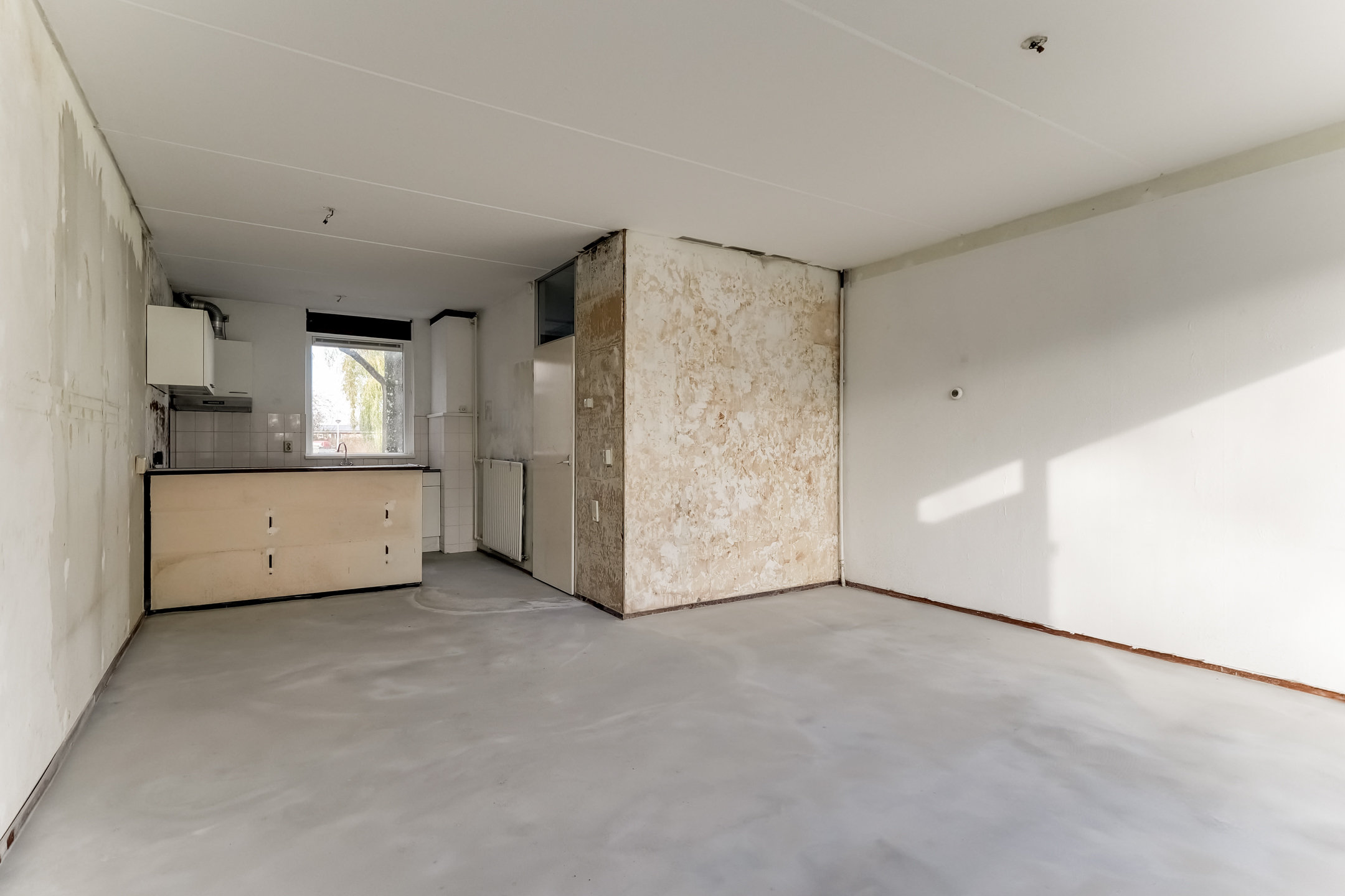 Je komt binnen in de hal met toegang tot de ca. 27 m² grote woonkamer en de keuken. De ruimtes zijn eenvoudig en verdienen modernisering, maar vormen een fijne basis om een sfeervolle leefruimte te creëren. Vanuit de woonkamer bereik je de achtertuin.