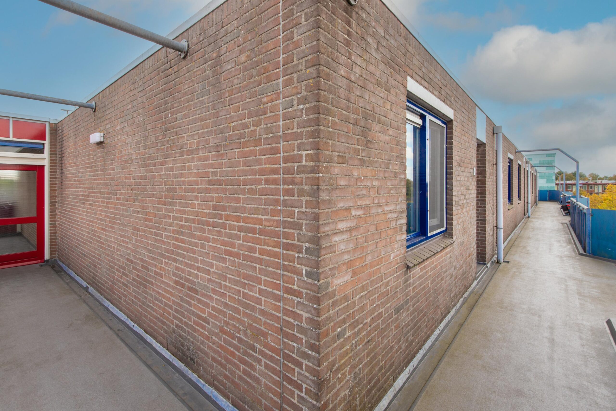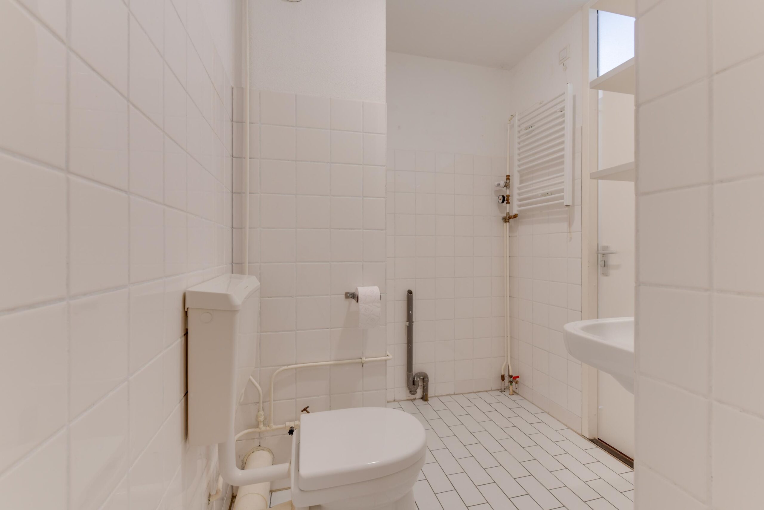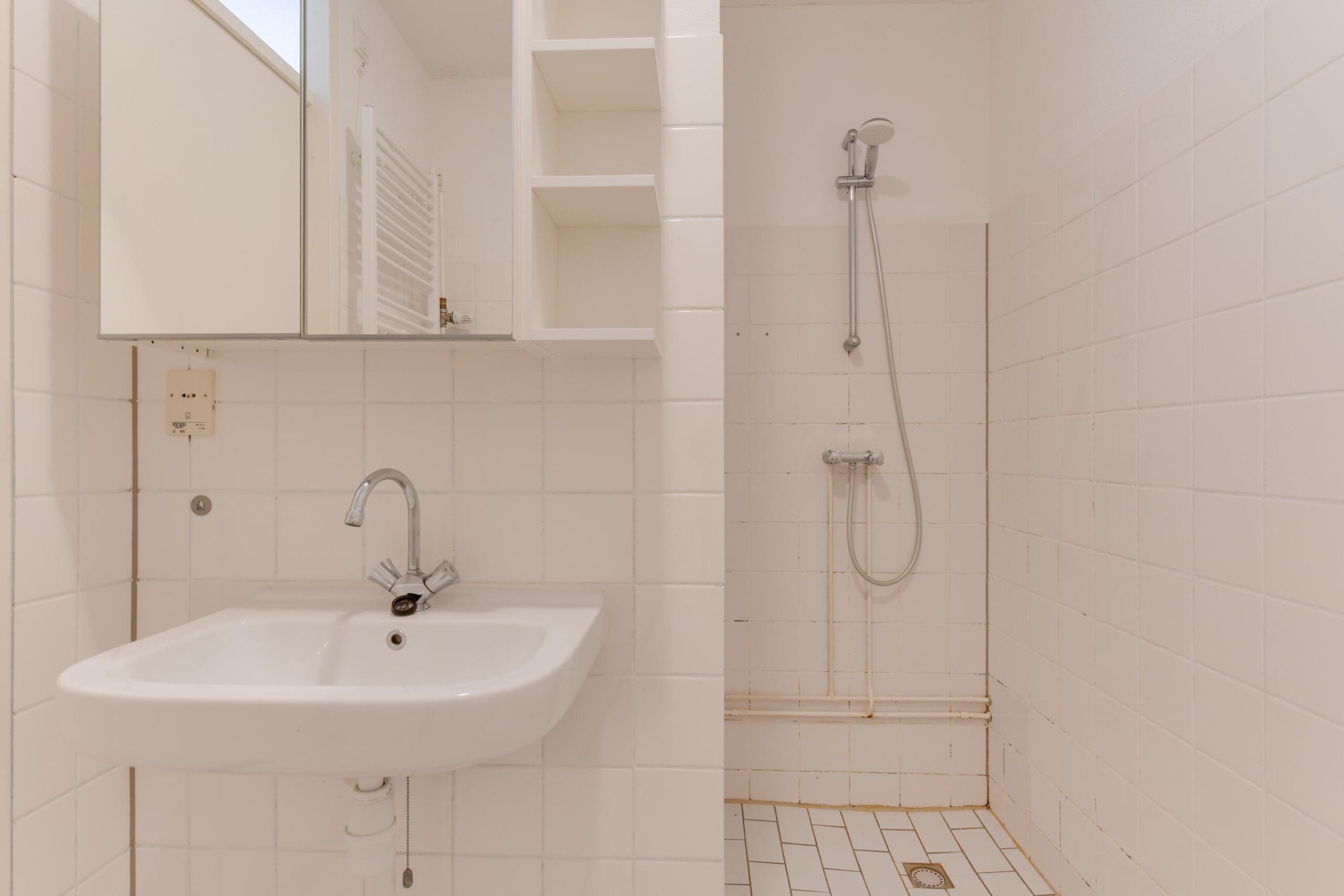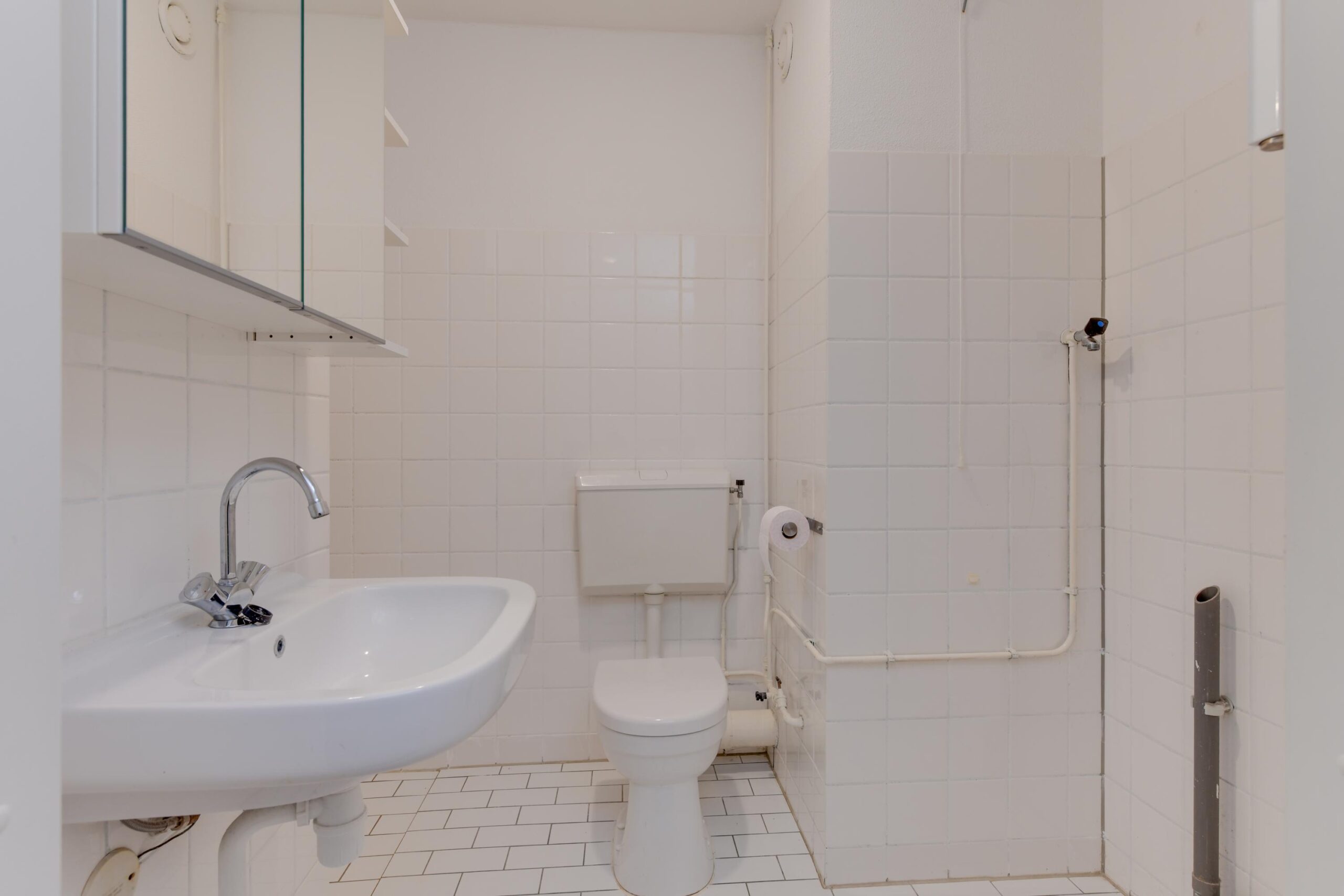 De slaapkamer (ca. 14 m²) is lekker ruim en gelegen aan de galerijzijde. De badkamer (ca. 4 m²) heeft een toilet, douche, wastafel en wasmachine aansluiting.